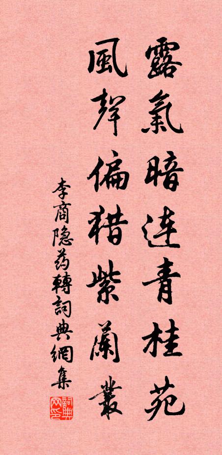 古詩文歷史字典書法欣賞書法字典國語詞典說文解字康熙字典古漢語字典露氣暗連青桂苑,風聲偏獵紫蘭叢李商隱 《藥轉》名句出處出自唐代李商隱的《藥轉》全文:鬱金堂北畫樓東,換骨神方上藥通。露氣暗連青桂苑,風聲偏獵紫蘭叢。長籌未必輸孫皓,香棗何勞問石崇。憶事懷人兼得句,翠衾歸臥繡簾中。名句書法欣賞露氣暗連青桂苑,風聲偏獵紫蘭叢書法作品李商隱名句,藥轉名句名句推薦更作句桃符。佚名《失調名》渥窪騏驥兒,尤異是龍脊杜甫《送李校書二十六韻》寶函鈿雀金鸂鶒,沉香閣上吳山碧溫庭筠《菩薩蠻·寶函鈿雀金鸂鶒》灩灩金船羅袖勸,齊祝壽,比松椿莫蒙《江城子》一聞在目言,不謂今則死梅堯臣《書謝師厚至》北歸會有相逢地,只恐塵埃發易蒼張耒《送三姊之鄂州》精詳隋五教,韌略漢三章陳杰《冶城清談》冰霜盡厄芳心在,自與梅花是雁行艾性夫《庚寅二月朔積雪初霽過和山見雪深堂瑞香盛》吾家本是山陰族王義山《賀新郎(自賀生孫。丙戌西月)》雖則佩觿,能不我知佚名《芄蘭》萬頃涵空月,千帆破浪舟吳芾《游金山二首》良友惜遠別,執手相踟躕汪元量《居擬蘇武四首》玳筵急管曲復終,樂極哀來月東出杜甫《觀公孫大娘弟子舞劍器行》更葵箑難留,薴衣將換王沂孫《齊天樂(四明別友)》豈獨異物乃為害,惡人行劫不待昏鄭獬《淮揚大水》詩詞推薦好事近 春寒繼劉君卿韻三首王惲〔元代〕斗柄轉春城,向暖小桃開徹。不似今年正月,過深冬時節。故將新巧發陰機,春事未容說。且就驅雲風帚,埽西山東歸次瀛上吳融〔唐代〕暖煙輕淡草霏霏,一片晴山襯夕暉。水露淺沙無客泛,樹連疏苑有鶯飛。自從身與滄浪別,長被春教寂寞歸。回首比得朋舊書多索近詩戲作長句陸游〔宋代〕庭下訟訴如堵牆,案上文書海茫茫,酒酸朒冷不得嘗,椎床大叫欲發狂。故人書來索文章,豈知吏責終歲忙。寒龜點絳唇·感興王禹偁〔宋代〕雨恨雲愁,江南依舊稱佳麗。水村漁市。一縷孤煙細。天際征鴻,遙認行如綴。平生事。此時凝睇。誰會憑闌意。次韻四兄蘆晃沖之〔宋代〕碧蘆自愁絕,黃蘆正枯折。宵征雁影孤,墜此橋下月。嘆花 / 悵詩杜牧〔唐代〕自是尋春去校遲,不須惆悵怨芳時。狂風落盡深紅色,綠葉成陰子滿枝。采菱歌鮑照〔南北朝〕要艷雙嶼里。望美兩洲間。褭褭風出浦。容容日向山。玉樓春·瓊酥酒面風吹醒晏幾道〔宋代〕瓊酥酒面風吹醒。一縷斜紅臨晚鏡。小顰微笑盡妖嬈,淺注輕勻長淡淨。手挪梅蕊尋香徑。正是佳期期未定。春來仙掌峰劉邊〔宋代〕銅盤捧露幾何年,渭水秋風淚泫然。已向山中閒袖手,為誰半壁更擎天。出遊郊外七絕王炎〔宋代〕幽鳥共歌春意好,閒花巧笑富愁多。酒徒詩社俱疏隔,如此東郊景物何。