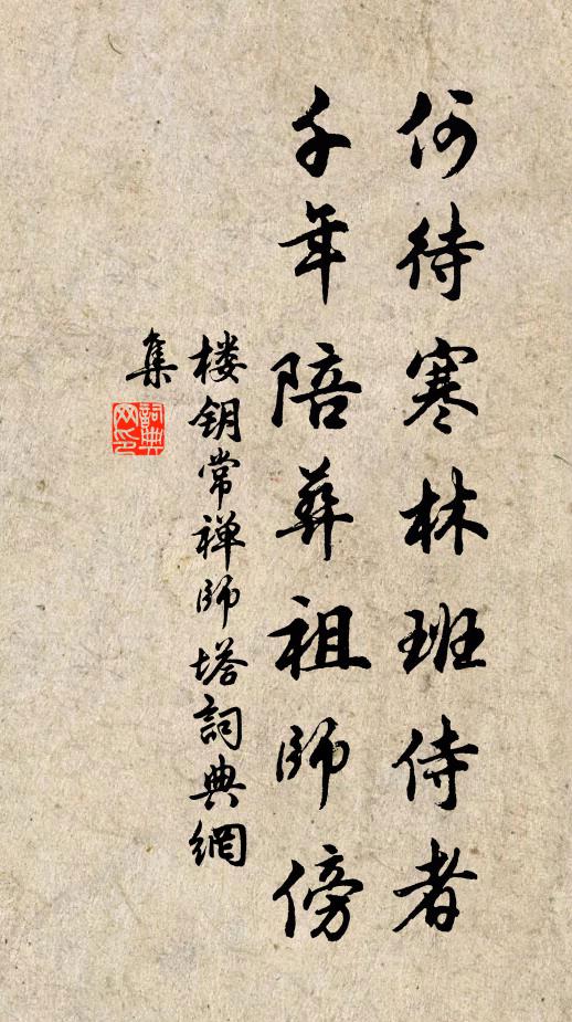 古詩文歷史字典書法欣賞書法字典國語詞典說文解字康熙字典古漢語字典何待寒林班侍者,千年陪葬祖師傍樓鑰 《常禪師塔》名句出處出自宋代樓鑰的《常禪師塔》全文:從來猛虎性堅剛,據石依林死不僵。何待寒林班侍者,千年陪葬祖師傍。名句書法欣賞何待寒林班侍者,千年陪葬祖師傍書法作品樓鑰名句,常禪師塔名句名句推薦寧令漢社稷,變作莽乾坤。芮燁《句》風流誰後人,太史山谷氏葛紹體《送黃尉制司稟議》楚山遠色獨歸去,灞水空流相送回賈島《送羅少府歸牛渚》老經白傳方歸洛,亂鄙黃公始避秦魏野《寄贈華山致仕韓見素》三君同別我,小友不論年項安世《寄羅主管四首》已出郊坰曙色微,田翁指點路分岐戴栩《祈雨二古蹟》老僧拳下死中活,佛與眾生一口吞釋慧開《偈頌八十七首》鼓鍾管磬,肅唱和鳴佚名《郊廟歌辭。享太廟樂章。雍和二章》時哉不可失,浯溪更駸駸陳傅良《行湘喜雨簡劉公度周明叔》涼月送歸思往事,落英飄去起新愁晏幾道《浣溪沙》力戰死社稷,宜享廟貌尊;丈夫貴不撓,成敗何足論陸游《入瞿唐登白帝廟》太白乃吾祖,逸氣薄青雲李綱《水調歌頭(李太白畫象)》清如夷齊鄰,粹若淵騫覿劉子翬《呂居仁惠建昌紙被》更要問端的,天台有石橋釋師範《臨終偈》灰身滅智,豈是丈夫釋道寧《偈六十三首》詩詞推薦退天童上太守吳學士釋正覺〔宋代〕三椽五合不求余,汩汩營營笑拙疏。妄立是非徒喻馬,樂同彼此解觀魚。洗霜骨出山宜瘦。答響神藏谷應虛。莫涴秋來瘦甚而益健戲作陸游〔宋代〕莫笑形羸不自支,清虛正與老人宜。矛頭淅米誰能食,甑里生塵卻自奇。獨釣又逢秋晚後,安眠常到日高時。邇來日西王安石〔宋代〕日西階影轉梧桐,簾卷青山簟半空。金鴨火銷瀋水冷,悠悠殘夢鳥聲中。乞荊浩畫大愚〔唐代〕六幅故牢健,知君恣筆蹤。不求千澗水,止要兩株松。樹下留盤石,天邊縱遠峰。近岩幽濕處,惟藉墨煙濃。又吟酒肆布衣〔唐代〕有形皆朽孰不知,休吟春景與秋時。爭如且醉長安酒,榮華零悴總奚為。和虛齋勸農十詩鄭清之〔宋代〕酡顏醉客玉西東,半濕塵衫上翠空。鄒谷雖寒應解黍,朱車面面是春風。代棘篇路振〔宋代〕伐棘何所山之巔,秋風颾颾刺子丹。折根破柢堅且頑,斸夫趦趄汗污顏。攢鋒束芒趨道還,{上艹下左禾右享}之後園雙松李復〔宋代〕群木喜春妍,凋落寒霜苦。昂藏兩大夫,森然須鬣古。堅姿不可回,正色少媚嫵。清風發好音,和氣琴中語。句釋省念〔宋代〕一言截斷千江口,萬仞峰前始得玄。感詠十解寄呈楊安撫白玉蟾〔宋代〕身如雲樣輕,心似月兮皎。何物堪贈居,一顆安期棗。