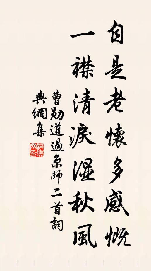 古詩文歷史字典書法欣賞書法字典國語詞典說文解字康熙字典古漢語字典自是老懷多感慨,一襟清淚濕秋風曹勛 《道過京師二首》名句出處出自宋代曹勛的《道過京師二首》全文:都城百雉曉雲空,四塔亭亭倚望中。自是老懷多感慨,一襟清淚濕秋風。名句書法欣賞自是老懷多感慨,一襟清淚濕秋風書法作品曹勛名句,道過京師二首名句名句推薦非積學之所紹江淹《雜三言 鏡論語》石霜山中獨虎,生得三腳驢兒釋慧空《偈十三首》先容不肯收蟠木,高足無從得要津李覯《次韻答陳殿丞見寄》曰余知止足沈約《游沈道士館詩》賦藥才高,題瓊語俊周密《踏莎行》愁心翻覆夢難成,病仆呻吟呼不起李涉《濉陽行》官舍荒涼乏松竹,邊城清晏少文移孫應時《和項平父送別》花枝搖未定,驚顧卻飛去李復《翠碧》盤無兼味慚留客,夢厭多岐不到鄉。姚孝錫《句》花教鶯點檢,柳付風排比白居易《六年春贈分司東都諸公》霜濃手龜坼,日永身罄折樓璹《耕圖二十一首收刈》斜徑順風鳴竹火,飛甍迷眼映松煙釋正覺《投食山家》縱游只卻輸閒客,遍入何嘗問主人邵雍《洛下園池》乃知軒冕徒,寧比雲壑眠於鵠《過凌霄洞天謁張先生祠》生為結髮婚,死為同穴鬼何夢桂《擬古五首》詩詞推薦次韻明仲幽居春來十首劉子翬〔宋代〕豈慚辛苦把漁竿,猶有機心傍釣灘。文定書堂最深穩,何如袖手試觀瀾。青玉案(次賀方回韻)楊無咎〔宋代〕五雲樓閣蓬瀛路。空相望、無由去。弱水渺茫誰可渡。君家徐福,蕩舟尋訪,卻是曾知處。群仙應問來何暮。說與尾犯 寒夜蔣捷〔宋代〕夜倚讀書床,敲碎唾壺,燈暈明滅。多事西風,把齋鈴頻掣。人共語、溫溫芋火,雁孤飛、蕭蕭檜雪。遍闌乾外,殘句:鄰談喧五更黃庭堅〔宋代〕鄰談喧五更。慶長叔招飲一桮,未釂,雪聲璀然。即席走筆楊萬里〔宋代〕酒香端的似梅無,小摘梅花浸酒壺。莫遣南枝獨醒著,一桮聊勸雪肌膚。送丘宗卿帥蜀三首楊萬里〔宋代〕諭蜀宣威百萬兵,不須號令自精明。酒揮勃律天西碗,鼓臥蓬婆雪外城。二月海棠傾國色,五更杜宇說鄉情。少陵南軒松李白〔唐代〕南軒有孤松,柯葉自綿冪。清風無閒時,瀟灑終日夕。陰生古 * ,色染秋煙碧。何當凌雲霄,直上數千尺。王順之得子寄二絕次韻報之晁說之〔宋代〕賓客能談少傳兒,海中仙果得生遲。自今一落人間後,奔雲老驥敢言衰。祀南海神曾豐〔宋代〕赤精炎官兮,神一靈兮幻只。鴻澤厖施兮,神一念兮肧只。上清委照兮,神功行兮簡只。浩劫彌沙兮,神慶休兮綿和陶示周掾祖謝蘇軾〔宋代〕聞有古學舍,竊懷淵明欣。攝衣造兩塾,窺戶無一人。邦風方杞夷,廟貌猶殷因。先生饌已缺,弟子散莫臻。忍飢