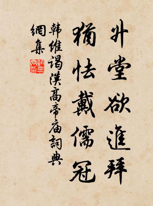 古詩文歷史字典書法欣賞書法字典國語詞典說文解字康熙字典古漢語字典升堂欲進拜,猶怯戴儒冠韓維 《謁漢高帝廟》名句出處出自宋代韓維的《謁漢高帝廟》全文:魂魄應游沛,空嗟廟貌殘。蒼碑火剝裂,畫壁雨蘭乾。帳幙虛風肅,松槐白日寒。升堂欲進拜,猶怯戴儒冠。韓維詩詞大全名句書法欣賞升堂欲進拜,猶怯戴儒冠書法作品韓維名句,謁漢高帝廟名句名句推薦依遲動車馬,惆悵出松蘿王維《別輞川別業》自吳北歸梁,復以盆盎遷梅堯臣《麥門冬內子吳中手植甚繁郁罷官移之而歸不幸》不礙一月流,冰丸走其間劉子翬《十七日集清湖》畫壁蒼茫留水墨,朱欄剝落長莓苔孔武仲《蘇子瞻雪堂》百年生死向中州,千金莫作齊安游張耒《齊安行》悠悠畫船東去也!這思量起頭兒一夜貫雲石《落梅風》積潦斜陽忽射階,夜深穿樹雨還來張鎡《納涼至夜深》一劍已飛去,千年池尚存黃昭《劍池》孟子曾稱伯夷隘,漢人亦議弱翁嚴劉克莊《送游潮州二首》蹴鞠瑤台邊李白《古風其四十六》滿酌湖遙一時酹,問鹹平事已荒涼鄧林《望和靖墓》戲彩堂深翠幕張向子諲《鷓鴣天》從空倒江海,焦槁快一浴張耒《春旱初雨》安閒隨處有,冠蓋莫相望張元乾《冬夜有懷柯田山人四首》摩挲潘叟跨驢圖,便擬移家向此居魏了翁《用大禮楊少卿□韻題馮川莊圖》詩詞推薦送朱放靈一〔唐代〕苦見人間世,思歸洞裡天。縱令山鳥語,不廢野人眠。五絕呈李惟學山長王奕〔宋代〕隻影隨陽逐稻粱,故山元自富蒼筤。孤雄不作山樑夢,晚歲收聲在鳳岡。李良寵示牡丹長句謹賦三首傅察〔宋代〕此檀刻蕊香初吐,紅粉勻葩色正新。孤艷最宜微帶雨,眾芳誰復與爭春。無端應恨風驚葉,不醉卻宜花笑人。從此產難釋妙總〔宋代〕不遲一步,不疾一刻。明眼衲僧,如何會得。婁骨碎身未足酬,一句瞭然超百億。題王氏山居李鹹用〔唐代〕檐有煙嵐色,地多松竹風。自言離亂後,不到鼓鼙中。徑柳拂雲綠,山櫻帶雪紅。南邊青嶂下,時見采芝翁。鹽亭縣永樂山叩雲亭文同〔宋代〕長江合高峰,爽氣左右繞。中流望絕巘,萬丈見木杪。孤寧揭其上,隱隱一拳小。李君令茲邑,邀我升縹緲。是時頌古五首釋慧光〔宋代〕雨洗淡紅桃萼嫩,風搖淺碧柳絲輕。白雲影里怪石露,綠水光中古木清。寄曹州李審言龍圖邵雍〔宋代〕向日所云我,如今卻是伊。不知今日我,又是後來誰。玉樓春吳文英〔宋代〕闌乾獨倚天涯客。心影暗雕風葉寂。千山秋入雨中青,一雁暮隨雲去急。霜花強弄春顏色。相吊年光澆大白。海煙納火禮祀大辰十二首佚名〔宋代〕[黃鐘為角]火星之躔,有燁其光。表於辰位,伏於成方。時和幾稔,仁法用藏。告爾萬民,出納有常。