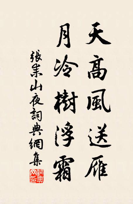 古詩文歷史字典書法欣賞書法字典國語詞典說文解字康熙字典古漢語字典天高風送雁,月冷樹浮霜張耒 《山夜》名句出處出自宋代張耒的《山夜》全文:更漏孤城迥,簾帷靜夜長。天高風送雁,月冷樹浮霜。晚菊差池綠,高桐次第黃。曉來南國夢,不覺寄他鄉。張耒詩詞大全名句書法欣賞天高風送雁,月冷樹浮霜書法作品張耒名句,山夜名句名句推薦四月彼種瓜,五月此賣瓠梅堯臣《五月七日見賣瓠者》睡起不知身是病,踞床年盡水沉煙楊萬里《再病書懷呈仲良》門前露草嫩,極目遨青龍曹勛《山居雜詩九十首》不是先爭特特開,只緣沙際欲春回李彌遜《次韻趙表之道中見梅之作二首》體妙探玄盡涉程,爭如野老異中行釋子淳《頌古一○一首》有個胡兒模樣別陳瓘《蝶戀花》愁邊幸自逢歡伯,清處何須著豓娥葉茵《次中秋不見月韻》休休也,任巫陽來下,未易招魂劉克莊《沁園春》曉聞布榖聲,如在故山時楊萬里《明發白沙灘聞布榖有感》今宵雪乳分龍焙,明日黃泥又馬鞍楊萬里《督諸軍求盜梅州,宿曹溪,呈葉景伯、陳守正》石如鼓形數止十,風雨缺訛苔蘚澀韋應物《石鼓歌》赤日滿天地,火雲成山嶽王維《雜曲歌辭。苦熱行》柳亦何曾絮,都是雲英劉辰翁《八聲甘州(春雪奇麗,未能賦也,因古岩韻誌喜)》似聞君釀醯,巧心出楊柳謝枋得《乞醯》錦江江上探春回,銷盡寒冰落盡梅詹茂光妻《寄遠》詩詞推薦木犀花羅與之〔宋代〕金粟如來澗壑姿,不隨桃李赴春期。江南花品秋居最,何況秋花中絕奇。夢揚州秦觀〔宋代〕晚雲收。正柳塘、煙雨初休。燕子未歸,惻惻清寒如秋。小闌外、東風軟,透繡帷、花蜜香稠。江南遠,人何處,聞雲中唳鶴章孝標〔唐代〕久在青田唳,天高忽暫聞。翩翩縈碧落,嘹唳入重雲。出谷鶯何待,鳴岐鳳欲群。九皋寧足道,此去透絪縕。秋夕排悶十韻陸游〔宋代〕湖海雙歸棹,蓬蒿一病翁。幽居天鏡北,別墅石帆東。雲岫翩孤鶴,煙汀渺斷鴻。一從生白髮,幾見落丹楓?獨立買陂塘(游天台雁盪東湖)劉瀾〔宋代〕御風來、翠鄉深處,連天雲錦平遠。臥遊已動蓬舟興,那在芙蓉城畔。巾懶岸。任壓頂嵯峨,滿鬢絲零亂。飛吟水浣溪沙李處全〔宋代〕宋玉應當久斷腸。滿城風雨盡重陽。年年戲馬憶吾鄉。催促東籬金蕊放,佳人更繡紫萸囊。白衣才到共飛觴。重九會飲萬景樓陸游〔宋代〕粲粲黃花手自持,登高聊答此佳時。纖雲不作看山祟,斗酒聊寬去國思。落日樓台頻徙倚,西風鼓笛倍淒悲。彭城秋興陸游〔宋代〕秋眠怯簟冷,晨飯喜蔬香。寧使衣百結,肯儲錢一囊。杜門雖侷促,負氣尚軒昂。死去真無憾,曾孫似我長。蝶戀花 春正月八日,借榻劉氏樓居,翌日早盧摯〔元代〕冰褪鉛華臨雪徑。竹外清溪,拂曉開妝鏡。銀燭銅壺斜照影。小樓遮斷江雲冷。香透羅幃春睡醒。如許才情,肯到泊分水釋寶曇〔宋代〕櫓聲伊軋訴東風,楚語吳歌落枕中。夜半潮頭隨月上,客帆和夢各西東。