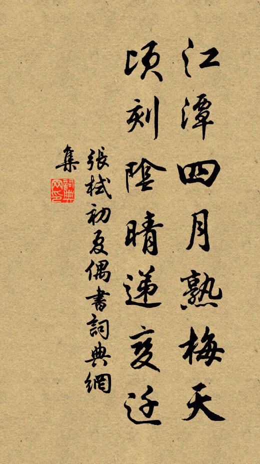 古詩文歷史字典書法欣賞書法字典國語詞典說文解字康熙字典古漢語字典江潭四月熟梅天,頃刻陰晴遞變遷張栻 《初夏偶書》名句出處出自宋代張栻的《初夏偶書》全文:江潭四月熟梅天,頃刻陰晴遞變遷。掃地焚香清畫水,一窗修竹正森然。張栻詩詞大全名句書法欣賞江潭四月熟梅天,頃刻陰晴遞變遷書法作品張栻名句,初夏偶書名句名句推薦頹然白髮雖堪鄙,耐事禁愁卻有餘陸游《讀書》草堂松桂已勝攀向子諲《浣溪沙》明時就養寄淮壖,忽嘆艅艎以柩旋秦觀《陳承事輓詞》雲收天靜酒重斟王吉昌《風入松》理化知無外,烝黎盡可封姚合《和門下李相餞西蜀相公》莫能盡性命,安得更長延韓愈《謝自然詩》封殖雖地宜,屈蟠由巧智蘇頌《和蔣穎叔亳州矮檜》天女來相試,將花欲染衣皎然《答李季蘭》到覺毛骨爽,坐如羽翼沖李建中《題仙都山》西施不及燒殘蠟,猶為君王泣數行皮日休《館娃宮懷古五絕》忔戲笑里含羞,回眸低盼,此意誰能識趙長卿《念奴嬌(席上即事)》天地氣和融霽色,池台日暖燒春光李山甫《寒食二首》況有南窗姬易在,此心那更起纖塵范仲淹《試筆》公卿文學方矛盾,黔首何時見太平劉克莊《丁卯元日十首》皇皇辟君明如日,安用動威偃禾木蘇泂《甘露歌上呈留守門下侍郎》詩詞推薦沈明遠教授用東坡仇池石韻賦予所蓄英石次其曾幾〔宋代〕維南有絲溪,溪石如水綠。瞻相百裡間,抱負一夫足。聲名作災怪,攻取及背腹。在者略無奇,溪神為顰蹙。蠻煙寓興鮑溶〔唐代〕念來若望神,追往如話夢。夢神不無跡,誰使煩心用。魯聖虛泣麟,楚狂浪歌鳳。那言阮家子,更作窮途慟。從趙季仁游洞作羅大經〔宋代〕瑰奇恣搜貝千趾,老仙遺祠邈誰始。後繼述之□□李,異枝同根隆復祉。巨畫更鑱埒前美,紫氣臨關西未止。張留呈茅一霽先生黃庚〔宋代〕前輩凋零盡,如公尚典型。為僧眉獨白,見客眼長青。教子成三俊,傳家有六經。我來問奇字,應許扣柴扃。贊歷代天師第十四代諱慈正字子明白玉蟾〔宋代〕丹鼎能乾活水銀,舉家一念贍貧民。空中動破雲韶樂,白鶴飛來風雨春。採薇圖蔡必薦〔宋代〕西山有薇,美人不移。西山無薇,美人不歸。採薇採薇,山是人非。薇滿西山,不生夷齊。富春屠釋文珦〔宋代〕瓜橋路入屠山寺,山勢蜿蜒似臥龍。長者布金傳幾世,慶真垂跡在前峰。連筒架壑寒泉潔,高閣凌空莫靄重。八十偶成吳錫疇〔宋代〕酒能成病姑停飲,詩怕傷時莫浪吟。客又不來春欲去,一簾花影哢鳴琴。和邵堯夫年老逢春司馬光〔宋代〕年老逢春春莫咍,朱顏不肯似春回。酒因多病無心醉,花不解愁隨意開。荒徑倦遊從碧草,空庭庸掃自蒼苔。相逢石堂陳普〔宋代〕仙佛人言是一家,好分半席共煙霞。廓清摧陷儒家事,不謂青山識正邪。