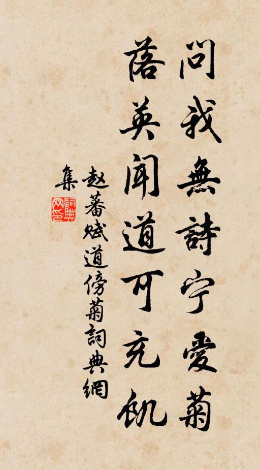 古詩文歷史字典書法欣賞書法字典國語詞典說文解字康熙字典古漢語字典問我無詩寧愛菊,落英聞道可充飢趙蕃 《賦道傍菊》名句出處出自宋代趙蕃的《賦道傍菊》全文:世無元亮亦無詩,菊亦淒涼孰汝知。問我無詩寧愛菊,落英聞道可充飢。趙蕃詩詞大全名句書法欣賞問我無詩寧愛菊,落英聞道可充飢書法作品趙蕃名句,賦道傍菊名句名句推薦晏方秉權,嘗詣宅,延至室佚名《李廙》滴滴盈朝露,暉暉映夕陽王之道《追和李義山賦菊二首》蘭芷生兮芙蓉披。曹丕《詩》閒中氣味真,真處是天民邵雍《閒中吟》漠漠雖難問,蒼蒼尚可憑李處權《謁翁丈四十韻》吳軍雖去怖不歇先秦無名《窮劫曲》筆下何多春草句江西舉老《送是正甫赴南徐幕府》三奏未終天便曉,何人不起望鄉愁武元衡《單于曉角》碧草旋荒金谷路,烏絲重記蘭亭辛棄疾《臨江仙》呂嘉不肯佩銀印,徵側持戈敵百男黃庭堅《和謝公定征南謠》奔趨各異種,倏忽俄萬態歐陽修《讀山海經圖》脈散源分歷幾朝,縱然官宦只卑僚羅隱《寄酬鄴王羅令公五首(前三首一作感德敘懷寄上羅鄴王)》白髮蒼顏心故在,只如當日看山時范成大《贈舉書記歸雲丘》聖人道君子不必相與言,但示以禮樂,禮樂無言莫穿鑿楊簡《金明池》檐外竹、圃中藥陳允平《瑞鶴仙》詩詞推薦送陶氏婦兼寄純甫王安石〔宋代〕雲結川原暗,風連草木萎。遙瞻季行役,正對女傷悲。夢事中千變,生涯老百罹。更慚無道力,臨路涕交頤。題大智院明月巢韓彥古〔宋代〕清風去無塵,白雲來無心。一笑玉溪上,落花流水深。晚興陸游〔宋代〕地荒蓬藋與人齊,侷促何曾厭屋低。村市船歸聞犬吠,寺樓鍾暝送鴉棲。山童新斫朱藤杖,傖婢能醃白苣齊。政欲過陳無已墓晃沖之〔宋代〕以我懷公意,知公待我情。五年三過客,九歲一門生。近訪遺文錄,重經故里行。寄書無鄭尹,誰為葬彭城。次韻楊宰捕蝗宿競岩四首陳造〔宋代〕旱蝗蔽土翳雲空,遙想驅馳逐轉蓬。端坐賴君酬一飽,老顏可諱發慚紅。答友人見寄酒韓偓〔唐代〕雖可忘憂矣,其如作病何。淋漓滿襟袖,更發楚狂歌。別陸務觀章甫〔宋代〕江南江北雖一水,欲濟無由若千里。那知奔走避邊塵,邂逅西津見君子。一飯山間同野僧,花前把酒看張燈。醉吟和子由寒食蘇軾〔宋代〕寒食今年二月晦,樹林深翠已生煙。繞城駿馬誰能借,到處名園意盡便。但掛酒壺那計盞,偶題詩句不須編。忽聞十二時/憶少年佚名〔宋代〕聖明代,海縣澄清。惠化洽寰瀛。時康歲足,治定功成。遐邇賀昇平。嘉壇上,昭事神靈。薦明誠。報本禪雲亭。僧師源畫觀音贊陸游〔宋代〕三世如來同一鬨,大雨料作補陀夢。佛子無財可修供,尺紙寸毫俱妙用。寳纓天冠儼四眾,長年造極筆愈縱。唯師