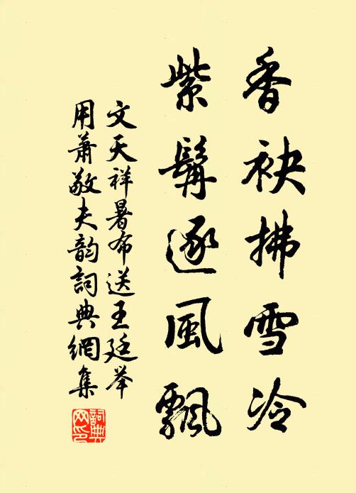 古詩文歷史字典書法欣賞書法字典國語詞典說文解字康熙字典古漢語字典香袂拂雪冷,紫髯逐風飄文天祥 《暑布送王廷舉用蕭敬夫韻》名句出處出自宋代文天祥的《暑布送王廷舉用蕭敬夫韻》全文:高人不煙火,跳出天地窰。掀然立千仞,塊視金與焦。香袂拂雪冷,紫髯逐風飄。摩挲雲冥樹,凱隨群卉凋。但知仙骨輕,不學倒影搖。人間盡描貌,妙不在生綃。揭斗斟天漿,霞衣卻瓊瑤。名句書法欣賞香袂拂雪冷,紫髯逐風飄書法作品文天祥名句,暑布送王廷舉用蕭敬夫韻名句名句推薦反關據槁梧,隤然竟終夕釋文珦《拙叟》列肆又多看不遍,遊人一一把燈行姜夔《觀燈口號》莫言樂國無愁夢,賴把新詩有故情王安石《次韻質夫兄使君同年》驪山御湯殿,歲久玉蓮傾賀鑄《題香社寺平痾湯泉》馬驕珠汗落,胡舞白蹄斜杜甫《秦州雜詩二十首·其三》能醫百病如扶溺馬鈺《蓬萊客 贈馬彥高》移金雁、應是自調,盡寄深情與弦索張翥《蘭陵王 臨川寓舍聞箏》唐虞風順無多毛滂《清平樂》世人爭曲直,苦語費搖撼蘇軾《潁大夫廟(潁考叔也,廟在汝州潁橋)》歸囊一錢盡,足用仍三冬毛滂《汪發強中見遺佳篇筆勢高妙且從僕求詩以歸輒》糲飯胡餅能幾許,不飽皇孫及妃主趙汝鐩《纏頭曲》孰過而改,孰善而遷王柏《挽何無適》最愛丫角羊,艮木之印鄉程珌《新舊句》平生丘壑有真趣,脫口誤與兒輩論李若水《謝劉德謙惠疊翠峰詩》勢來星斗動,路越青冥高李群玉《七月十五夜看月》詩詞推薦春日小園即事十首方回〔宋代〕長憶江湖看雨時,插天掛尾玉龍垂。歸來老手今無用,養小魚蝦掘小池。九日客金陵柴隨亨〔宋代〕菊雨淒淒江露涼,客中無酒對重陽。去年黑髮今年白,不似黃花歲歲黃。贈淨慈主人五首陳造〔宋代〕平時野飯與岩棲,忽向皇都作住持。見說禪和蜂蟻聚,心閒只似瑞岩時。孤興賀朝〔唐代〕晴日暖珠箔,夭桃色正新。紅粉青鏡中,娟娟可憐嚬。君子在遐險,蕙心誰見珍。羅幕空掩晝,玉顏靜移春。江瑟庵中夏釋梵琮〔宋代〕草中得路便藏身,不入他家水牯群。彈指一聲為號令,低頭問訊當殷勤。題米元暉瀟湘圖二首尤袤〔宋代〕淡淡晴山橫霧,茫茫遠水平沙。安得綠蓑青笠,往來泛宅浮家。句楊凌〔唐代〕南園桃李花落盡,春風寂寞搖空枝。(《詩式》)南柯子/南歌子黃庭堅〔宋代〕郭泰曾名我,劉翁復見誰。入廛還作和羅槌。特地干戈相待、使人疑。秋浦橫波眼,春窗遠岫眉。補陀岩畔夕陽遲次韻答晁以道見贈二首蘇籀〔宋代〕骨髓緘藏萬古謀,畔牢愁思不禁秋。常憐屈宋鳴中古,不遇丘軻放一頭。文賦東坡推典麗,簡書西路失歸休。看公兌女余最小孫也慧而夭悼以六言二首劉克莊〔宋代〕性慧於靈照女,年小似善財童。急急之符奪汝,琅琅之音惱翁。