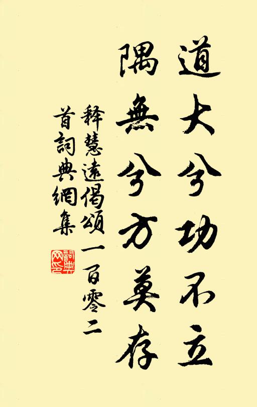 古詩文歷史字典書法欣賞書法字典國語詞典說文解字康熙字典古漢語字典道大兮功不立,隅無兮方莫存釋慧遠 《偈頌一百零二首》名句出處出自宋代釋慧遠的《偈頌一百零二首》全文:道大兮功不立,隅無兮方莫存。跨鰲頭兮歸巨海,挾月角兮出天門。釋慧遠詩詞大全名句書法欣賞道大兮功不立,隅無兮方莫存書法作品釋慧遠名句,偈頌一百零二首名句名句推薦寒峰深虛獨繞盡,鮑溶《懷幽期》君子重出處,兒女多依違柴中行《送許郎中出知漳州》參佐多君子,詞華妙賞音張說《岳州九日宴道觀西閣》大道孤然獨立侯善淵《一葉舟》島瘦郊寒詩是崇,斷然難畫入雲台董嗣杲《閉戶》田荒溪溜入,禾熟雀聲喧歐陽修《陪府中諸官游城南》長條裊裊串紅綃劉子寰《阮郎歸》式遏寇虐,無俾正敗佚名《民勞》豈有白雪駒,舉足無和鑾蘇轍《次韻子瞻送千乘千能》清淨無風天雨已,山前山後且扶藜朱翌《遣興》唐氏源流遠,寄才每間生劉克莊《贈唐谷》種松今世見松老,種菊常年見菊開方回《讀陶集愛其致意於菊者八因作八首八曰松菊》雨來蓴菜流船滑,春後鱸魚墜釣肥皮日休《西塞山泊漁家》又為歌詩以勸之,京師之長於詩者,亦屬而和之韓愈《送楊少尹序》陰重不知天色晚王采《玉樓春》詩詞推薦和周正孺墜馬傷手蘇軾〔宋代〕平生學道已神完,豈復兒童私自憐。醉墜何曾傷內守,色憂當為念先傳。書空漸覺新詩健,把蟹行看樂事全。賣卻非瓊花方岳〔宋代〕舊傳瓊花無與雙,專奇擅美名此邦。江南清夢入詩夜,安得一念令心降。去年騎鶴揚州住,斗酒屢眠雲霧窗。月寒題洛陽縣壁李兼〔唐代〕猾吏畏服,縣妖破膽。好錄政聲,聞於御覽。次韻送程給事知越州王安石〔宋代〕千騎東方占上頭,如何誤到北山游。清明若睹蘭亭月,暖熱因忘蕙帳秋。投老始知歡可惜,通宵豫以別為憂。西歸題印上人關外山水圖釋紹嵩〔宋代〕一源淳樸異山川,一簇人家起暮煙。世亂不妨松偃蹇,客程依舊水潺湲。雲橫新塞遮秦甸,樹蔭澄江入野船。聞說和彭進士秋日游靖居山寺李鹹用〔唐代〕秋山入望已無塵,況得閒遊謝事頻。問著盡能言祖祖,見時應不是真真。添瓶野水遮還急,伴塔幽花落又新。自笑陳彥臣連靜女案判詞王剛中〔宋代〕佳人才子兩相宜,置福端由禍所基。永作夫妻諧汝願,不勞鑽穴隙相窺。次韻單君范行李中諸詩前數章自道後二章為單陳著〔宋代〕心如古井不生瀾,無奈形骸寄兩閒。老境陽春亦風雪,危時明月自江山。琴書有舊聊相與,門戶雖貧未是閒。兒女花石詩十一章鄧肅〔宋代〕三月和風塞太空,天涯海角競青紅。不知花卉何遠近,六合內外俱春容。減字木蘭花高士談〔元代〕西湖睡起。飛絮遊絲春老矣。漲綠涵空。十頃玻璃四面風。時平事少。天與湖山供坐嘯。他日西州。卻怕羊曇感舊