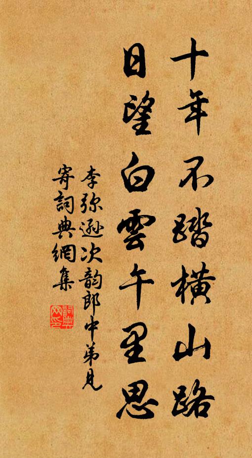 古詩文歷史字典書法欣賞書法字典國語詞典說文解字康熙字典古漢語字典十年不踏橫山路,日望白雲午里思李彌遜 《次韻郎中弟見寄》名句出處出自宋代李彌遜的《次韻郎中弟見寄》全文:十年不踏橫山路,日望白雲午里思。宰木可圍人更老,長鑱猶記共栽時。李彌遜詩詞大全名句書法欣賞十年不踏橫山路,日望白雲午里思書法作品李彌遜名句,次韻郎中弟見寄名句名句推薦呼僮攜小榼,更淮黑貂裘司馬光《雪寒取酒》去百里閒山獨立,跨三州地永平交陳著《長橋望湖》柳花飛滿春歸路,隔江暮雲搖影邵亨貞《齊天樂 乙未暮,錢素庵見和前韻,再歌以謝》霜日炫晴晝,湖光掠眼明楊冠卿《壬寅仲冬晦日同吳監丞游延祥宮延祥蓋和靖所》君不見,錢塘湖,錢王壯觀今已無蘇軾《游靈隱寺,得來詩,復用前韻》心之柔也,以道牧之黃庭堅《畫牧牛贊》君詩信入神,我眼本無翳陳造《次韻胡學長喜雨》記彩鸞別後,青驄歸去,長亭路、芳塵起劉鎮《水龍吟(丙戊清明和章質夫韻)》世人重藝不重義,每以好奇夸好事湯炳龍《題晉王大令保母帖》宇宙誰開闢?江山此郁盤!登臨今古用,風俗歲時觀孟浩然《盧明府九日峴山宴袁使君張郎中崔員外》遙憐鍾阜諸峰好,閒鎖行宮九十年劉克莊《真州北山》枯槁蒙膏潤,誰非喜雨人劉克莊《立春二首》菊觴奉親壽,柳色上儒衣薛師石《喜葉謙夫歸》行藏也須在我,笑晉人為菊,出岫方濃張炎《瑤台聚八仙(為焦雲隱賦)》此地幾經人聚散,只今王謝獨名存李建勛《游棲霞寺》詩詞推薦贈楊德祖王粲〔魏晉〕我君餞之。其樂泄泄。贈景福順長老二首〈並序〉蘇轍〔宋代〕轍幼侍先君,聞嘗游廬山,過圓通,見訥禪師,留連久之。元豐五年,以譴居高安,景福順公不遠百里惠然來訪,青杏兒 詠菊姬翼〔元代〕春夏竟芬芳。天憐此秘惜藏光。紛華落盡方開展,疏叢淺淡,孤標冷落,獨傲秋霜。好在水雲鄉。無人知、見又何報任少卿書 / 報任安書司馬遷〔兩漢〕太史公牛馬走司馬遷,再拜言。 少卿足下:曩者辱賜書,教以慎於接物,推賢進士為務,意氣勤勤懇懇。若望醉落魄/一斛珠曾覿〔宋代〕情深恨切。憶伊誚沒些休歇。百般做處百廝愜。管是前生,曾負你冤業。臨岐不忍匆匆別。兩行珠淚流紅頰。關山鄉思李覯〔宋代〕人言落日是天涯,望極天涯不見家。已恨碧山相阻隔,碧山還被暮雲遮。新居成茂恭以詩見賀次韻奉酬喻良能〔宋代〕子美堂工始上元,斷手乃在寶應年。顧我無能為杜役,有此屋廬差不難。欲移修竹梅花亞,暮靄朝煙迷上下。室遠宮詞二首徐照〔宋代〕睡眼蒙茸帶宿酲,起來階下探春晴。滿身花露聽鶯久,禁鼓重新打六更。余行年七十有七腰圍頓減殆不勝衣齒亦搖脫可姜特立〔宋代〕衰鬢已凋淵岳,便腹頓減邊韶。陋姝何必豐臉,爛飯須要長腰。過裴舍人故居劉長卿〔唐代〕慘慘天寒獨掩扃,紛紛黃葉滿空庭。孤墳何處依山木,百口無家學水萍。籬花猶及重陽發,鄰笛那堪落日聽。書幌