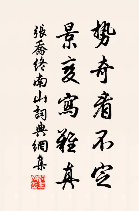 古詩文歷史字典書法欣賞書法字典國語詞典說文解字康熙字典古漢語字典勢奇看不定,景變寫難真張喬 《終南山》名句出處出自唐代張喬的《終南山》全文:帶雪復銜春,橫天占半秦。勢奇看不定,景變寫難真。洞遠皆通岳,川多更有神。白雲幽絕處,自古屬樵人。張喬詩詞大全名句書法欣賞勢奇看不定,景變寫難真書法作品張喬名句,終南山名句名句推薦我今不飲非不飲,心月皎皎長孤圓蘇軾《謝蘇自之惠酒》歸來已秋節,登覽恍依然孔武仲《湓城東》蔚彼南山,有松其猗王令《松休操》客愁重、時聽蕉寒雨碎,淚濕瓊鍾吳文英《高山流水·素弦一一起秋風》兒童蠻語,生怕閏黃楊,爭左角,夢南柯,萬事從今省王寂《驀山溪 退食感懷》結兒綴著小符兒佚名《阮郎歸》東坡兄弟來雖晚,折箭堪除蝕月蛙黃庭堅《和蒲泰亨四首》紅旌翠節下蓬宮向子諲《桂殿秋》東風滿帆來,五兩如弓弦獨孤及《下弋陽江舟中代書寄裴侍御》泉清韻磬遠,要樾琅玕密俞烈《題淨梵院清虛堂》應懷舊居處,歌管隔牆聽齊己《寄歸州馬判官》吾儂心事憑誰訴劉辰翁《金縷曲(壽李公謹同知)》被春寒無賴,不放全開,才半吐,翻與留連妙處丘崈《洞仙歌》道傍蕭蕭木葉下,天風又辦明朝霜姚勉《道中即事》炎嶺當時奏曲,風流命、樂府名傳佚名《滿庭芳》詩詞推薦感事示兒孫陸游〔宋代〕人生讀書本餘事,惟要閉門修孝悌。畜豚種菜養父兄,此風乃可傳百世。我聞長安官道傍,至今人指魏公莊。北方早行二絕鄭剛中〔宋代〕頳肩攜擔又催程,雨許孤燈照壁青。破縣殘更誤傳曉,馬行十里見明星。出峽泊宜昌府(四首選一)張問陶〔清代〕萬山回首太陵(山旁)嶒,此日餘生問最能。送盡奇峰雙眼豁,江天空闊看彝陵。賜劉能真三首宋高宗〔宋代〕簡易高人道,崇玄性自真。身常居太極,心已遠凡塵。玉階辭榮祿,瑤台役鬼神。辛勤三十載,羨爾道心淳。合江亭檻前多高竹不見遠岸花客命翦之感而成詠呂溫〔唐代〕吉凶豈前卜,人事何翻覆。緣看數日花,卻翦凌霜竹。常言契君操,今乃妨眾目。自古病當門,誰言出幽獨。讀淵明傳高吉〔宋代〕誰為棲棲魯孔丘,轍環天下果何求。愛人學道行吾志,束帶何傷見督郵。郊廟歌辭。禪社首樂章。靈具醉佚名〔唐代〕靈具醉,杳熙熙。靈將往,眇禗禗。顧明德,吐正辭。爛遺光,流禎祺。秋夜待月李石〔宋代〕白毫光里玉魂飛,留看常娥醉魄迷。一任檐牙沸蝙蝠,忍將明鏡照狐狸。六月二十日夜渡海蘇軾〔宋代〕參橫斗轉欲三更,苦雨終風也解晴。雲散月明誰點綴,天容海色本澄清。空餘魯叟乘桴意,粗識軒轅奏樂聲。九死寄筠陽趙紫芝推官徐照〔宋代〕府後岩巒眾,何時訪古仟。井甘鄰室共,鍾遠雪風傳。病去茶難廢,詩多石可鐫。蜀江春未動,猶得緩歸船。