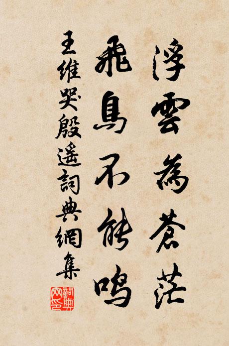 古詩文歷史字典書法欣賞書法字典國語詞典說文解字康熙字典古漢語字典浮云為蒼茫,飛鳥不能鳴王維 《哭殷遙》名句出處出自唐代王維的《哭殷遙》全文:人生能幾何,畢竟歸無形。念君等為死,萬事傷人情。慈母未及葬,一女才十齡。泱漭寒郊外,蕭條聞哭聲。浮云為蒼茫,飛鳥不能鳴。行人何寂寞,白日自淒清。憶昔君在時,問我學無生。勸君苦不早,令君無所成。故人各有贈,又不及生平。負爾非一途,慟哭返柴荊。名句書法欣賞浮云為蒼茫,飛鳥不能鳴書法作品王維名句,哭殷遙名句名句推薦百工聖人為,此最功不薄王安石《和聖俞農具詩十五首其十一錢鎛》擬登華頂去,幽徑旋鋤荒釋文珦《雙溪寺》風波平地自誰始,一但從知百人和陳造《寄鄭良佐》瀹茗嘗深鼎,臨書厭短檠張鎡《對雪》晚涼生玉井,新暑避煙松錢起《開元觀遇張侍御》嘉木有餘蔭,鳴禽多好音釋文珦《賦海上人吾廬》佇希御史雨,汛掃靖幅員趙孟堅《詠史贈王侍御》逍遙閣下暮煙生,相對無言坐復行白玉蟾《贈藍琴士三首》瞥然悟得長生路長筌子《青玉案》藩籬落日鳥雀鬧,江湖西風鴻雁高章甫《簡唐先生谷》溪響答棋聲,雲影入杯酌唐仲友《續八詠萬象出新奇》江河水稽天,發源乃涓流陸游《老學庵自規》望湖樓上暗香飄蘇軾《臨江仙(疾愈登望湖樓贈項長官)》菰黍團雲白,菖花剪玉長崔敦詩《淳熙八年端午帖子詞太上皇后合六首》芙蕖元不植高原,插向紅爐色更鮮李流謙《戲贈智淵師二偈》詩詞推薦皇女周漢國端孝公主輓詩二首劉克莊〔宋代〕甥館恩通內,妃塋詔卜鄰。來應自仙佛,去尚戀君親。望送龍綃濕,封崇鶴表新。不能秉彤管,羞愧作詞臣。出郊勸耕因游吳山清隱虞儔〔宋代〕第一林泉得縱觀,春風隨步著欄乾。山園梅雪千株在,門納湖光十里寬。水上濕紅雲片段,亭前鮮碧玉檀欒。主人和張監游終南張說〔唐代〕宿懷終南意,及此語云峰。夜聞竹澗靜,曉望林嶺重。春煙生古石,時鳥戲幽松。豈無山中賞,但畏心莫從。永明樂 二謝朓〔南北朝〕民和禮樂富。世清歌頌徽。鴻名軼卷領。稱首邁垂衣。山行葉茵〔宋代〕青山不識我姓字,我亦不識青山名。飛來白鳥似相識,對我對山三兩聲。金陵懷古寇準〔宋代〕極目望吳甸,野煙凝亂流。夜來榆塞雁,叫斷石城秋。舊苑荒餘草,平川半古丘。遲遲獨回首,落日一蟬幽。楚竹吟酬盧虔端公見和湘弦怨孟郊〔唐代〕握中有新聲,楚竹人未聞。識音者謂誰,清夜吹贈君。昔為瀟湘引,曾動瀟湘雲。一叫鳳改聽,再驚鶴失群。江花石帆夏日陸游〔宋代〕短棹飄然信所之,茶園漁市到無時。風從苹末蕭蕭起,月過花陰故故遲。蓴菜煮羹吳舊俗,竹枝度曲楚遺辭。頗聞點絳唇(妙香檐卜)王十朋〔宋代〕毗舍遙遙,異香一炷馳名久。妙香稀有。鼻觀深參透。問訊東來,知□誰先後。稱仙友。十花為偶。近有江西守。洞仙歌朱彝尊〔清代〕苹洲小棹,約兜娘相共。豈意錢塘片帆送。逢故人江上,一路看山,寧料我過了惡潑靈洞。東甌城下泊,孤嶼中流