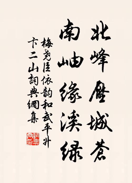 古詩文歷史字典書法欣賞書法字典國語詞典說文解字康熙字典古漢語字典北峰壓城蒼,南岫緣溪綠梅堯臣 《依韻和武平升卞二山》名句出處出自宋代梅堯臣的《依韻和武平升卞二山》全文:北峰壓城蒼,南岫緣溪綠。誰知昔人游,尚想叢桂馥。鳥獸安可群,呼鳴自為族。儻聞羨門術,一躡塵外躅。名句書法欣賞北峰壓城蒼,南岫緣溪綠書法作品梅堯臣名句,依韻和武平升卞二山名句名句推薦頻想玉關人,愁臥金閨里劉希夷《春女行》平泉公子傷春處,唯有東風吹草芽陶弼《題獻花鋪》算橘租菱小市嘩,堰頭橋尾約千家方回《過長安市》感綠驚紅,顰煙啼月,長是為春消黯高觀國《喜遷鶯》知誰健,且茹芝商嶺,飲菊胡潭趙以夫《沁園春》一花八十品,秋風巧於春徐照《種菊》歸來華發蒼顏辛棄疾《清平樂》焦城有屋仲子築,它日能來相往還晁補之《示張仲原秀才二首一》情易感,恨難醒韓玉《賀新郎》此行歸來上親壽,桂枝滿把香滿袖楊萬里《送胡聖聞入太學》夷齊猶餓死,誰復哀屈平曹勛《人生不長好》龍種殊常,照人眉宇,似汝陽端秀晁端禮《醉蓬萊》醉里狂歌,花前起舞,拚罰金杯百曾覿《念奴嬌》敲門聞剝啄,開緘佩謙牧趙善括《和邦承所贈中隱古風》太液池頭水浸雲,綠荷搖曳露華新王仲修《宮詞》詩詞推薦送郢州郎使君韓翃〔唐代〕千人插羽迎,知是范宣城。暮雪楚山冷,春江漢水清。紅鮮供客飯,翠竹引舟行。一別何時見,相思芳草生。和胡仲方攝縣喜雨三首釋寶曇〔宋代〕雨入黃梅故弄晴,群龍鬚我一投誠。此無盡藏君為主,大貝明珠我得傾。春日作李中〔唐代〕和氣來無象,物情還暗新。乾坤一夕雨,草木萬方春。染水煙光媚,催花鳥語頻。高台曠望處,歌詠屬詩人。戊戌正月二日雪作二首楊萬里〔宋代〕雪與新春作伴回,搗霜為片雹為埃。只愁雪虛梅無柰,不道梅花領雪來。和陳君儀讀太真外傳五首黃庭堅〔宋代〕朝廷無事君臣樂,花柳多情殿閣春。不覺胡雛心暗動,綺羅翻作墜樓人。百字令 儒宗王玠〔元代〕聖人傳道,執其中、妙在惟精惟一。放則周流彌六合,卷則退藏於密。格物致知,正心誠意,靜里包皇極。居仁由虞美人(詠荼蘼)馮時行〔宋代〕東君已了韶華媚。未快芳菲意。臨居傾倒向荼。十萬寶珠瓔珞、帶風垂。合歡翠玉新呈瑞。十日傍邊醉。今年花好鄂渚送白舍人赴杭州朱慶餘〔唐代〕豈知鸚鵡洲邊路,得見鳳凰池上人。從此不同諸客禮,故鄉西與郡城鄰。湖山雜賦陸游〔宋代〕不到梅山二十霜,望中常似隔他鄉。一杯甖粟紗燈下,最憶初寒宿上方。和之美舟行雜詩八首罾魚者司馬光〔宋代〕弱絛絓輕絲,盡日寒溪側。護少近知無,溪魚皆爾識。