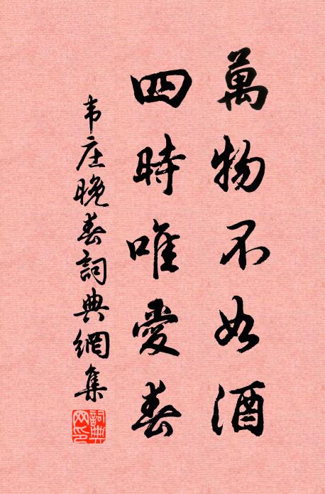 古詩文歷史字典書法欣賞書法字典國語詞典說文解字康熙字典古漢語字典萬物不如酒,四時唯愛春韋莊 《晚春》名句出處出自唐代韋莊的《晚春》全文:花開疑乍富,花落似初貧。萬物不如酒,四時唯愛春。峨峨秦氏髻,皎皎洛川神。風月應相笑,年年醉病身。韋莊詩詞大全名句書法欣賞萬物不如酒,四時唯愛春書法作品韋莊名句,晚春名句名句推薦我慚塵垢眼,見此瓊瑤英白居易《潯陽三題。東林寺白蓮》城中蓮子買將歸,未問嘗新早與遲楊萬里《食蓮子三首》守得烏薪暖氣回,夜深寒重易成灰釋智愚《冬夜示俊侍者》好詩好雨適相逢,抖盡襟懷要折衝曹彥約《橫舟弟相別年餘阻一江之水彼此皆病未有可會》秋日更山行,朝朝入畫屏項安世《二十二日山行》男兒藝若是,會合值明公齊己《送人下第東歸,再謁舊主人》昔去限霄漢,今來睹儀形高適《遇沖和先生》玉雪兩三枝劉敏中《菩薩蠻 次解安卿韻》從者皆騎白鳳飛佚名《採桑子》小詩何必諸公誦,自向閒時詠太平劉克莊《雜興十首》仕官守鄉國,出入奉家庭蘇轍《送家定國朝奉西歸》子不稅冕去,王將以袞歸劉克莊《挽參與蔡公三首》遠州太守蓬山客,來過盧家尋怪石梅堯臣《胡公疏示祖擇之盧氏石詩和之》青嶂環孤村,綠波溢橫堤陸游《入秋遊山賦詩略無闕日戲作五字七首識之以野》楓林緣楚塞,水驛到湓城李嘉祐《送裴員外往江南》詩詞推薦楊花吳錫疇〔宋代〕飛舞隨春去不停,空條留得罩郵亭。狂心未肯沾泥死,猶作輕浮水上萍。梅陸游〔宋代〕若耶溪頭春意慳,梅花獨秀愁空山。逢時決非桃李輩,得道自保冰雪顏。僊去要令天下惜,折來聊伴放翁閒。人中謝宣賜金襴釋慧開〔宋代〕不是雞足流傳,亦非黃梅分付。九得天上降來,千載臣僧一過。中興佛祖宗風,群魔悉皆驚怖。祝延聖壽無疆,志郁孤台高翥〔宋代〕十年重上郁孤台,帶得江湖白髮來。滿眼青山舊相識,晚鴉群噪莫驚猜。石頭田方回〔宋代〕晝欲求一淘,有灶無灶煙。夜欲求一榻,有屋無屋椽。歷歷數百里,無人居道邊。問言何至此,我亦為恍然。江西曉行戴表元〔宋代〕漸漸路可識,紛紛山轉多。數雞啼遠塢,一鳥起滄波。藤杖濕雲石,筍鞋濃露莎。何人尚高臥,層構著煙蘿。出使在途所騎馬死改乘肩輿將歸長安偶詠…寄太原李相公白居易〔唐代〕驛路崎嶇泥雪寒,欲登籃輿一長嘆。風光不見桃花騎,塵土空留杏葉鞍。喪乘獨歸殊不易,脫驂相贈豈為難。并州悲歌五首方回〔宋代〕三十年前樂事饒,閒身無事暑初銷。攜琴岳寺延秋月,吹笛江樓過夜潮。自倚豪狂詩句疾,豈虞離亂鬢毛凋。故人鷓鴣天黃夫人〔宋代〕先自春光似酒濃。時聽鶯語透簾櫳。小橋楊柳飄香絮,山寺緋桃散落紅。鶯漸老,蝶西東。春歸難覓恨無窮。侵階丘母太碩人臧氏輓詩二首楊萬里〔宋代〕行樂潘慈母,榮封衛碩人。金花五色誥,雨葉六番春。白露凋萱慘,青山拱木新。九齡真上壽,一子更名臣。
