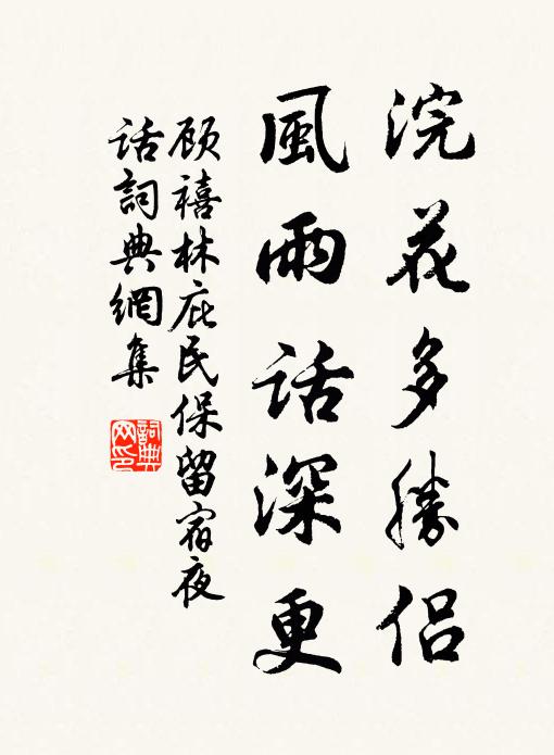 古詩文歷史字典書法欣賞書法字典國語詞典說文解字康熙字典古漢語字典浣花多勝侶,風雨話深更顧禧 《林庇民保留宿夜話》名句出處出自宋代顧禧的《林庇民保留宿夜話》全文:蹤跡忘疏密,情懷歷晦明。攜琴時一至,倒屣輒相迎。枕發中郎秘,尊余北海酲。浣花多勝侶,風雨話深更。顧禧詩詞大全名句書法欣賞浣花多勝侶,風雨話深更書法作品顧禧名句,林庇民保留宿夜話名句名句推薦形勢中朝壯,衰離偽境多楊冠卿《壬午雜詩》道途險易人佚勞,俄頃諮詢無不到鄭俠《上曹大夫》吹亂眾紅還復整,海棠卻不怕春風楊萬里《曉寒二首》日月相期盡,山川獨去遙張蠙《送友人赴涇州幕一作送李中丞再赴虔州》懸池的的停華露,偃蓋重重拂瑞雲張說《遙同蔡起居偃松篇》殘膏許沾丐,繼晷欣窮年楊冠卿《謝人惠油炭》飈風折暮草沈約《梁甫吟》一朝隨狂風,殆不如土苴杜范《龔叔虎秋實堂》戶庭歸槳回南浦鑒堂《菩薩蠻(冬)》長乾龍老長龍孫,竹里陰陰鎖晝雲陳舜俞《竹雲洞》春風桃李一場夢,夜月江山千古情吳龍翰《行春次俞兄韻》歸來紫陌東頭,金釵換酒消愁晏幾道《清平樂》山田欲生煙,旱氣亦可已方岳《夜聞雨用誠齋新涼韻》長歌激古風,自立一門戶戴復古《祝二岩》水木晚尤秀,風煙晴更和司馬光《清明後二日同鄰幾景仁次道中首興宗完秉國如》詩詞推薦愁倚闌令·花陰月晏幾道〔宋代〕花陰月,柳梢鶯。近清明。長恨去年今夜雨,灑離亭。 枕上懷遠詩成。紅箋紙、小砑吳綾。寄與征人教念遠,莫漁家傲某邑妓〔宋代〕十月小春梅蕊破。酬河中杜侍御重寄許渾〔唐代〕五色如絲下碧空,片帆還繞楚王宮。文章已變南山霧,羽翼應摶北海風。春雪預呈霜簡白,曉霞先染繡衣紅。十千戊申年七夕五絕劉筠〔宋代〕伯勞東翥燕西飛,又報黃姑織女期。天帝聘錢還得否,晉人求富是虛辭。醉書陸游〔宋代〕半年愁病劇,一雨喜涼新。稍與藥囊遠,初容酒醆親。浩歌驚世俗,狂語任天真。我亦輕餘子,君當恕醉人。端平二年端午帖子詞貴妃閣洪咨夔〔宋代〕佩襲芳蘭碧,釵明寶篆紅。深宮三十六,同被二南風。瑞香花胡仲弓〔宋代〕生處多應散紫芝,清香端的與梅期。梅花剛被人描畫,卻是清香人不知。蝶李建勛〔唐代〕粉蝶翩翩若有期,南園長是到春歸。閒依柳帶參差起,困傍桃花獨自飛。潛被燕驚還散亂,偶因人逐入簾幃。晚來送遜監淮西酒並示諸任二首蘇轍〔宋代〕淮西留滯昔經年,唯有諸任時往還。炊黍留賓不嫌陋,借書度日免長閒。歸來潩水無水問,夢繞伊家古檜間。二老宿長湖尾鄧深〔宋代〕古木侵沙路,柴門引竹籬。山低秋水闊,天遠夕陽遲。杳杳來鴻雁,翩翩下鷺鶿。漁舟何處宿,橫笛未休吹。
