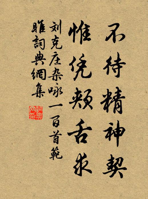 古詩文歷史字典書法欣賞書法字典國語詞典說文解字康熙字典古漢語字典不待精神契,惟憑頰舌求劉克莊 《雜詠一百首范雎》名句出處出自宋代劉克莊的《雜詠一百首范雎》全文:不待精神契,惟憑頰舌求。莫年薦燕客,差勝似穰侯。劉克莊詩詞大全名句書法欣賞不待精神契,惟憑頰舌求書法作品劉克莊名句,雜詠一百首范雎名句名句推薦湖上軒牖無不好,何須抵死揀名園楊萬里《上已同沈虞卿、尤延之、王順伯、林景思游湖》未復中原近守淮,前朝該輔只時來周必大《答胡季亨》坐愁湖陽水李白《寄遠其四》東瀛濯劍有書還,我返自崖君去矣 * 《七古送縱宇一郎東行》十年蕭散住林間,只是幽居不是閒陸游《親舊或見嘲終歲杜門戲作解嘲》只知意在鉤頭,不覺眼中著屑釋智遇《玄沙和尚贊》湘湖煙雨長菁絲,菰米新炊滑上匙陸游《漁父》凜然風埃外,餘子避英爽張栻《過乖崖堂》玉老田荒,心事已遲暮張炎《祝英台近(與周草窗話舊)》謝客才為別,陶公已見思李端《贈岐山姜明府》孤城小驛,斷角殘鍾黃升《行香子(梅)》午窗歸夢無人喚,銀葉龍涎香漸銷胡仔《春寒》跡幽青蘿徑,思絕孤霞岑錢起《游輞川至南山,寄谷口王十六》寄住汝南懷嶺南,五年一醉久猶酣蘇轍《寒食二首》腹中驚怪有新姜,元是江南經宿食姜夔《契丹風土歌》詩詞推薦山中述懷姚合〔唐代〕為客久未歸,寒山獨掩扉。曉來山鳥散,雨過杏花稀。天遠雲空積,溪深水自微。此情對春色,盡醉欲忘機。十二月初六日龜藏夜有感舒岳祥〔宋代〕厲厲歲於邁,慄慄風向遒。老驥倦長坡,臥樵如罷牛。時時一長呈,慚與螻蟻儔。高鴻志萬里,矰繳非所憂。胡為過易簡彥從趙蕃〔宋代〕雨從筍怒長,春雨陰暗成。關門有餘暇,散帙不妨清。從仕亦何好,隱居無用名。悠然會心處,便欲寄吾生。白水道間趙蕃〔宋代〕一源曲折幾成橋,稻隴蔬畦高下澆。水碓暗鳴蛙吠草,綠雲亂點鷺侵苗。誰雲斗粟可相挽,到處佳山如見招。東畝長相思周邦彥〔宋代〕好風浮,晚雨收,林葉陰陰映鷁舟,斜陽明倚樓。黯凝眸,憶舊遊,艇子扁舟來莫愁,石城風浪秋。送景玄師東歸劉禹錫〔唐代〕東林寺里一沙彌,心愛當時才子詩。山下偶隨流水出,秋來卻赴白雲期。灘頭躡屐挑沙菜,路上停舟讀古碑。想到錢塘旅舍陳允平〔宋代〕雲山千萬疊,身事恨悠悠。客鬢秋風急,鄉心夜雨愁。蛩鳴鄰寺壁,雁過隔湖樓。目送千帆遠,長江空自流。新秋以窗里人將老門前樹欲秋為韻作小詩陸游〔宋代〕立朝紹興間,猶及見諸老。魂夢不可逢,丘墳閉秋草。送林宗配雷州(一作送王棼流雷州)郎士元〔唐代〕昨日三峰尉,今朝萬里人。平生任孤直,豈是不防身。海霧多為瘴,山雷乍作鄰。遙憐北戶月,與子獨相親。送崔判官使太原武元衡〔唐代〕勞君車馬此逡巡,我與劉君本世親。兩地山河分節制,十年京洛共風塵。笙歌幾處胡天月,羅綺長留蜀國春。報主