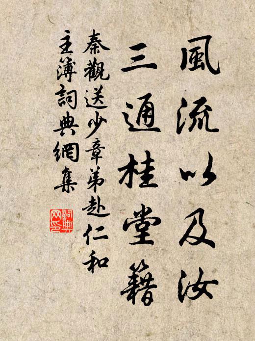 古詩文歷史字典書法欣賞書法字典國語詞典說文解字康熙字典古漢語字典風流以及汝,三通桂堂籍秦觀 《送少章弟赴仁和主簿》名句出處出自宋代秦觀的《送少章弟赴仁和主簿》全文:我宗本江南,為將門列戟。中葉徙淮海,不仕但潛德。先祖實起家,先君始縫掖。議郎為名士,余亦忝詞客。風流以及汝,三通桂堂籍。汝弱不好弄,文章有風格。久從先生游,術業良未測。武林一都會,山水富南國。下有賢別駕,上有明方伯。干將入砥礪,騕褭就銜勒。勿矜孔鸞姿,不樂棲枳棘。吳中多高士,往往寄老釋。辨才雖物化,參寥猶夙昔。投閒數訪之,可得三友益。少來輕別離,老去重乖隔。念汝遠行役,惘惘意不懌。道山雖雲佳,久寓有飢色。功名已絕意,政苦婚嫁迫。終從大人議,稅駕邗溝側。追蹤滿兩疏,父子老阡陌。名句書法欣賞風流以及汝,三通桂堂籍書法作品秦觀名句,送少章弟赴仁和主簿名句名句推薦炳煥文中虎,玲瓏席上珍王之道《次韻劉春卿書懷》雁疏臨鄠杜,蟬急傍瀟湘唐彥謙《紅葉》古意為師復,清風尋我來石揚休《謝文瑩師攜琴見訪》硬黃新染香如蠟,從此書堂不閉廚張鎡《虎斑貓》酌我紫金盞,醉此紅玉蕤方岳《小集垂絲海棠下》切磨三友益,終始一交情蘇頌《國史龍圖侍郎宋次道輓辭五首》縑緗羅幾格,無限有奇書文同《李堅甫淨居雜題一十三首書齋》嶺谷高低明野火,村墟遠近起炊煙陸游《暮秋》昔元城、一生清峭,南都高臥堅壁王邁《摸魚兒(閩漕王幼學作碧灣丹嶂堂,歌此詞,以墨本見寄,依韻和之)》江清寒照動,山迥野雲秋戴叔倫《李大夫見贈因之有呈》曉霜披瓦月上軒,枕夢不成雁聲續王令《短謠》詩從宿世悟,法為本師傳李嘉祐《送 * 上人歸湖州》文章吞時英,光荒瞻星降梅堯臣《三和寄潘歙州》人疑游面市,馬似困鹽車李商隱《喜雪》多情自古傷離別,更那堪冷落清秋節!柳永《雨霖鈴·寒蟬淒切》詩詞推薦次韻題秋崖方岳〔宋代〕秋崖何嘗與人絕,渠自胸中欠風月。齊雲落星吾所無,草木深幽終是別。桂花正開山氣清,人間無路爭崢嶸。虛皇掛劍台張耒〔宋代〕上國歸來歲月深,悲嗟脫劍掛高林。欲知不負徐君意,便是當年讓國心。頌古十七首釋大觀〔宋代〕自是兵家貴伐謀,鏖鋒擒敵未為優。沈沈刁斗三更月,玉帳威行紫塞秋。夜集作離合詩謝惠連〔南北朝〕四坐宴嘉賓。一客自遠臻。九言何所戒。十善故宜遵。示如法禪人釋原妙〔宋代〕如如不動法中王,舉足無非是道場。不到水窮雲盡處,爭知覿面是檀郎。再過吳江贈僧了洪葉適〔宋代〕回飈掩夾浦,勢與墨樓頏。連袂上長橋,身弱屢見扛。苟無傾覆憂,恣橫未易當。坐定互驚愕,師雲乃其常。有時題隱靜寺喻良能〔宋代〕杯渡已仙去,茲山餘勝蹤。傍雲開廣殿,夾道蔭長松。幽洞秋含霧,清溪冷浸峰。老僧如宿昔,一笑喜相逢。減字木蘭花(初五日昌甫生朝,因慶七十)韓淲〔宋代〕從心所欲。高蹈祠官惟見獨。其壽伊何。古井章泉水不波。臘前梅好。玉潔日光香耐老。才大三千。首首清詩得自游澹山岩尚用之〔宋代〕岩深樹綠春長在,岩暝雨霽雲初歸。天愛護持有神物,蛇去因果無狐疑。石田藥臼誰與刻,香山乳竇苔生衣。未問沙路曲李賀〔唐代〕柳臉半眠丞相樹,佩馬釘鈴踏沙路。斷燼遺香裊翠煙,燭騎蹄鳴上天去。帝家玉龍開九關,帝前動笏移南山。獨垂