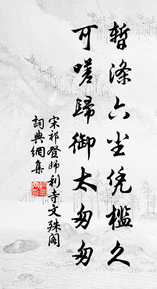 古詩文歷史字典書法欣賞書法字典國語詞典說文解字康熙字典古漢語字典暫滌六塵憑檻久,可嗟歸御太匆匆宋祁 《登師利寺文殊閣》名句出處出自宋代宋祁的《登師利寺文殊閣》全文:寶梯斜級上盤空。千里亭皋一眺窮。翠柰自生經苑地,萎花時墮佛天風。橋橫潁岸淙幽碧,日下嵩雲插倒紅。暫滌六塵憑檻久,可嗟歸御太匆匆。名句書法欣賞暫滌六塵憑檻久,可嗟歸御太匆匆書法作品宋祁名句,登師利寺文殊閣名句名句推薦成詩莫憚繼日傳,青驄御史呼歸去晁補之《次韻太學黃博士冕仲同考試作》躬行其誡七,禮盡所從三曹彥約《陳氏夫人挽章》微言寄翰墨,開卷人心耳蘇轍《和王適寒夜讀書》甘心親垤蟻,旋踵戮城狐李商隱《哭虔州楊侍郎(虞卿)》餓死首陽山,誓不食周粟釋智愚《頌古一百首》詩從是中來,孰謂此計左方回《夜髮長山豅》仙妃未起宮娃小,錯報西樓曉月寒宋白《宮詞》蛟螭旗尾擁樓頭,偃仰胡床護一州王炎《和廖守岳陽樓韻三首》舍南舍北雪猶存,山外斜陽不到門高似孫《梅》有人來不問親疏,淡飯一杯茶去馮子振《鸚鵡曲 南城贈丹砂道伴》一生不曉樊川意,剛把詩方萬戶侯釋善珍《小築》紅葉下荒井,碧梧侵古槎溫庭筠《贈鄭處士》眼底不聞鴻雁信,鼻頭常為鶺鴒酸華岳《憶弟妹》空山搖落三秋暮,螢過疏簾月露團武元衡《宿青陽驛》人比鳴琴令,官參夢馬卿龐籍《送餘姚知縣陳最寺丞》詩詞推薦沁園春(次白蘭谷韻)陳深〔宋代〕浪跡煙霞,有酒千鍾,有書五車。任從來蕭散,閒心似水,何堪嫵媚,笑面如花。濯發滄浪,放歌江海,肯被紅塵燈慕幽〔唐代〕鍾斷危樓鳥不飛,熒熒何處最相宜。香然水寺僧開卷,筆寫春幃客著詩。忽爾思多穿壁處,偶然心盡斷纓時。孫康奉和永豐殿下言志詩 二庾信〔南北朝〕王子從邊服。臨卭惜第如。星橋擁冠蓋。錦水照簪裾。論文報潘岳。詠史答應璩。帳幕參三顧。風流盛七輿。九月十一日夜雨宿營南園韓秉國寄酒兼見招以司馬光〔宋代〕雨多秋草盛,濃綠擁寒階。吾廬奧且曲,退縮如明蝸。小園已自隘,欲往泥沾鞋。體羸畏風冷,室處門常{外門內瓮牖吟邵雍〔宋代〕瓮破已甘棄,言收用有方。用時須藉口,照處便安床。不假軒窗力,能回日月光。清平臥其下,自可比羲皇。觀插秧姜特立〔宋代〕插秧如插針,瑣細亦良苦。分徒一夫積,終畝眾力舉。曾不旬日間,綠遍天涯土。周家重開國,幸勿輕農圃。木蘭花慢吳文英〔宋代〕紫騮嘶凍草,曉雲鎖、岫眉顰。正蕙雪初銷,松腰玉瘦,憔悴真真。輕藜漸穿險磴,步荒苔、猶認瘞花痕。千古興玉山道中有感二首李彌遜〔宋代〕寂寞新阡草未長,一身千里路茫茫。秋風解染愁人淚,楓葉能紅菊亦黃。題成都玉局觀孫位畫龍貫休〔唐代〕我見蘇州崑山佛殿中,金城柱上有二龍。老僧相傳道是僧繇手,尋常入海共龍斗。又聞蜀國玉局觀有孫遇跡,蟠屈秀野胡仲弓〔宋代〕世路荊榛日日深,山居抱膝且長吟。便教定亶無公論,不到風聞松竹林。