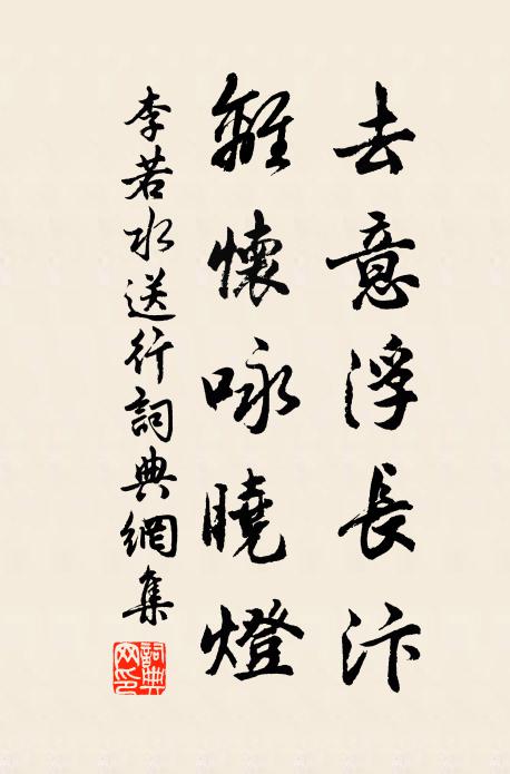 古詩文歷史字典書法欣賞書法字典國語詞典說文解字康熙字典古漢語字典去意浮長汴,離懷詠曉燈李若水 《送行》名句出處出自宋代李若水的《送行》全文:去意浮長汴,離懷詠曉燈。明時非不遇。幽黜坐無能。歲月驚雙鬢,林泉許曲肱。從今藏羽翼,敢復覬飛騰。李若水詩詞大全名句書法欣賞去意浮長汴,離懷詠曉燈書法作品李若水名句,送行名句名句推薦孤根占得春前俊,笑雪霜、謾欺容貌佚名《慶春澤》白鷺寒更浴,孤雲晴未還崔曙《潁陽東溪懷古》廢壘荒蘆無一好春,來微徑總堪行楊萬里《休日登城》瑣窗金繡紗陳允平《醉桃源/阮郎歸》何年飲著聲聞酒,迄至如今醉未醒白居易《贈鳥窠和尚詩》舊隱青山猶在夢,故交白骨已生苔釋善珍《夢元雙杉》爭權復爭利,終不得其力李華《雜詩六首》堪笑忘了,山林閒適趙彥端《柳梢青(生日)》只許寶山堆這裡,細把玉鍼貞上方釋如淨《偈頌十六首》又將老醜形骸子,般入劉家畫苑中楊萬里《贈寫真劉敏叔秀才二首》飄風西北至,樹苦萬繂牽梅堯臣《和曹光道風拔三檜》雨少似眼中淚珠,風做了口內長吁劉庭信《【雙調】水仙子 相思》杜陵老翁秋繫船,扶病相識長沙驛杜甫《惜別行送劉僕射判官(僕射乃其主將劉乃僕射之判官也)》當年約住藍橋元好問《柳梢青 以上一百零三首,見石蓮庵匯刻遺山》回身入空房王粲《雜詩》詩詞推薦和李校書沐川三絕魏了翁〔宋代〕靜看青山簇髻鬟,動觀碧水漱潺湲。若教此景來酆鄗,爭奮應成觸與蠻。讀蘇子瞻韓乾馬圖詩張耒〔宋代〕我雖不見韓乾馬,一讀公詩如見者。韓生畫馬常苦肥,肉中藏骨以為奇。開元有臣善司牧,四十萬匹屯山谷。養之次韻東平趙孟益游北山寺陳著〔宋代〕瀟灑一僧關,錢家古墓山。雲多迷早晚,溪闊限忙閒。齋鼓青龍麓,漁歌白鷺灣。欲吟吟不盡,岩溜自潺潺。思歸陸游〔宋代〕白髮滿青鏡,悵然山水身。那因五斗米,常作半塗人。涉世風波惡,思歸懷抱真。會當求鈯斧,送老鏡湖濱。水犀重開史彌寧〔宋代〕不見岩犀整一秋,厭厭對我訴清愁。公筵餘瀝何曾見,兩度開花只暗投。食橙寄謝舍人梅堯臣〔宋代〕洞庭朱橘未弄色,襄水錦橙已變黃。玉臼搗虀憐鱠美,金盤按酒助杯香。雖生南土名猶重,未信中州客厭嘗。欲寄李仁甫和予如字韻詩再用韻寄之晁公溯〔宋代〕神州久陸沈,遂作蛇豕墟。諸公頗憤激,日上平邊書。覽書帝震怒,欲下雷霆誅。金城築三洲,戈船浮五湖。要令鳳池橋成余長泰以詩賀次韻謝之陳宓〔宋代〕驂鸞翼翼裊清風,眼見雲霄有路通。自是眾賢欣出力,何如小己敢貪功。指揮須得千人敵,遲速都申一念中。已築酷暑觀小僮汲水澆石假山楊萬里〔宋代〕堂後檐前小石山,一峰瘦削四峰攆。忽騰絕壁三千丈,飛下清泉六月寒。乃是家僮聊戲事,倒傾古井作驚湍。老夫師資吟邵雍〔宋代〕未知道義,尋人為師。既知道義,人來為資。尋師未易,為資實難。指南向道,非去非還。師人則恥,人師則喜。