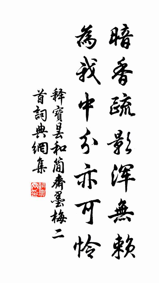 古詩文歷史字典書法欣賞書法字典國語詞典說文解字康熙字典古漢語字典暗香疏影渾無賴,為我中分亦可憐釋寶曇 《和簡齋墨梅二首》名句出處出自宋代釋寶曇的《和簡齋墨梅二首》全文:風物凋零欲盡年,此花黑瘦固應然。暗香疏影渾無賴,為我中分亦可憐。釋寶曇詩詞大全名句書法欣賞暗香疏影渾無賴,為我中分亦可憐書法作品釋寶曇名句,和簡齋墨梅二首名句名句推薦惠澤孚禽獸,威稜憺犬羊魏了翁《安大使生日》雖雲歸故鄉,何異萬里客陸游《書逆旅壁》意一堂中開九袠,太微星里現三台方蒙仲《壽徐意一參政》乃作翻然思,遽能免心驚彭龜年《別周侍郎五首》茅棟上江開,布帆當砌落權德輿《奉和李大夫題鄭評事江樓》思文后稷,克配彼天佚名《思文》觀人如觀玉,拙眼喜譏評;得失顧在人,玉固非所病陸游《雜興十首以貧堅志士節病長高人情為韻》未闌賓主意,相約更明年曾豐《送曹伯高二首》何事淮南將,功高業未成馬戴《贈淮南將》懷修煉,亘初靈物,決要鼎中藏馬鈺《滿庭芳 懷修煉》除書謗書兩不到,紫煙白雲深鎖關黃庭堅《次韻叔父台源歌》月落星稀竟不來,煙柳朧朣鵲飛去姚月華《有期不至》足下一封書,子卿歸自虜宋伯仁《梅花喜神譜爛熳二十八枝》遊人合作宿山計,家在孤城返照邊陳宓《和方機宜》畫省含香修故事,雲台呼仗請私儀孔武仲《送傅正之官禮部》詩詞推薦緣識宋太宗〔宋代〕靈無知大道,極意思悠然。摩日雲中雁,瀟湘水似天。孤峰高遠近,寶月瑩團圓。信解明開悟,青霄在目前。大言權德輿〔唐代〕華嵩為佩河為帶,南交北朔跬步內。搏鵬作臘巨鰲鱠,伸舒軼出元氣外。送張宗甫兄弟楚觀登舟赴湖北試文天祥〔宋代〕金螺曉氣照人寒,手把天漿領佩環。夜有送魚來赤壁,秋風吹雁發衡山。東南折處旗花見,牛女光中槎影還。見說冬夜即事黃庚〔宋代〕獨寢書窗下,其如寒夜何。頭邊枕黃妳,腳底踏湯婆。紙帳梅花暖,布衾春意多。道人無妄想,夢不到南柯。浸碧即事葛紹體〔宋代〕冰壺清淺酒杯深,雨鬧風荷一陣陰。琴調半殘看晉帖,更尋棋局伴秋吟。雜興陸游〔宋代〕早遇齊侯游柏寢,晚從漢帝祀甘泉。不須苦學飛騰術,更看泥金檢玉年。寄會稽天休學士宋祁〔宋代〕鳧乙天遙水驛長,笠車貪貳會稽章。風從射的迎仙舸,水是山陰作禊堂。鈴閣宴盤留薤白,書林官筆燥雌黃。庾郎賢者之孝二百四十首郭巨林同〔宋代〕為養寧埋子,那知地有金。如何有天賜,且復怕官侵。曹氏寒碧即事葛紹體〔宋代〕小窗棋靜一枰空,多事蟬聲斷續中。過雨涼生醉歸去,不知明日又秋風。和許守重陽出城韻吳芾〔宋代〕曉從千騎越重闉,軋軋籃輿渡古津。萬疊青山煙漠漠,一溪寒水石粼粼。笑攜紅袖尋蓮社,醉折黃花上葛巾。此會