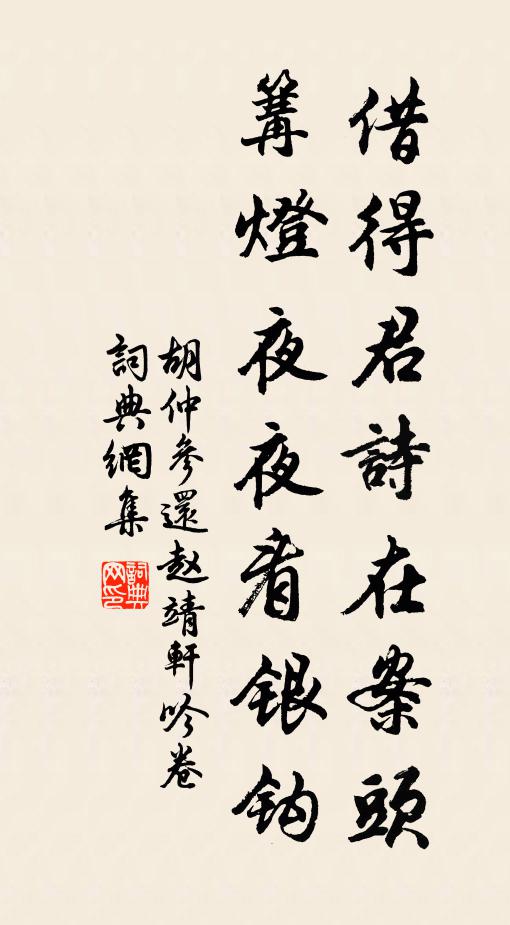 古詩文歷史字典書法欣賞書法字典國語詞典說文解字康熙字典古漢語字典借得君詩在案頭,篝燈夜夜看銀鉤胡仲參 《還趙靖軒吟卷》名句出處出自宋代胡仲參的《還趙靖軒吟卷》全文:借得君詩在案頭,篝燈夜夜看銀鉤。苦吟暗數秋更盡,何處笛聲人倚樓。胡仲參詩詞大全名句書法欣賞借得君詩在案頭,篝燈夜夜看銀鉤書法作品胡仲參名句,還趙靖軒吟卷名句名句推薦坐談稍覺佳月出,起舞不知清夜寒吳則禮《寄呂少馮時余單騎入都將發楚》會看迎鶴版,不獨愛吾廬李彌遜《寄題涇川劉子先逸軒》禁院對生台,尋師到綠槐李洞《喜鸞公自蜀歸》當年英妙曳青衿,曾習王褒盛德吟王之望《題胥解元成美堂》往來飲啄性如一,異類不至心無憂張耒《感春》天上妥雨水鳴渠,一龍任責固有餘李石《贈楊尉送湫水》盡情都說了,只恐信不及釋慧開《頌古四十八首》鶴台南望白雲關,城市猶存暫一還元稹《封書》待青松、化盡蒼龍頭角,共乘雲去陳允平《水龍吟(奉川實化鳳花)》蛇虺蔓延不自好兮,謂風蓬蓬而無似物黃庭堅《悲秋》舳艫爭利涉,來往接風潮孟浩然《舟中曉望》道無南北本同流,遠赴叢林非所求李處權《寄曇晦二首》律管才推候,寒郊忽變陰紇乾諷《新陽改故陰》惟應讀書苦,聲調作吾伊楊萬里《和周仲容春日二絕句》有人來問夕庵境,萬里孤雲無處尋趙蕃《夕庵觀整套壽寧畫》詩詞推薦送李戎扶侍往壽安賈島〔唐代〕二千餘里路,一半是波濤。未曉著衣起,出城逢日高。關山多寇盜,扶侍帶弓刀。臨別不揮淚,誰知心鬱陶。次韻七夕洪咨夔〔宋代〕弄巧拙逾甚,合歡愁轉多。擘金盟似海,搔王淚成河。天運真旋磨,人生特擲梭。身閒涼月好,且與醉無何。鶴聯句歐陽修〔宋代〕上霄琴降靈氣,琴鍾此千年禽。幽閒靖節琴,孤高伯夷心。頡頻紫霄垠,飄颻滄浪潯。岳湛有仙姿,鈞韶無俗音。行汴渠中韓元吉〔宋代〕東海桑田未可期,隋河高岸已鋤犁。樓船錦纜知無地,枯柳黃塵但古堤。有獺吟劉禹錫〔唐代〕有獺得嘉魚,自謂天見憐。先祭不敢食,捧鱗望青玄。人立寒沙上,心專眼悁悁。漁翁以為妖,舉塊投其咽。呼兒觀博平王志安少府山水粉圖李白〔唐代〕粉壁為空天,丹青狀江海。游雲不知歸,日見白鷗在。博平真人王志安,沉吟至此願掛冠。松溪石磴帶秋色,愁客三月三十日題慈恩寺白居易〔唐代〕慈恩春色今朝盡,盡日徘徊倚寺門。惆悵春歸留不得,紫藤花下漸黃昏。荔枝二首徐夤〔唐代〕朱彈星丸粲日光,綠瓊枝散小香囊。龍綃殼綻紅紋粟,魚目珠涵白膜漿。梅熟已過南嶺雨,橘酸空待洞庭霜。蠻山次陸務觀韻題姚復之秀才適齋喻良能〔宋代〕姚子神情處處便,床頭周易杖頭錢。逢僧與語閒終日,遣客歸休醉欲眠。應覺此生如寄耳,何妨一室且蕭然。無心獨夜陸游〔宋代〕城上長更續短更,江平天迥雁方征。燈明紙帳雪霜色,火熟銅瓶風雨聲。濁酒未傾心已怯,細書時讀眼猶明。蕭然