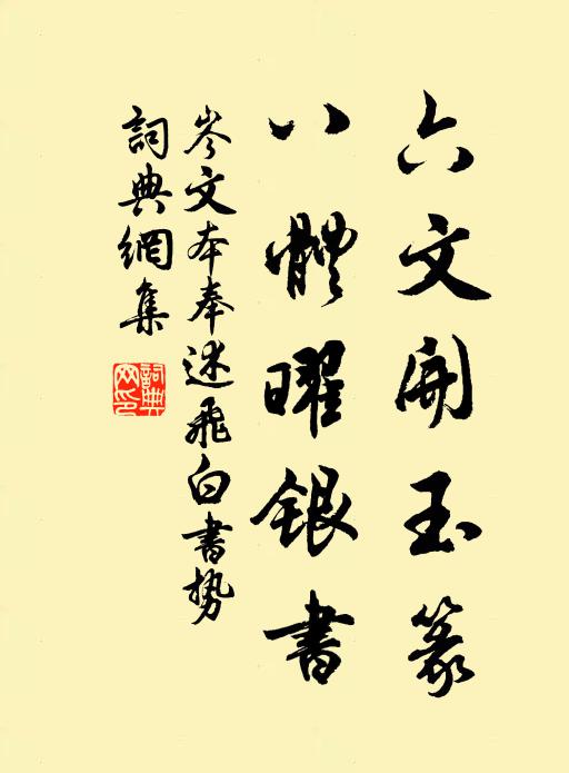 古詩文歷史字典書法欣賞書法字典國語詞典說文解字康熙字典古漢語字典六文開玉篆,八體曜銀書岑文本 《奉述飛白書勢》名句出處出自唐代岑文本的《奉述飛白書勢》全文:六文開玉篆,八體曜銀書。飛毫列錦繡,拂素起龍魚。鳳舉崩雲絕,鸞驚游霧疏。別有臨池草,恩沾垂露餘。岑文本詩詞大全名句書法欣賞六文開玉篆,八體曜銀書書法作品岑文本名句,奉述飛白書勢名句名句推薦虛名誤長者,邂逅肯經過王安石《送石賡歸寧》廬山面目清如此,幾客登臨幾夕暉董嗣杲《九江易帥遂得盡游郡齋》熟風無失舟,小艇來茫茫葉適《再過吳江贈僧了洪》瘴雲嵐雨幾時歸?應把周南視九夷范成大《次韻楊同年秘監見寄二首》囚無經宿禁,農有數年儲魏野《上知府趙侍郎二首》歌翻白雪,杯泛流霞吳禮之《柳梢青(席上)》送客自傷身易老,不知何處待先生。劉滄《贈道者》淵源有如此,沾丐及吾曹陳良佑《挽呂東萊二首》五音飭奏,神既億康真宗《高宗郊前朝獻景靈宮二十一首》吳越兩山相對愁章麗貞《長相思》烏菱不論價,白藕如泥耳蘇轍《將還江州子瞻相送至劉郎家洑王生家飲別》生長柴門蓬戶里,安知世有二南詩劉克莊《田舍即事十首》奇絕鄒枚賦詠,玉蜍冷、宮袖呵寒朱唏顏《滿庭芳》手畫兵家八陣圖,兒時此志已吞吳王義山《挽胡經乾》北面高呼拜冕旒,星垂華渚彩虹浮趙子潚《早朝十絕》詩詞推薦沿江買魚不得詢之則前比我為官船所強取故有姚勉〔宋代〕人間到處有魚羹,我亦扁舟柳下橫。一任官船渠不賣,歸歟膾玉煮深鐺。九江千歲龜歌贈無咎張耒〔宋代〕靈龜千年口不食,以背負床飲其息。吾家兩龜豈徒不食亦不息,壽與萬古無終極。濟南晁君博物天地通,夜窺牛斗有為予言烏龍高嶮不可到處有僧岩居不知其年陸游〔宋代〕樵子向予說,有僧巢翠微;岩扉雲共宿,錫杖鶴同飛。日暮松明火,天寒槲葉衣。棄官從此逝,非子尚誰歸?寧宗朝享三十五首真宗〔宋代〕王假有廟,四極駿奔。鼎俎宵嚴,虛筷雲屯。積厚流廣,德隆慶蕃。是則是繩,保我子孫。奉和魯望四明山九題鞠侯皮日休〔唐代〕堪羨鞠侯國,碧岩千萬重。煙蘿為印綬,雲壑是堤封。泉遣狙公護,果教犭軍子供。爾徒如不死,應得躡玄蹤。山舍寓止李覯〔宋代〕無計奈疏拙,走逃雲水隈。鶴飢雖厭夜,龍睡卻嫌雷。師友關千古,窮通付一杯。商岩版築者,底處有梯媒。次魏知元韻三首陳造〔宋代〕客中把酒挹江山,更藉詩人為解顏。自是交遊十年舊,向來相得立譚間。次韻李同年誠之見貽之什喻良能〔宋代〕兄弟同登年亦同,羨君墨妙更文工。我慚潦倒頭仍白,擬學韓豪一送窮。送何榷院之官金陵沈說〔宋代〕分司陪宰掾,賜勑帶朝銜。見說成行李,無因別去帆。秋風石城路,夜月雨花岩。料有驚人句,鴻邊寄短函。偈頌一百二十三首釋崇岳〔宋代〕有問西來便答東,從教人笑我佯聾。白雲乍可離青嶂,明月難教下碧空。