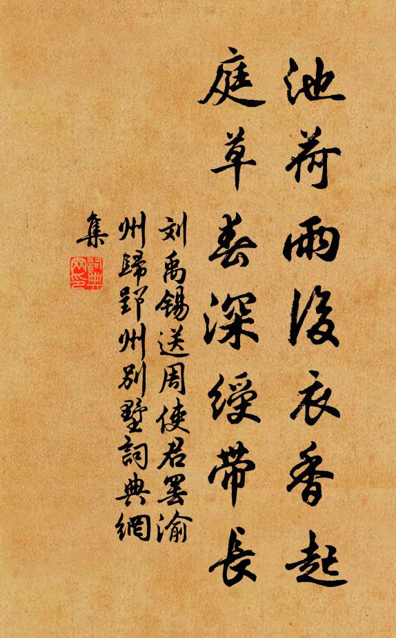 古詩文歷史字典書法欣賞書法字典國語詞典說文解字康熙字典古漢語字典池荷雨後衣香起,庭草春深綬帶長劉禹錫 《送周使君罷渝州歸郢州別墅》名句出處出自唐代劉禹錫的《送周使君罷渝州歸郢州別墅》全文:君思郢上吟歸去,故自渝南擲郡章。野戍岸邊留畫舸,綠蘿陰下到山莊。池荷雨後衣香起,庭草春深綬帶長。只恐鳴騶催上道,不容待得晚菘嘗。名句書法欣賞池荷雨後衣香起,庭草春深綬帶長書法作品劉禹錫名句,送周使君罷渝州歸郢州別墅名句名句推薦有暖溫存物,無寒著莫人邵雍《樂春吟》雨腳錯落飛河魁汪莘《淳熙壬寅仲夏大雨寫望》淚粉行行,紅顏片片,指下花落狂風雨黃庭堅《憶帝京(贈彈琵琶妓)》更分破秋光,盡成悲境史達祖《齊天樂 中秋宿真定驛》寘這石渠閣,豈徒修簡編司馬光《子厚先生哀辭》我贊我真,孰能委悉釋宗杲《廖知縣請贊》昏昏但思眠,疲病知吾衰司馬光《宿南園》與天無表里,共月見分毫錢昭度《野水》臣子訴號空殞血,鼎湖無路許攀龍金君卿《挽仁宗皇帝詞》日月更無閒里過,風騷時有靜中來齊己《靜坐》書生賤分動多奇,浪得聲名毀亦隨蔡戡《奉祠東歸》無妨自是莫相非,清濁高低各有歸白居易《池鶴八絕句。鶴答鳶》關山殺氣纏,寒日無昌明王炎《出塞曲》不看人間頃刻花,他年管領風雲色龔自珍《已亥雜詩 203》床上新詩詔草和,欄邊清酒落花多薛能《投杜舍人》詩詞推薦宿青草渡王鎡〔宋代〕夜深猶有去來船,長江倒影涵青天。鶴寒夢覺松梢月,流水殘梅浸香雪。山翁呼兒沽酒歸,獨客有感未睡時。提劍禪人並化主寫真求贊釋正覺〔宋代〕癯形老殘,孤節歲寒。照頂髑髏眼,隨緣赤肉團。六街三市尋人去,相喚門門儘是檀。煙波即事陸游〔宋代〕家浮野艇無常處,身是閒人不屬官。但有濁醪吾事足,浮名不作一錢看。讀段太尉碑崔塗〔唐代〕憤激計潛成,臨危豈顧生。只空持一笏,便欲碎長鯨。國已酬徽烈,家猶聳義聲。不知青史上,誰可計功名。要銷凝/清商怨賀鑄〔宋代〕雕梁尋巢舊燕侶。似向人慾語。試問來時,逢郎郎健否。春風深閉繡戶。盡便旋、一庭花絮。要自銷凝,吟郎長短折梅李龍高〔宋代〕詩老流離蜀劍關,放臣憔悴楚江乾。爭如留取微酸味,莫逐浮花一笑殘。映雪亭王之道〔宋代〕蕭然數株梅,皓與雪相映。臨池鑒疏影,影落大圓鏡。不煩粉塗株,寒光助嚴靚。寄張端父孔武仲〔宋代〕與君生世共飄蓬,會面荒陂寂寞中。芳酒一樽留夜語,旅程千里倦春風。追思薦鶚門闌舊,默感跳丸歲月空。聞道連夕大風,凌寒梅已零落殆盡三絕范成大〔宋代〕玉雪飄零賤似泥,惜花還記賞花時。賞花不許輕攀折,只許家人戴一枝。枕流石費冠卿〔唐代〕不為幽岸隱,古色涵空出。願以清泚流,鑒此堅貞質。傍臨玉光潤,時瀉苔花密。往往驚游鱗,尚疑垂釣日。