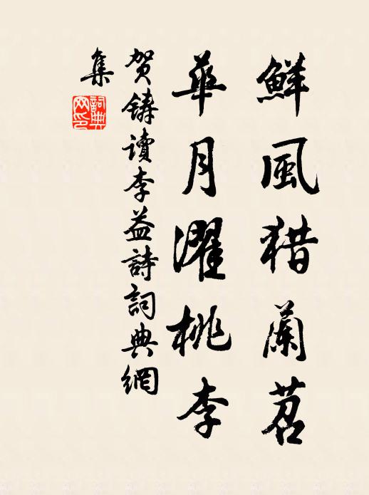 古詩文歷史字典書法欣賞書法字典國語詞典說文解字康熙字典古漢語字典鮮風獵蘭苕,華月濯桃李賀鑄 《讀李益詩》名句出處出自宋代賀鑄的《讀李益詩》全文:君虞興聖孫,詩律早專美。樂府度新聲,宮酺奉天子。鮮風獵蘭苕,華月濯桃李。獨有連眉郎,才稱劣相比。頗聞竹窗句,流落綺紈耳。吏曹久失調,幕府感恩起。從軍五十篇,王粲慙率爾。胡沙動霜草,開卷得千里。騫翔大蓬拜,轉顧觸排毀。晚升八座崇,謝事知所止。高文茂支庶,埋滅長已矣。斯人今不亡,正賴數番紙。咄嗟齒踰壯,日就無聞恥。勉哉課謠吟,請自田居始。名句書法欣賞鮮風獵蘭苕,華月濯桃李書法作品賀鑄名句,讀李益詩名句名句推薦過雨涼生醉歸去,不知明日又秋風葛紹體《曹氏寒碧即事》前別忽來如再世,後期禁得又三秋陳著《次韻史猷父》非惟可詫陶淵明,亦愧當年督郵者王阮《昌國秩滿次陳糾祖行韻一首》娛琴適情性,悟棋知興亡方回《小飲張季野宅分韻得張字》藕絲衫子水沈香呂勝己《虞美人(月下聽琴,西湖作)》玉斧難藏修月手,待做明宵清絕方岳《酹江月(八月十四,小集鄭子重帥參先月樓。是夕無月和朱希真插天翠柳詞韻)》何人可作題詩伴,試茗應思謝法曹趙湘《蕭山李宰君北亭即事》蓴菊我何有,一杯天地春劉黻《城中有高樹》可憐夜永不成寐,苦恨春殘猶未歸余靖《代贈》羸兵瘦馬犯黃塵,自笑區區夢裡身秦觀《與鄧慎思沐於啟聖遇李端叔》百味甘香,一身清淨張掄《踏莎行》蔉穮脫中熟,吾口良易餬陳造《十二月二十六日趨府》瘦盡柔絲無一把張翥《蝶戀花 柳絮》爐錐難自薦,關捩只心通王千秋《臨江仙》世封潁川刺濟州,子孫嬋媛冠劍偉晁說之《積善堂》詩詞推薦偈頌一百五十首釋心月〔宋代〕古人底,今人底。道著道不著,一場沒巴鼻。象王迴旋,師子遊戲,洎合扶不起。如夢令譚處端〔元代〕只把靈台頻掃。惜取自家真寶。火里長蓮花,便是修行玄奧。顛倒。顛倒。境滅心忘了了。哀王孫杜甫〔唐代〕長安城頭頭白烏,夜飛延秋門上呼。又向人家啄大屋,屋底達官走避胡。金鞭斷折九馬死。骨肉不待同馳驅。腰下二十二弟獲金印晁說之〔宋代〕季也獲金印,籀文秦不如。情知非鬼篆,恨不識天書。池靜龜游罷,庭閒鵲斗余。春風還舊物,疏俊獨憐渠。題玉堂壁陶谷〔宋代〕官職有來須與做,有才用處不憂無。堪笑翰林陶學士,一生依樣畫葫蘆。寄從善上人翁卷〔宋代〕數載不相見,師應長閉關。香菸前代寺,秋色五峰山。棋進僧誰敵,琴余鶴共閒。幾時重過我,吟話此林間。下第後蒙侍郎示意指於新先輩宣恩感謝楊凝〔唐代〕才薄命如此,自嗟兼自疑。遭逢好交日,黜落至公時。倚玉甘無路,穿楊卻未期。更慚君侍坐,問許可言詩。婦女之孝二十首趙津吏女林同〔宋代〕儻得代父死,誠非愛妾身。不圖君聘妾,向道有嚴親。乾元中寓居同谷縣,作歌七首杜甫〔唐代〕有客有客字子美,白頭亂髮垂過耳。歲拾橡栗隨狙公,天寒日暮山谷里。中原無書歸不得,手腳凍皴皮肉死。嗚呼琮上人以詩惠茶筍史彌寧〔宋代〕解道碧雲句,三生湯惠休。試春輟鷹爪,斸雨餉獵頭。夢境可容到,饞涎那複流。舌端吾薦取,倘不負珍投。