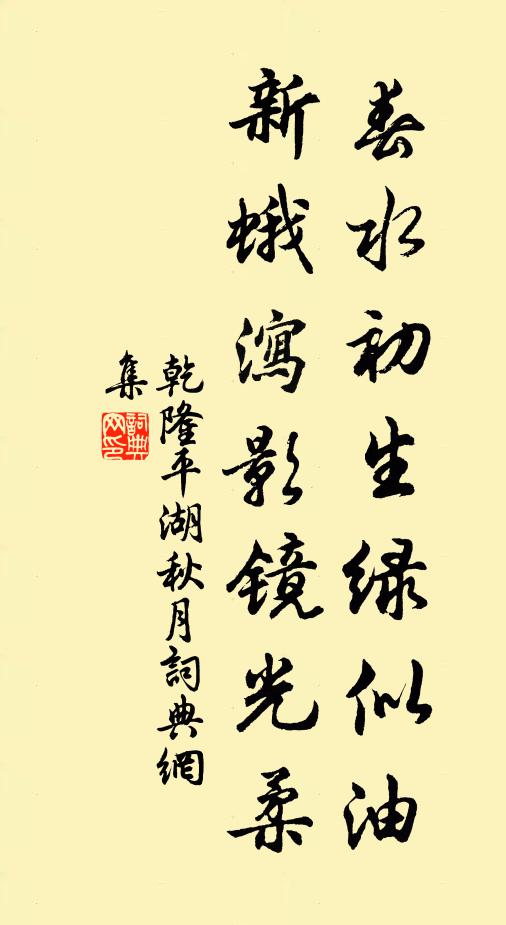 古詩文歷史字典書法欣賞書法字典國語詞典說文解字康熙字典古漢語字典春水初生綠似油,新蛾瀉影鏡光柔乾隆 《平湖秋月》名句出處出自清代乾隆的《平湖秋月》全文:春水初生綠似油,新蛾瀉影鏡光柔。待予重命行秋棹,飽弄金波萬里流。乾隆詩詞大全名句書法欣賞春水初生綠似油,新蛾瀉影鏡光柔書法作品乾隆名句,平湖秋月名句名句推薦郊外踏青,禁菸寒食張碧山《【雙調】錦上花 春遊》新秋無岸水,明月有琴船黃滔《送李山人往湘中》豆蔻釵梁恨裊吳文英《天香·蠟梅》君劈槽燒當止酒,我和琴爨況無弦高登《覓蠹椽》九鼎奏簫韶,爰居端不饗黃庭堅《送吳彥歸番陽》塞雁來時憑遠信,海鷗馴處見吾真蘇頌《和林成之五題江上》蹋歌起自春來日,直至春歸唱不休楊維楨《春情二首》洛花移種否,喚起故園心李曾伯《自湘赴廣道間雜詠飛燕》遂使民胥效,鹹知上育材宋祁《皇帝邇英閣講畢五經》江上送年歸周紫芝《浪淘沙(己未除夜)》皇旅如雷鐵嶂碎,汴水沄沄汴風噓程珌《秘閣儒榮堂》散清馥,翻素艷,照晴空姚述堯《水調歌頭(酴醿)》禪心久已絕貪嗔,劇飲狂歌總是真蔡戡《送葛謙問》水底元無月,衣中自有珠司馬光《送李益之侍郎致政歸廬山》驀劄相逢十二峰,我患生盲你患聾釋紹曇《偈頌一百一十七首》詩詞推薦偈頌四首釋鹹傑〔宋代〕釋迦不說說,迦葉不聞池。天河風浪靜,星斗位區分。送李廷尉濠梁王令〔宋代〕直道無適可,小官真漫論。夫君自行義,而我更何言。獨柱難為刀,橫流不奈渾。此心持送子,飲淚檔前樽。行運河辛大觀先行以此走寄張舜民〔宋代〕同下龜山時,舟行篙參差。夜投洪澤口,訪問失所之。不應一日力,解至淮陰祠。長淮自風浪,竟夕起憂疑。旦日雲峰院唐仲友〔宋代〕木杪出危閣,軒窗羅翠屏。更須登石望,欲盡遠山青。題畫二首唐寅〔明代〕扶筇散步碧山游,萬壑千岩爽氣浮。一個茅薺如斗大,如何容得許多秋。箬峴東池白居易〔唐代〕箬峴亭東有小池,早荷新荇綠參差。中宵把火行人發,驚起雙棲白鷺鷥。謝見招者鄧肅〔宋代〕機鋒不契更何圖,便合浮杯出上都。此去定須安短褐,平生那肯曳長裾。回天儻是奇男子,綰印原非大丈夫。揮手喜遷鶯秦觀〔宋代〕花香馥郁。正春色平中,海籌添屋。金馬清才,玉麟舊守,帝遣暫臨江國。冠蓋光生南楚,川岳靈鍾西蜀。堪羨是秀野周弼〔宋代〕小作幽園傍宅開,只須數畝占樓台。石移林屋秋雲至,水帶松江暮雨來。徑草散香迎過屐,砌花分影蔭流杯。人家滿庭芳(政和癸巳滁陽作,其年京師大雪)向子諲〔宋代〕天宇長閒,飛仙狂醉,挼雲碎玉沈空。謝家庭院,爭道絮因風。不怕寒生寶粟,深調護、犀幕重重。瑤林里,疏梅