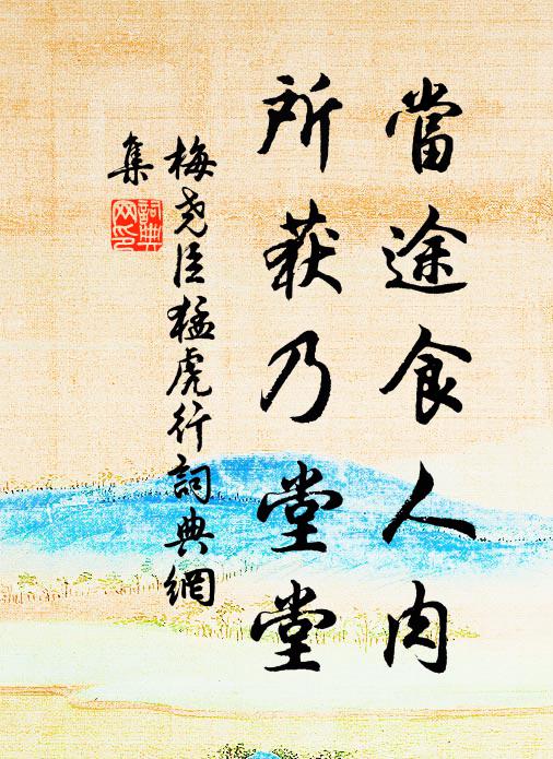 古詩文歷史字典書法欣賞書法字典國語詞典說文解字康熙字典古漢語字典當途食人肉,所獲乃堂堂梅堯臣 《猛虎行》名句出處出自宋代梅堯臣的《猛虎行》全文:山木暮蒼蒼,風淒茅葉黃。有虎始離穴,熊羆安敢當。掉尾為旗纛,磨牙為劍鋩。猛氣吞赤豹,雄威躡封狼。不貪犬與豕,不窺藩與牆。當途食人肉,所獲乃堂堂。食人既我分,安得為不祥。麋鹿豈非命,其類寧不傷。滿野設罝網,競以充圓方。而欲我無殺,奈何飢餒腸。名句書法欣賞當途食人肉,所獲乃堂堂書法作品梅堯臣名句,猛虎行名句名句推薦殘歷半空心悄愴,岸巾徐步發颼飀陸游《追涼至安隱寺前》問我是何人,空門舊隱淪釋文珦《傳聲問我》掌似平蕪遠際空,灣灣曲曲水相通陽枋《固城湖》蒸沙以為城,冶鐵用作限曹勛《山居雜詩九十首》池有十種蓮,平生所見稀王灼《王氏碧雞園六詠露香亭》素光浮轉薄,皓質駐應難姚康《禮部試早春殘雪》不須遠遠遠尋師馬鈺《萬年春》工歌屢奏,聲和間章佚名《紹興以後蜡祭四十二首》郡閣高檐半納雲,危欄徙倚惜芳辰章岷《春日獨登蓬萊閣》日中烏鵲至,花里鳳凰來李嶠《鑒》詩老無心為題拂,至今惆悵似含情劉子翬《海棠花》世變漢人能北語,亂興晉室有童謠王鎡《春雨感懷》系匏兩相憶,極目十餘城黃庭堅《次韻劉景文登鄭王台見思五首》幽禽出樹亂紅落,游魚吹花流水香馮信可《桃源圖》此山即前修陳鑒之《會稽秋日觀山》詩詞推薦留別馬使君李群玉〔唐代〕俱來海上嘆煙波,君佩銀魚我觸羅。蜀國才微甘放蕩,專城年少豈蹉跎。應憐旅夢千重思,共愴離心一曲歌。唯有寧國寺(新城縣)方乾〔唐代〕深僻孤高無四鄰,白雲明月自相親。海中日出山先曉,世上寒輕谷未春。窗逼野溪聞唳鶴,林通村徑見樵人。此時果山春郊即事七首吳泳〔宋代〕晴嵐撲撲染人衣,龢意溶溶接岸陲。春事平鋪都放著,不應只認小桃枝。薌岩山居孟夏二十絕舒岳祥〔宋代〕種松為老伴,栽菊充歲糧。新國苦長役,遺民懷故鄉。遠遊十首韓元吉〔宋代〕大鈞轉一氣,急轂無停轅。是非與生死,膠擾於其間。朝昏互變滅,倏已千萬年。豈知達道人,直作須臾觀。天地福昌雜詠五首張耒〔宋代〕乘雲飛去不辭家,女幾荒祠一徑斜。溪入亂雲鳴佩玦,樹蟠蒼石老龍蛇。夜寒玉鏡懸清月,天碧霓衣曳彩霞。陵谷送游提刑秘閣赴召三首程公許〔宋代〕外敵日侵伐,滋為元氣傷。憂心耿不寐,洗耳待封章。弱植如羈羽,知音念五羊。因書主疏賤,決起尚榆枋。無盡上人東林禪居李頎〔唐代〕草堂每多暇,時謁山僧門。所對但群木,終朝無一言。我心愛流水,此地臨清源。含吐山上日,蔽虧松外村。孤峰寄贈孫路處士鄭谷〔唐代〕平生詩譽更誰過,歸老東吳命若何?知己凋零垂白髮,故園寥落近滄波。酒醒蘚砌花陰轉,病起漁舟鷺跡多。深入伐墓松衛宗武〔宋代〕鬱郁乎佳哉,古松茂而秀。封植難計年,龍鸞相錯糾。天風動清籟,洞庭喧雅奏。護之珠玉如,期以金石久。夫何