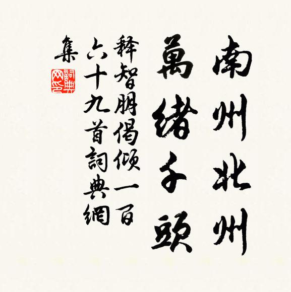 古詩文歷史字典書法欣賞書法字典國語詞典說文解字康熙字典古漢語字典南州北州,萬緒千頭釋智朋 《偈傾一百六十九首》名句出處出自宋代釋智朋的《偈傾一百六十九首》全文:南州北州,萬緒千頭。釣絲絞水,紙捻無油。鶴神飛上天,土宿騎黃牛。大海有十件奇物事,未曾說著。釋智朋詩詞大全名句書法欣賞南州北州,萬緒千頭書法作品釋智朋名句,偈傾一百六十九首名句名句推薦我生不願文字習,亦不願學屠龍方釋寶曇《病寓靈芝寺夜聞講律有作》黃葉分飛砧上下,白雲零落馬東西薛能《秋溪獨坐》重陰浩瀚渺無濱,草木摧殘見本真魏了翁《和虞永康梅花十絕句》客意自如此,非關行路難溫庭筠《西遊書懷》登覽之勝,隨寓有感岳珂《米元章鑒遠前詩帖贊》富依公,天能祐護馬致遠《【雙調】夜行船_天地之間人》時哉苟不會,草木為我儔李白《贈崔郎中宗之 時謫官金陵》齊廚雖無餘,賓客甚易諾蘇轍《喜雪呈李公擇》牽牛亘南直何遜《擬輕薄篇》遙連漢岳三呼應,徐聽虞韶九奏淳崔敦詩《金國賀會應聖節使人到闕集英殿宴致語口號》盜功仍苟容,豈恥無道谷李廌《天封觀將軍柏》蝴蝶夢魂,芭蕉身世,幾人得到龐眉洪适《滿庭芳(答景盧遣懷)》碧龜巢處藕花香陳允平《風入松(壽恕齊謝待制)》斂容辭豹尾,緘恨度龍鱗駱賓王《王昭君(一作昭君怨)》桑間三宿尚回頭,何況三年濯錦游范成大《入崇寧界》詩詞推薦詠梅石延年〔宋代〕柔梢繁白玉鈿封,忍盡嬌心恨幾重。姑射真人冰作體,廣寒仙女月為容。江南春信香猶在,樓上晨妝粉不供。可惜破陣子 梓慶齊戒入山林,見成鋸乃加削焉,劉敏中〔元代〕鬼材之鬼生蟠錯曲直,莫不有自然之質。制器者因其質之自然,用其巧而不以巧自私,則巧存而器全,是之謂以天寄思溪老藏叟珍上人蒲壽宬〔宋代〕萬折苕溪水,精廬若個邊。菰菱時入供,包錫暮行船。月朗無雲夜,雕橫欲雪天。了知身是客,莫負故山緣。鳳棲梧/蝶戀花周密〔宋代〕竹窈花深連別墅。曲曲迴廊,小小閒庭宇。忽地香來無覓處。杖藜閒趁游蜂去。老桂懸秋森玉樹。澗底孤芳,苒苒秋日感懷唐彥謙〔唐代〕溪上芙蓉映醉顏,悲秋宋玉鬢毛斑。無情最恨東流水,暗逐芳年去不還。峽州汪德輸〔宋代〕醉翁昔日經行處,遐想英風萬古愁。芳草斜陽渾似舊,茫茫江水自空流。禪人並化主寫真求贊釋正覺〔宋代〕野鶴骨癯,澗松皮粗。一身閒而雲行林壑,兩眼冷而秋入江湖。智到無而有,理極有而無。齊物蝶翻晝夢,隨機蜂吳坂汪遵〔唐代〕踡跼鹽車萬里蹄,忽逢良鑒始能嘶。不緣伯樂稱奇骨,幾與駑駘價一齊。夜讀唐諸人詩多賦烽火者因記在山南時登城觀陸游〔宋代〕我昔游梁州,軍中方罷戰。登城看烽火,川迥風裂面。青熒並駱谷,隱翳連鄠縣。月黑望愈明,雨急滅復見。初疑偈頌十五首釋法薰〔宋代〕解用不須 * 劍,延齡何必九還丹。尉遲□不在家死,獅子那能食兔錢。