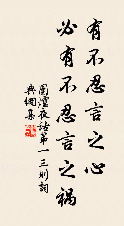 古詩文歷史字典書法欣賞書法字典國語詞典說文解字康熙字典古漢語字典有不忍言之心,必有不忍言之禍。王永彬 《圍爐夜話·第一三O則》名句出處摘自《圍爐夜話·第一三O則》解釋:對人對事若發現錯誤而不忍心去指責、糾正,那么必然會因為不忍心去說而造成禍害。原文摘要:有不可及之志,必有不可及之功;有不忍言之心,必有不忍言之禍。名句書法欣賞有不忍言之心,必有不忍言之禍。書法作品王永彬名句,圍爐夜話·第一三O則名句名句推薦非其地而樹之,不生也。劉向《說苑·雜言》家山何在,雪後園林,水邊樓閣。辛棄疾《瑞鶴仙·賦梅》所謂伊人,在水一方。佚名《蒹葭》聞善以相告也,見善以相示也戴聖《禮記·儒行》對秋深,離恨苦,數夜滿庭風雨。孫光憲《更漏子·對秋深》黃昏鼓角似邊州,三十年前上此樓。李益《上汝州郡樓》十月江南天氣好,可憐冬景似春華。白居易《早冬》猿啼客散暮江頭,人自傷心水自流。劉長卿《重送裴郎中貶吉州》遊人記得承平事,暗喜風光似昔年。韋莊《長安清明》世間珍果更無加,玉雪肌膚罩絳紗。丘浚《詠荔枝》酹酒蒼茫,倚歌平遠,亭上玉虹腰冷。吳文英《十二郎·垂虹橋》浮雲暮南征,可望不可攀。杜甫《前出塞九首》未知生,焉知死?孔子弟子《論語·先進篇》常將有日思無日,莫待無時思有時。馮夢龍《警世通言·卷二十五》其日,有雨不採,晴有雲不採;晴,采之、蒸之、搗之、焙之、穿之、封之、茶之乾矣。陸羽《茶經·三之造》詩詞推薦贈李樞乾三首姚勉〔宋代〕身方否極當如泰,命到能時亦似窮。此事總皆由自己,算來都不屬天工。踏莎行(追往事)毛滂〔宋代〕芳氣霏微,薄衣料峭。何人正倚桃花笑。流紅不出武陵溪,這回空與春風到。尊俎全稀,風情終較。安仁老也誰知送客還幽州李益〔唐代〕惆悵秦城送獨歸,薊門雲樹遠依依。秋來莫射南飛雁,從遣乘春更北飛。次鄒希賢買魚不得三首衍為漁翁問答六詩再姚勉〔宋代〕魚器如何盡擁虛,未應寒鬣總依蒲。終朝竟夕渾無得,莫是君鉤太直無。鄭駕部射圃歐陽修〔宋代〕夢早西堂射圃連,蘭苕初日露華鮮。暈含畫的弦開月,牙算行籌酒滿船。鏤管思催吟韻劇,妓簾陰薄舞衣翩。當筵中興歌鮑照〔南北朝〕碧樓含夜月。紫殿爭朝光。彩墀散蘭麝。風起自生芳。政黃牛贊釋慧開〔宋代〕資福從來不識羞,橘皮熟炙逞風流。倚筇懶賢侯不命,又卻騎牛更覓牛。憶舊遊(寄友)張炎〔宋代〕記瓊筵卜夜,錦檻移春,同惱鶯嬌。暗水流花徑,正無風院落,銀燭遲銷。鬧枝淺壓髫髻,香臉泛紅潮。甚如此游陪元侍御游支硎山寺劉長卿〔唐代〕支公去已久,寂寞龍華會。古木閉空山,蒼然暮相對。林巒非一狀,水石有餘態。密竹藏晦明,群峰爭向背。峰峰夜坐讀書黃庚〔宋代〕寂寞寒窗下,觀書勝苦吟。青燈風雪夜,黃卷聖賢心。吾道關興廢,斯文幾古今。鳳兮胡不至,三嘆淚沾襟。