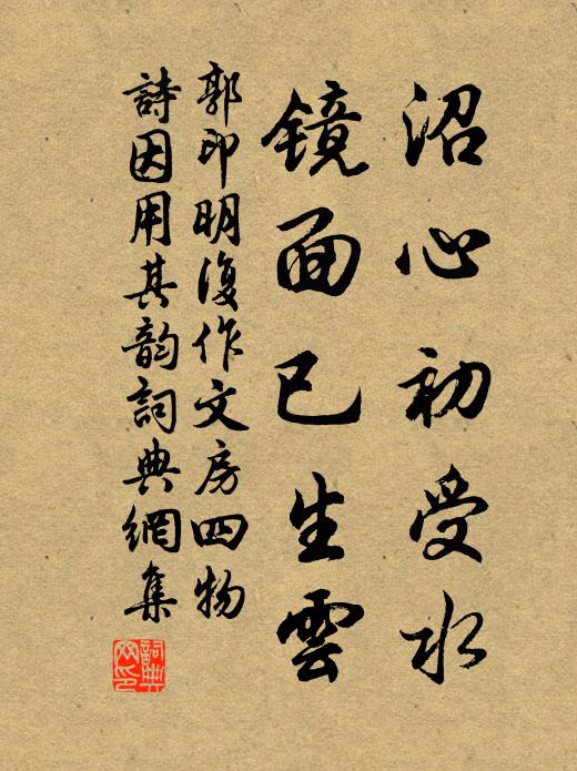 古詩文歷史字典書法欣賞書法字典國語詞典說文解字康熙字典古漢語字典沼心初受水,鏡面已生雲郭印 《明復作文房四物詩因用其韻》名句出處出自宋代郭印的《明復作文房四物詩因用其韻》全文:琢就陰崖骨,良工用意勤。沼心初受水,鏡面已生雲。自比珪璋質,能成翰墨勛。千金酬重價,端石世傳聞。名句書法欣賞沼心初受水,鏡面已生雲書法作品郭印名句,明復作文房四物詩因用其韻名句名句推薦霜髯飛將曾百戰,欲擄名王朝帝吳則禮《紅樓慢(贈太守楊太尉)》緩步凌巀嵲,雙旌隨杖藜韓縝《崇法寺》芋栗又分六個馬鈺《蕊珠宮 繼重陽韻》最憐吟苜蓿,不及向桑榆戴叔倫《口號》橋山事嚴庀百局,補袞諸公省中宿黃庭堅《謝送碾壑源揀芽》待殘擬把酥煎啖,莫采芳英泛酒觴史鑄《牡丹菊》西邊雙石峰,引望堪忘年元結《樊上漫作》五步掘一塹,當途如壞堤梅堯臣《淘渠》榘山詩卷仁齋書,知音僂指皆名儒江立信《贈儒僧空谷二首》沾衣帶潤元無見,著物還消不待曦陳師道《和黃充小雪》高僧來不見,卻返五峰前梅堯臣《隱靜山訪懷賢上人不遇》悄悄冥冥,潛潛等等王實甫《越調 鬥鵪鶉》千官肅事,萬國朝宗武則天《武后明堂樂章。迎送王公》不待清風生兩腋,清風先向舌端生陳仲諤《送新茶李聖喻郎中》常教玉戶開,莫使金關漏馬鈺《遇仙槎》詩詞推薦七言二首答黎教授歐陽修〔宋代〕共坐欄邊日欲斜,更將金蕊泛流霞。欲知卻老延齡藥,百草枯時始見花。詩二首余翼〔宋代〕偶閒如到女媧天,深入何殊葛稚川。何必東山隨謝守,盡游終日恣陶然。山之高三章張玉孃〔宋代〕汝心金石豎, * 冰雪潔。擬結百歲盟,忽成一朝別。朝雲暮雨心去來,千里相思共明月。送童子盧親國試玉堂方岳〔宋代〕長亭柳色鵝兒黃,花事欲動春風香。佩觹徑趨白玉堂,淋漓翰墨孤鳳翔。黑頭相公紫微郎,金貂玉魚垂兩璫。攜立雪後觀月鄭剛中〔宋代〕風高一闊淨無塵,萬瓦生光冷射人。不見曉來迷曉雪,但看霜月益精神。少馮得蕙二本分一見供吳則禮〔宋代〕春盡盱眙天水昏,一年幽事要人論。阿馮端起北湖想,故遣九荂來晤言。雜曲歌辭。排遍第一佚名〔唐代〕三秋陌上早霜飛,羽獵平田淺草齊。錦背蒼鷹初出按,五花驄馬餵來肥。長安春日章碣〔唐代〕春日皇家瑞景遲,東風無力雨微微。六宮羅綺同時泊,九陌煙花一樣飛。暖著柳絲金蕊重,冷開山翠雪棱稀。輸他中春過陽亭張栻〔宋代〕亭古危臨岸,林幽巧近城。煙容隨雨住,花片著溪清。春事已如許,客懷誰與傾。亭前兩好樹,滿意欲敷榮。寄三城王宣徽二首邵雍〔宋代〕路上塵方坌,壺中花正開。何須頭盡白,然後賦歸來。