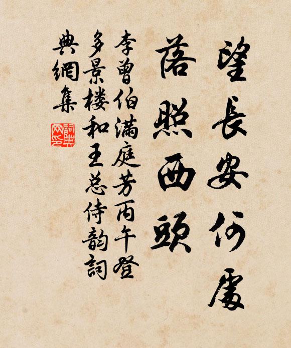 古詩文歷史字典書法欣賞書法字典國語詞典說文解字康熙字典古漢語字典望長安何處,落照西頭李曾伯 《滿庭芳(丙午登多景樓和王總侍韻)》名句出處出自宋代李曾伯的《滿庭芳(丙午登多景樓和王總侍韻)》全文:浪拍金鰲,春浮鐵瓮,氣清天朗如秋。江皋無事,飛蓋強追游。萬頃蒲萄光里,風檣共、塔影悠悠。人間事,年華似擲,一水與俱流。綢繆。千古恨,紛紛離合,晉宋曹劉。望長安何處,落照西頭。往事蒼苔陳跡,夷吾在、吾屬何愁。清樽畔,誰能為我,一曲舞梁州。名句書法欣賞望長安何處,落照西頭書法作品李曾伯名句,滿庭芳(丙午登多景樓和王總侍韻)名句名句推薦已紊四時和,更傷群物性蘇頌《和林丘二君會程坦之家二詩》東坡猶故目,北藥致遺秉蘇軾《紫團參寄王定國》今為人所憐庾信《傷王司徒褒詩》離愁禁不去盧祖皋《魚遊春水》屋角樹陰傾老蓋,溪南山色過浮梁曾幾《次馮子容主簿信州築居韻》堤上殘風雪,橋邊盛酒樓梅堯臣《十三日雪後晚過天漢橋堤上行》算禁得、清明幾度張之翰《金縷曲 乙未清明》富貴功名是何物,才堪休處便須休釋文珦《雲林》遙知舊遊處,落落空遺躅蘇轍《寄濟南守李公擇》興廢榮枯都不識,一家活計一漁船方回《記正月二十五日西湖之游十五首》不見嶺頭雲,未盡登臨意陳師道《平翠閣》躊躕遂忘去,風露欲三更陸游《浴罷》顏公素高山水意,常恨三山不可至皎然《奉應顏尚書真卿觀玄真子置酒張樂舞破陣畫洞庭三山歌》所嗟人事異,天險古猶今張蘊《多景樓》佳人獨不然江淹《悼室人詩》詩詞推薦別離情所鍾十二章章四句送定叟弟之官嚴陵張栻〔宋代〕雲滿南陽陌,書藏善和宅。行行重回首,無使歸思隔。樂天夢得有歲夜詩聊以奉和牛僧孺〔唐代〕惜歲歲今盡,少年應不知。淒涼數流輩,歡喜見孫兒。暗減一身力,潛添滿鬢絲。莫愁花笑老,花自幾多時。八駿圖詩元稹〔唐代〕穆滿志空闊,將行九州野。神馭四來歸,天與八駿馬。龍種無凡性,龍行無暫舍。朝辭扶桑底,暮宿崑崙下。鼻息魚溝遇大水晁補之〔宋代〕沙行水宿幾江南,石鬥龍求久已諳。秋水故應旋面目,順流東望為君慚。和許守重陽出城韻吳芾〔宋代〕曉從千騎越重闉,軋軋籃輿渡古津。萬疊青山煙漠漠,一溪寒水石粼粼。笑攜紅袖尋蓮社,醉折黃花上葛巾。此會跋徐蜚英四世祖神童事方回〔宋代〕□□□□□□□,□□□□□□□。□□□□□□□,□軍不復過前村。贈賣松人於武陵〔唐代〕入市雖求利,憐君意獨真。劚將寒澗樹,賣與翠樓人。瘦葉幾經雪,淡花應少春。長安重桃李,徒染六街塵。牡丹宋鹹〔宋代〕輕霧欲籠藏暮碧,斷霞初怨誤朝紅。即時苦待千枝爛,計日先愁一樹空。外客定聞瓊宴賞,護春長把錦帷蒙。茉莉花江奎〔宋代〕靈種傳聞出越裳,何人提挈上蠻航。他年我若修花史,列作人間第一香。野步陸游〔宋代〕堤上淡黃柳,水中花白鵝。詩情隨處有,此地得偏多。