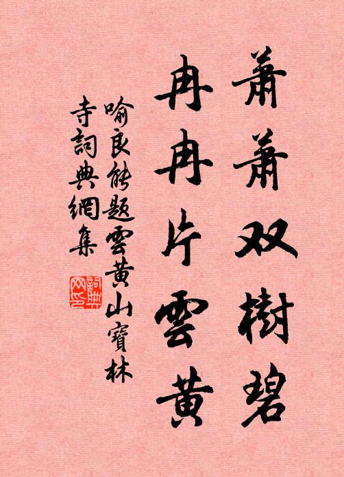 古詩文歷史字典書法欣賞書法字典國語詞典說文解字康熙字典古漢語字典蕭蕭雙樹碧,冉冉片雲黃喻良能 《題雲黃山寶林寺》名句出處出自宋代喻良能的《題雲黃山寶林寺》全文:彌勒下生地,溪山秀且長。蕭蕭雙樹碧,冉冉片雲黃。曉日觚稜淨,西風松桂香。十年疏杖屨,玉石耿難忘。名句書法欣賞蕭蕭雙樹碧,冉冉片雲黃書法作品喻良能名句,題雲黃山寶林寺名句名句推薦渦水春深戰未停,廬山秋老夢方寧項安世《贈彭術士》過了燒燈望燕歸,春寒劃地勒芳期何應龍《題臨安僦樓》柴扉深閉百蟲秋,落葉幽花露未收仇遠《紀事》為國作瑞璉,賴公培福根方逢辰《挽鄭直齋居士》追送寧辭遠,乖離故在茲趙蕃《追路送誠齋到灘頭驛》多愁勝渺波梅窗《菩薩蠻(題錦機小軸)》千古武陵溪上,雞犬也應問訊,春夢落花斑李孝光《水調歌頭》算人生、悲莫悲於輕別,最苦正歡娛,便分鴛侶柳永《傾杯(林鐘商)》日落河冰壯,天長鴻雁哀陳與義《至陳留》斷腸月夕煙春晁端禮《清平樂》漢廷難用少,流落賈生材徐寶之《長沙》風月箇中老子,江湖之上散人范成大《久病,或勸勉強游適,吟四絕答之》更題封誰調,聰明德祖,和漿且浣,消渴相如許有壬《沁園春 賦酪,次明初韻》無言獨上西樓,月如鉤。寂寞梧桐深院鎖清秋。李煜《相見歡·無言獨上西樓》居玉鉉,擁金蟬張孝祥《鷓鴣天》詩詞推薦書事三絕范成大〔宋代〕日日處方候脈,時時推莢禳災。門外雖無車轍,醫生卜叟猶來。四月壬午發利州洪咨夔〔宋代〕十里迎春水面開,櫓聲不動柁聲催。春山轉處疑江盡,白鳥迎人風折來。禪人並化主寫真求贊釋正覺〔宋代〕為僧{左屈右刂}剞,與世支離。目瞳青炯炯,頭髮白絲絲。劫空有句,真得無師。借功分照用,借位解提持。萬吹柳絮(鷓鴣詞)賀鑄〔宋代〕月痕依約到西廂。曾羨花枝拂短牆。初未識愁那得淚,每渾疑夢奈餘香。歌逢裊處眉先嫵,酒半酣時眼更狂。閒倚斑竹(得之湘流)元稹〔唐代〕一枝斑竹渡湘沅,萬里行人感別魂。知是娥皇廟前物,遠隨風雨送啼痕。岐王山亭張諤〔唐代〕王家傍綠池,春色正相宜。豈有樓台好,兼看草樹奇。石榴天上葉,椰子日南枝。出入千門裡,年年樂未移。江村二首董嗣杲〔宋代〕荒村雨過炊煙收,誰擊月下籬根舟。風葉半夜摐摐響,老犬獨吠空江秋。上巳日周丞相少保來訪敝廬,留詩為贈楊萬里〔宋代〕楊鹽金勝賀鹽家,賜湖豈比賜書華。迴環自辟三三徑,頃刻常開七七花。門外有田聊伏臘,望中無處不煙霞。卻慚大寒步至東坡贈巢三蘇軾〔宋代〕春雨如暗塵,春風吹倒人。東坡數間屋,巢子與誰鄰。空床斂敗絮,破灶郁生薪。相對不言寒,哀哉知我貧。我有曉日韓偓〔唐代〕天際霞光入水中,水中天際一時紅。直須日觀三更後,首送金烏上碧空。