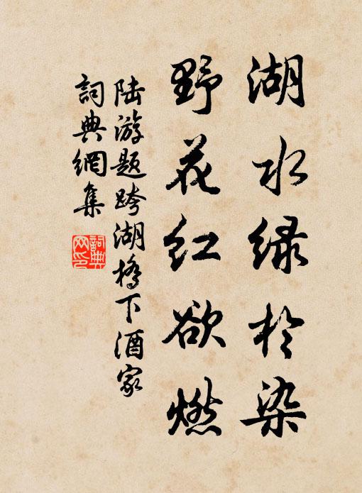 古詩文歷史字典書法欣賞書法字典國語詞典說文解字康熙字典古漢語字典湖水綠於染,野花紅欲燃陸游 《題跨湖橋下酒家》名句出處出自宋代陸游的《題跨湖橋下酒家》全文:湖水綠於染,野花紅欲燃。春當三月半,狂勝十年前。小店開新酒,平橋上畫船。翩翩幸強健,不必愧華顛。陸游詩詞大全名句書法欣賞湖水綠於染,野花紅欲燃書法作品陸游名句,題跨湖橋下酒家名句名句推薦牆頭紅旆醉僛僛,大將防江出六奇項安世《次韻蘇主管青溪十絕句》曉鍾時出寺,暮鼓各鳴樓蘇軾《郁孤台(再過虔州,和前韻)》殘果已收猿食少,枯松欲折鶴巢危高啟《廬山》來登秦嶺又巉嶺,為我馱背百卷書王禹偁《烏啄瘡驢歌》吳都使者泛驚濤,靈一傳書慰毳袍齊己《喜得自牧上人書》西南數奇峰,宛同親弟兄釋文珦《隱懷》世間顛倒是非夢,達者逍遙得失侯李昴英《送舶使孫叔諧東歸》衰翁七十五,猶有身世憂方回《七十五翁吟》進旅退旅,載揚乾揚佚名《常祀皇地祗五首》安得雙飛翼,一翥鄴都城石介《密直杜公作鎮於魏天章李公領使於魏明復先生》晚酌宜城酒暖陳允平《秋蕊香》一曲笙歌瑤水濱,曾留逸足駐征輪嵩岳諸仙《嫁女詩》反言鳳將雛應璩《百一詩 八》思苦通真理,吟清合大和李山甫《酬劉書記見贈》神物久護持,趙人速驚嫭洪皓《洨河石橋》詩詞推薦還通上人卷王之道〔宋代〕格清詞苦與誰論,攜繞錢塘給事墳。所得豈容人繼和,朗吟應被鶴聽聞。月輪冷照千岩雪,霞片輕裝萬疊雲。投向侍始安石頭城江淹〔南北朝〕開局遶天邑。襟邑抱尊華。過蒙古諸部落乾隆〔清代〕識路牛羊不用牽,下來群飲碧溪泉。兒童騎馬尋亡牯,只在東溝西谷邊。一葉舟侯善淵〔元代〕不覺形軀衰老。受盡許多縈惱。誰肯死前休。苦貪求。識破修行早早。認取自家珍寶。珍寶價無酬。永存留。淳佑七年丁未十一月朔蔡久軒自江東提刑歸抵李伯玉〔宋代〕清時琴屏臣奸琴,琴瑟大更化。四佞斥昕朝,一札頒丙夜。明庭集孔鸞,清廟薦瓊斚。堂堂西山孫,藉藉少室價。感秋六首鄭獬〔宋代〕軒軒蒼角鷹,殺氣凌高秋。一息一萬里,獨與長風游。獵騎走霹靂,落臂無虛投。古冢白鼻狐,立死不得留。飛霜菩薩蠻(和州守胡明秀席上)張孝祥〔宋代〕乳羝屬國歸來早。知君膽大身猶小。一節不須論。功名看致君。鎮西樓上酒。父老為公壽。更祝太夫人。年年封詔投食山家釋正覺〔宋代〕霜晨藜杖起孤禪,乞食山家圖省緣。斜徑順風鳴竹火,飛甍迷眼映松煙。秋羹木鱉有真味,午飯樹雞無俗羶。誰謂贈史開封楊巨源〔唐代〕天低荒草誓師壇,鄧艾心知戰地寬。鼓角迥臨霜野曙,旌旗高對雪峰寒。五營向水紅塵起,一劍當風白日看。曾從木蘭花令賈昌朝〔宋代〕都城水綠嬉遊處。仙棹往來人笑語。紅隨遠浪泛桃花,雪散平堤飛柳絮。東君欲共春歸去。一陣狂風和驟雨。碧油