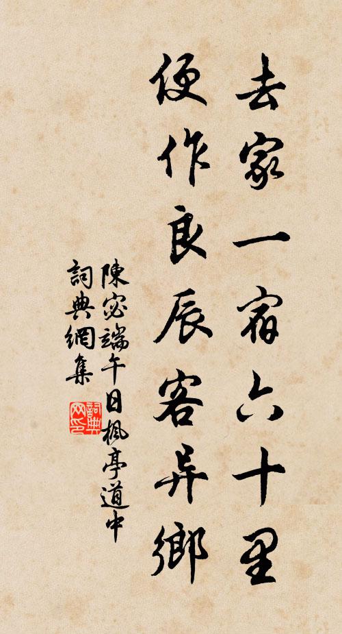 古詩文歷史字典書法欣賞書法字典國語詞典說文解字康熙字典古漢語字典去家一宿六十里,便作良辰客異鄉陳宓 《端午日楓亭道中》名句出處出自宋代陳宓的《端午日楓亭道中》全文:去家一宿六十里,便作良辰客異鄉。覓得菖蒲未成飲,午餘山店索杯嘗。名句書法欣賞去家一宿六十里,便作良辰客異鄉書法作品陳宓名句,端午日楓亭道中名句名句推薦仙家辟穀從誰學,明日無炊即秘方楊萬里《悶歌行十二首》富貴責且重,慚恥心如何李覯《避暑》佳人亦攜手,再往今不同韋應物《過扶風精舍舊居,簡朝宗、巨川兄弟》離懷與企羨,南望長咨嗟徐鉉《送薛少卿赴青陽》相牽浮湛狀菱荇,乍墜出沒真鳧鷗張元乾《贈慶紹上人》老春何足恨,結習本來空虞儔《和勸農詩》作鎮方甘建鄴水,惜賢尤在中興時張嵲《挽張全真詩二首》古石生靈草,長松棲異禽姚合《題杭州南亭》不問神祠賽簫鼓,君臣有道四時調曾協《老農十首》賓客填街復滿坐,片言出口生輝光李頎《雜曲歌辭。行路難》客路黃花晚,江城寒露秋林尚仁《九日登烏回寄鄭渭濱》低飛昏嶺腹,斜足灑岩阿李世民《詠雨》殷勤父老曾無補,待放腰鎌與醉歌陳傅良《桂陽勸農》茱萸細看,明年誰健,空悲身世袁去華《水龍吟(九日次前韻)》遙知花艷驚郎目,幾曲新詩播郢樓宋祁《寄令狐揆二首》詩詞推薦將適毗陵道中遇居簡上人周弼〔宋代〕姑蘇觀下逢居簡,帽子欹斜衣懶散。自言契闊漫東西,雖老猶能青白眼。知音不在禪床久,抱刺懷書謹奔走。反舌泛月乾隆〔清代〕泛月宜何處,山莊景最新。夏宵含颯爽,塞水漾明淪。鶴唳孤松頂,鹿尋曲澗濱。錘峰玉台迥,溫嶠早痴人。書飲客言李復〔宋代〕御史在前執法後,先生飲酒不濡口。脫巾露頂兩腳赤,先生飲酒不論石。試問先生飲何如,舉手指腹此誰測。東家遵大路佚名〔先秦〕遵大路兮,摻執子之祛兮,無我惡兮,不寁故也!遵大路兮,摻執子之手兮,無我醜兮,不寁好也!吹笙歌秦韜玉〔唐代〕信陵名重憐高才,見我長吹青眼開。便出燕姬再傾醑,此時花下逢仙侶。彎彎狂月壓秋波,兩條黃金玄黃霧。逸艷頌古二十九首釋師體〔宋代〕強盜遭逢惡抵家,賊贓才敗別無他。山藤徹骨令 * ,反與渠儂貼面花。春日古道傍作杜牧〔唐代〕萬古榮華旦暮齊,樓台春盡草萋萋。君看陌上何人墓,旋化紅塵送馬蹄?貧女李山甫〔唐代〕平生不識繡衣裳,閒把荊釵亦自傷。鏡里只應諳素貌,人間多自信紅妝。當年未嫁還憂老,終日求媒即道狂。兩意止泓亭趙希發〔宋代〕止泓清而明,如彼秋月滿。以此觀我心,澄源斯過本。華之高壽魯齋先生七十金履祥〔宋代〕穆穆王子,毋靳爾猷。以永斯文,邦家之休。