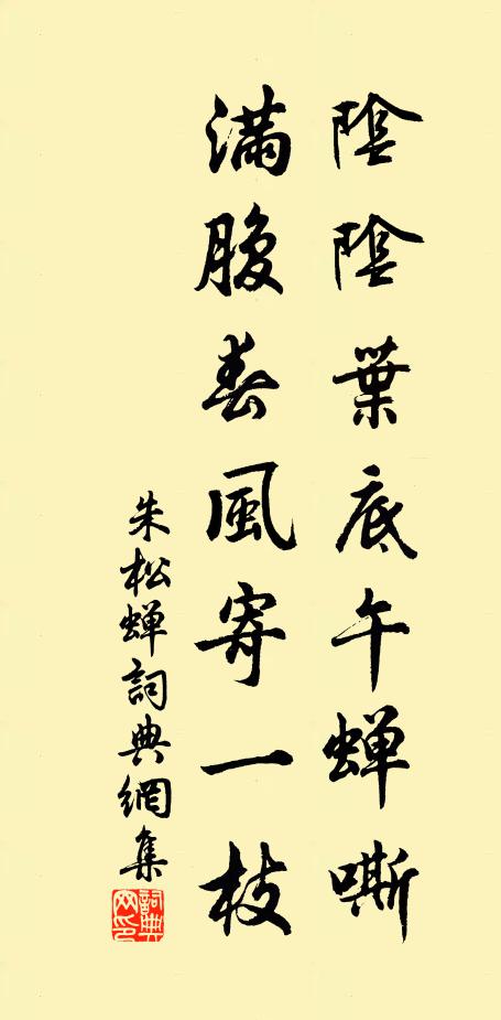 古詩文歷史字典書法欣賞書法字典國語詞典說文解字康熙字典古漢語字典陰陰葉底午蟬嘶,滿腹春風寄一枝朱松 《蟬》名句出處出自宋代朱松的《蟬》全文:陰陰葉底午蟬嘶,滿腹春風寄一枝。下有行人正愁絕,不知幽咽自緣飢。朱松詩詞大全名句書法欣賞陰陰葉底午蟬嘶,滿腹春風寄一枝書法作品朱松名句,蟬名句名句推薦西風吹羽扇,吾道竟淒涼鄧林《書懷》艱難須力濟,氛祲覺潛銷程公許《壽茶使三十韻》淋淳雨珠仟,一一浴未起衛宗武《錢竹深招泛西湖值雨即事》藤蘚半侵剝,風雪幾顛沛杜范《閒行溪西得梅數花喜甚偶成小詩呈諸趙兄》建春不幸成繻葛,割盡流蘇定此時陳普《詠史下陸機》主人濟南舊詞伯,芸閣鉛丹事書冊李復《上巳成季召會於西溪會上賦詩須多韻仍用故事》鳳凰城外橫門道,小妓軍裝金線襖楊維楨《春俠雜詞十二首》南軒學待真傅繹,槃澗家須舊業修項安世《送張子真還鄉待邵州闕》不知初點人何在,只見當年火至今羅隱《長明燈》指畫便分元化力,周回秀絕自清機方乾《鹽官王長官新創瑞隱亭》世間誰是能行者佚名《漁家傲》一夜朔風吹石裂,驚得梅花也瘦,更衣袂、嚴霜寒透趙以夫《賀新郎(四明送上官尉歸吳)》含怨吞聲,兩行清淚,漬透千重鐵張紅橋《念奴嬌·鳳凰山下》傍檐竹雨清,拂案杉風秋皎然《奉和袁使君高,郡中新亭會張鍊師晝會二上人》杯杓悉杉瘤,盤筵盡荷葉皮日休《二游詩任詩》詩詞推薦滿江紅晁端禮〔宋代〕五兩風輕,移舟向、斜陽島外。最好是、瀟湘煙景,自然心會。倒影芙蓉明鏡底,更折花嗅西風裡。待問君、明日寄恆璨韋應物〔唐代〕心絕去來緣,跡順人間事。獨尋秋草徑,夜宿寒山寺。今日郡齋閒,思問楞伽字。明發生米市、西林寺,進退格楊萬里〔宋代〕貪睡能無起,挑燈強未殘。舂聲忙野店,月色澹柴門。又蹈黃塵路,前追紅葉村。秋衣那敢薄,病骨自難溫。贈術者曾豐〔宋代〕莫辦田為活,猶貪祿代耕。區區營一飽,僅僅了餘生。幸脫蛇驚犬,休談戊食庚。他逢豪傑士,口莫惜公卿。春日六絕句楊萬里〔宋代〕霧氣因山見,波痕到岸消。詩人元自懶,物色故相撩。酬通事舍人寓直見示篇中兼起居陸舍人景獻張九齡〔唐代〕軒掖殊清秘,才華固在斯。興因膏澤灑,情與惠風吹。所美應人譽,何私亦我儀。同聲感喬木,比翼謝長離。價以吳山圖記歸有光〔明代〕吳、長洲二縣,在郡治所,分境而治。而郡西諸山,皆在吳縣。其最高者,穹窿、陽山、鄧尉、西脊、銅井。而靈八聲甘州元好問〔元代〕半仙亭籃輿雪中回,黃綢日高眠。兒婚女嫁,奴耕婢織,共有住山緣。夢裡松腴釀熟,竹港咽冰泉。萬古霜空月,晚春宋祁〔宋代〕露花裛裛開還遍,風絮飛飛去不休。春解無情春亦老,欲將寥落與誰愁。記小圃花果二十首劉克莊〔宋代〕累累生滿樹,知我老而饕。絕勝齊三士,輕生為二桃。