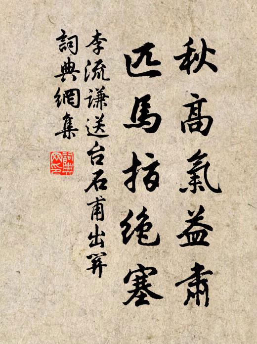 古詩文歷史字典書法欣賞書法字典國語詞典說文解字康熙字典古漢語字典秋高氣益肅,匹馬指絕塞李流謙 《送台石甫出關》名句出處出自宋代李流謙的《送台石甫出關》全文:台君少年時,盛氣不可蓋。冀北駒墮地,過都如歷塊。未說兩石弓,談詩亦堅對。十年憂患繞,玄螭伏淺瀨。寶劍夜韜光,蒼鷹秋折翅。飄風詎終朝,否極理則泰。秋高氣益肅,匹馬指絕塞。酒闌奮袂起,曉色風雨晦。關頭飛將軍,久矣側度待。解鞍握手語,意合琥珀芥。去去未可知,建侯萬里外。兩耳熟高名,邇方揖英概。頗知倜儻士,別意殊憒憒。贈行敢他言,忠義福所介。名句書法欣賞秋高氣益肅,匹馬指絕塞書法作品李流謙名句,送台石甫出關名句名句推薦龍蟄金瓶小,神驅雨陣斜王柏《和汪元思喜雨韻》東周舊耆老,留滯飽知聞張耒《冬日雜書六首》油然翠欲流,剪若陰初疊張鎡《近詩殊少閒行綠陰下喜成雜言以自勉繼此當日》業已通名敢退無,小為性命忍須臾方回《記正月二十五日西湖之游十五首》塵自中秋絕馬鈺《卜運算元》黃雲複壁椒塗蘇,銀床水噴金蟾蜍楊維楨《六宮戲嬰圖》本無鎮浮能,意者造物憐董嗣杲《舟發》坐久煙嵐開翠壁,夢回雲雨起寒潭張耒《和柳郎中舒州潛庵二首》街東街西講佛經,撞鐘吹螺鬧宮庭韓愈《華山女》寒空黯慘塞不開,篵瓊屑玉捲地來陳造《喜雪六首》芳名美譽,鎮平康冠金斗,壓盡滹陽十醜馬致遠《【大石調】青杏子_天賦兩風流》一馬騰騰上翠微,松風瑟瑟解吹衣李流謙《太平宮》可意人如玉吳潛《賀新郎(寓言)》軒昂頭角似真龍,偃仰毛錐有許功邵清甫《蚊龍筆架》驕驄穿柳去,文艗挾春飛趙溍《臨江仙·西湖春泛》詩詞推薦江神子/江城子蘇軾〔宋代〕玉人家在鳳凰山。水雲間。掩門關。門外行人,立馬看弓彎。十里春風誰指似,斜日映,繡簾斑。多情好事與君還孫威敏公輓辭王安石〔宋代〕功名一世事,興廢豈人謀。重為蒼生起,終隨逝水流。淒涼歸部曲,零落掩山丘。許國言猶在,奸諛可使羞。次韻鄧正字慎思秋日同文館九首晁補之〔宋代〕風雲日夕改,秋氣襲堂闈。映葉無蜩響,依叢有蝶歸。官壺催賜酎,鄰杵急成衣。留滯真何補,蒪鱸興又違。螢火張嵲〔宋代〕徂暑初殘夜,飛螢遍曲塘。翕張舒焰短,雨注引輝長。翻屋星移位,窺簾燼吐光。未應彌輦路,聊可映書囊。乍與楊柳詞王鎡〔宋代〕二月垂絲拂翠樓,畫眉如妒逞風流。成花又惹分離恨,去作浮萍送客舟。寄吳德仁兼簡陳季常蘇軾〔宋代〕東坡先生無一錢,十年家火燒凡鉛。黃金可成河可塞,只有霜鬢無由玄。龍丘居士亦可憐,談空說有夜不眠。忽聞萼綠華歌韋應物〔唐代〕有一人兮升紫霞,書名玉牒兮萼綠華。仙容矯矯兮雜瑤珮,輕衣重重兮蒙絳紗。雲雨愁思兮望淮海,鼓 * 條兮駕挽沈提刑李石〔宋代〕金馬堂堂有陸沉,斯人出處可重尋。豸冠議論回天力,繡節平反念母心。一代師承無別派,百年朋舊托遺音。便當夏初臨曹冠〔宋代〕水榭風台,竹軒梅徑,雙溪新創名園。極目遐觀,碧嶺斂散瑤煙。柳塘風皺清漣。爛紅雲、花島爭妍。艷妝佳麗,燕趙汝淳〔宋代〕銜得芹泥入畫簾,江南門巷柳花天。分明社燕催春老,錯向東風恨杜鵑。