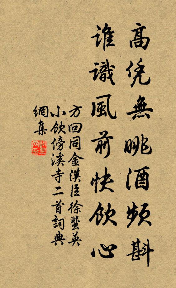 古詩文歷史字典書法欣賞書法字典國語詞典說文解字康熙字典古漢語字典高憑無眺酒頻斟,誰識風前快飲心方回 《同金漢臣徐蜚英小飲傍溪寺二首》名句出處出自宋代方回的《同金漢臣徐蜚英小飲傍溪寺二首》全文:高憑無眺酒頻斟,誰識風前快飲心。州縣長官勝鄰境,秧疇水滿樹林陰。方回詩詞大全名句書法欣賞高憑無眺酒頻斟,誰識風前快飲心書法作品方回名句,同金漢臣徐蜚英小飲傍溪寺二首名句名句推薦煙生山欲盡,春半水爭流釋紹嵩《江上》東南此地關形勝,天柱之峰屹千仞周霆震《古金城謠》謀拙嗟予飄泊,歸來與爾知聞張耒《夜坐三首》忽輕密蔭少休息,肌骨便驚秋氣早蔡襄《聖泉寺松徑》落帽佳辰又到來,黃花爛熳為誰開祖無擇《九日登袁州宜春台》緱氏古城裡,好道王道濟司馬光《謝王道濟惠古詩古石器》輕盈舞殿三千女,縹緲飛天十二台毛滂《對雪二首》三年不識西湖月,一夜初聞南澗鍾楊萬里《江西道院集戊申四月九日得請補外初出國門宿》根莖雜土石,枝葉互長短蘇轍《文與可學士墨君堂》一亭幽入徑,萬竹上參天趙蕃《過叔文園亭題於竹上》歲晚余粳稻,呼兒具餚羞吳則禮《元老見過因育新詩》故人何在?濃蔭深院,斜月幽窗趙雍《【黃鐘】人月圓_人生能幾渾》夫惟至靜者,憂不可保之蘇舜元《地動聊句》紅旆綠油生羽翼,落霞秋水動精神曹彥約《送趙侍朗被召》秋野已澄曠,偶來幽興多梅堯臣《同尹子漸王幾道訪郭生別墅不遇》詩詞推薦挽黃祖勉三首陳著〔宋代〕平生不行怪,流俗自難同。原明無仕志,公休有父風。肯堂勞未艾,反席壽俄終。誰料生芻奠,今年又乃翁。醜奴兒/採桑子黃機〔宋代〕綺窗撥斷琵琶索,一一相思。一一相思。無限柔情說似誰。銀鉤欲寫回文曲,淚滿烏絲。淚滿烏絲。薄倖知他知不送沈子歸江東(一作送沈子福之江東)王維〔唐代〕楊柳渡頭行客稀,罟師盪槳向臨圻。唯有相思似春色,江南江北送君歸。舟中風雨梅公擇有不悅這色因用其韻與解之李彌遜〔宋代〕清於明鑑綠於藍,水色山容總一般。遊子正懷羈旅恨,聊將目力解眉攢。賦竹居文樽熊瑞〔宋代〕郫筒對峙玉清圓,絕勝當年碧筩蓮。傾釀尚侔春楚楚,開樽猶帶雨涓涓。昔遺溪上晉六處,今入飲中唐八仙。一榻高齋誢事詩謝朓〔南北朝〕余雪映青山。寒霧開白日。曖曖江村見。離離海樹出。披衣就清盥。憑軒方秉筆。列俎歸單味。連駕止容膝。空為太常樂章三十首其十六皇帝行奏隆安之曲楊億〔宋代〕禮備樂成,乾健天行。帝容有穆,佩玉鏘鳴。淮陰汪遵〔唐代〕秦季賢愚混不分,只應漂母識王孫。歸榮便累千金贈,為報當時一飯恩。山中作人名詩方岳〔宋代〕負郭太幽深,結茅容易得。雖無桃李園,石老松柏直。山北雨后蒼,山南霽雲白。荷鋤課諸兒,陸續蔬甲拆。宮詞三十三首曹勛〔宋代〕元正不賀自清衷,壑札頻頒念兩宮。天相吉音來自北,便知孝悌與天通。