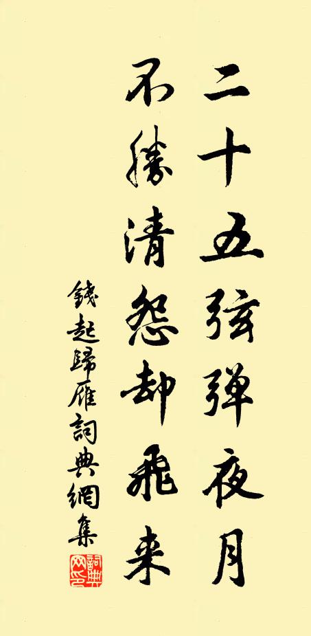 古詩文歷史字典書法欣賞書法字典國語詞典說文解字康熙字典古漢語字典二十五弦彈夜月,不勝清怨卻飛來錢起 《歸雁》名句出處出自唐代錢起的《歸雁》全文:瀟湘何事等閒回,水碧沙明兩岸苔。二十五弦彈夜月,不勝清怨卻飛來。錢起詩詞大全名句書法欣賞二十五弦彈夜月,不勝清怨卻飛來書法作品錢起名句,歸雁名句名句推薦服芰制而荷衣兮,又飾之以江蘺葛立方《九效自修》恁花映春風面毛滂《青玉案》又是春生杜若洲,憑蘭回首總關愁葛起耕《初春感舊》眼蓋乾坤,氣谷佛祖釋普度《虛堂和尚贊》不恨形骸老閭里,遂令唇舌滿長安周文璞《寄友人》精舍買金開,流泉繞砌回孟浩然《題融公蘭若(一作題容山主蘭若)》野芳散紅紫,粲粲五雜組仇遠《次韻蕭饒州見寄》從官俱守道,歸來共閉門韋應物《送端東行》箕踞長松下,橫眠老竹根錢鍾書《山中寓園》彩鳳雙飛穩,霞冠對舞欹夏竦《宣賜翠芳亭雙頭並蒂牡丹仍令賦詩》欲出至珍言,須有至珍意邵雍《歲暮自貽吟》作堂枕水傍風月,想見浩氣盤高空王之道《華亭風月堂避暑》骨朽空名垂斷簡,冢荒殘碣臥蒼苔陸游《遣興》蓐食入雪樓,山深路猶闇舒岳祥《十月五日風》羌廬聚處秋將半,山色湖光翠映璃陳宓《八月十日同潘王游曾城和潘韻》詩詞推薦讀史七首於石〔宋代〕秦亡四海角群雄,三尺胡然起沛豐。首錄酇侯忘紀信,不誅項伯戮丁公。親而寡助寧非叛,國爾忘身始是忠。嘗罰游永就靈岩寺程公許〔宋代〕詰曲山蹊遠世氛,荒寒古寺薦爐熏。清泉迸石韻寒玉,翠邏倚天施白雲。半藏石經真健婦,一龕古貌現聲聞。遲留舟中遇陸棣兄西歸數日得廣陵二三子書知遲晚…墊西岸作蕭穎士〔唐代〕林烏遙岸鳴,早知東方曙。波上風雨歇,舟人叫將去。蒼蒼前洲日,的的回沙鷺。水氣清曉陰,灘聲隱川霧。舊山強酒白居易〔唐代〕若不坐禪銷妄想,即須行醉放狂歌。不然秋月春風夜,爭那閒思往事何?酬丁柴桑陶淵明〔魏晉〕有客有客,爰來宦止。秉直司聰,惠於百里。飱勝如歸,聆善若始。匪惟諧也,屢有良游。載言載眺,以寫我憂。木綿怨方回〔宋代〕湖山一笑乾坤破,欺孤弱寡成遷播。不念六宮將北行,太師雙擁嬋娟臥。甬東香艷到漳南,爭看並蒂芙蓉過。天兵次韻宋尚書山居十五詠臥雲庵方岳〔宋代〕半塢雲侵蘚石床,向來憂樂已俱忘。牆西有竹曾留鶴,夢亦相攜入帝鄉。用名世弟韻許月卿〔宋代〕大圭白璧男兒事,小酌青燈兄弟情。倚閣煙雲生另浦,高林風月滿疏欞。人生工業何損益,外物本心須重輕。志節與虞沔州謁藏真上人戴叔倫〔唐代〕故侯將我到山中,更上西峰見遠公。共問置心何處好,主人揮手指虛空。東陽贈別韋莊〔唐代〕繡袍公子出旌旗,送我搖鞭入翠微。大抵行人難訴酒,就中辭客易沾衣。去時此地題橋去,歸日何年佩印歸。無限
