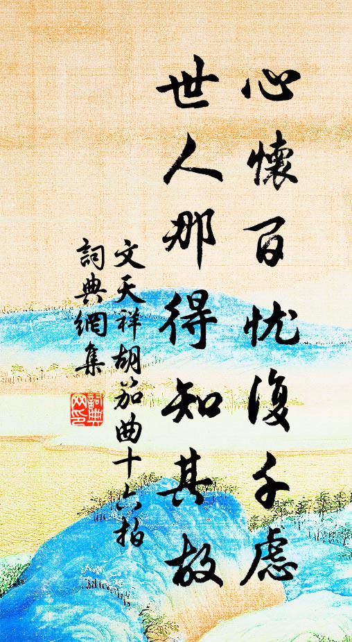 古詩文歷史字典書法欣賞書法字典國語詞典說文解字康熙字典古漢語字典心懷百憂復千慮,世人那得知其故文天祥 《胡笳曲十六拍》名句出處出自宋代文天祥的《胡笳曲十六拍》全文:乃知貧賤別更苦,況我飄轉無定所。心懷百憂復千慮,世人那得知其故。嬌兒不離膝,哀哉兩決絕。也復可憐人,里巷盡嗚咽。斷腸分手各風煙,中間訊息兩茫然。自斷此生休問天,看射猛虎終殘年。名句書法欣賞心懷百憂復千慮,世人那得知其故書法作品文天祥名句,胡笳曲十六拍名句名句推薦二阮年來知健否,季真老去盡歸休賀鑄《再送潘仲寶兼寄彭城交舊》欲上青天愁險絕,誰能為我斬樓蘭魏了翁《十一月九日新灘李□示余開禧三年四月九日所》塞上備胡羌,關中調兵食梅堯臣《送櫟陽宰朱表臣》前夜偷期,相見卻匆匆賀鑄《江城子》赦書一日行千里,罪從大辟皆除死韓愈《八月十五夜贈張功曹》且喜一年年入手佚名《木蘭花/玉樓春》竹簟暑風招我老,玉堂花蕊為誰春蘇軾《玉堂栽花周正孺有詩次韻》臭味果然有投合,及門豈在急摳趨方回《呈閻子靜廉訪翰學二首》觸石和雲積,縈池拂水消楊巨源《春雪題興善寺廣宣上人竹院》一杯有味功名小,萬事無心歲月長陳瓘《吳江鱸鄉亭》草堂須小難為客,霜月正高誰與杯方岳《次韻梅花》寧祛青女威,願盈君子掬席夔《霜菊》白眼睨視,抵掌嘻吁劉宰《寄刑台范黃中》豈無再來期,顧恐非此方張籍《贈姚怤》城市塵埃不見詩,西村東塢可尋誰方回《春晚雜興十二首》詩詞推薦德甫知丞過筠莊溪亭為待月之會戲呈席上諸友李彌遜〔宋代〕載酒何人過子云,傳呼雞犬亦驚奔。門無車馬苔侵徑,坐近池台竹覆尊。好月邀人留晚照,疾雷催雨過前村。獨醒七絕戲改李攀龍《懷明卿》_〔近現代〕豫章西望彩雲間,九派長江九疊山。高臥不須窺石鏡,秋風怒在叛徒顏。隱几葛紹體〔宋代〕分明歸去赤城東,依約醒來客夢中。人靜燈昏卷書坐,一窗明月一簾風。陝下厲玄侍御宅五題吟詩島姚合〔唐代〕幽島蘚層層,詩人日日登。坐危石是榻,吟冷唾成冰。靜對唯秋水,同來但老僧。竹枝題字處,小篆復誰能。鞠歌行李白〔唐代〕玉不自言如桃李,魚目笑之卞和恥。楚國青蠅何太多,連城白璧遭讒毀。荊山長號泣血人,忠臣死為刖足鬼。聽曲立春後作陸游〔宋代〕春不遺窮僻,天如念寂寥。鳥鳴知節換,池溜覺冰消。冷餅供新薺,輕裘換故貂。豐年無疾苦,鄰曲遞相招。偈頌八十七首釋慧開〔宋代〕天下法窟叢林,四月初一結制。無門逐惡隨邪,要效死心舊例,普請諸人腦門著地。雞鳴埭楊備〔宋代〕輦出城時雞未鳴,春羅蟬翼赭袍輕。蒙塵獵騎奔如電,到此聞雞第一聲。送族弟子西赴省楊萬里〔宋代〕吾家詞伯達齋翁,阿季文名有父風。筆陣千軍能獨掃,馬群萬古洗來空。嗟予還笏歸林下,看子乘船入月中。淡墨題四聖觀小蓬萊姚勉〔宋代〕湖光平接碧天開,浮世笙歌下往來。個是蓬萊真絕頂,如何只道小蓬萊。