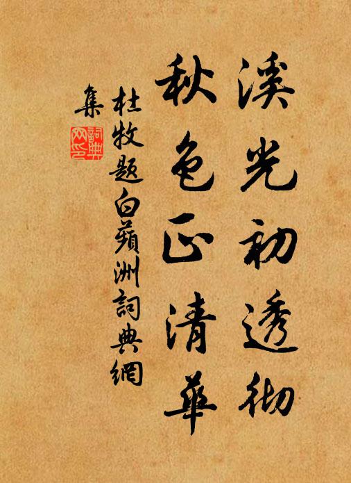 古詩文歷史字典書法欣賞書法字典國語詞典說文解字康熙字典古漢語字典溪光初透徹,秋色正清華杜牧 《題白蘋洲》名句出處出自唐代杜牧的《題白蘋洲》全文:山鳥飛紅帶,亭薇拆紫花。溪光初透徹,秋色正清華。靜處知生樂,喧中見死夸。無多珪組累,終不負煙霞。杜牧詩詞大全名句書法欣賞溪光初透徹,秋色正清華書法作品杜牧名句,題白蘋洲名句名句推薦事與心違方問舍,客將老至合歸田蔡戡《新居偶成二詩洋鄰人李子真》等閒脫體離窠臼,煮粥依前不是羹釋師範《再鑄粥鍋》分得塵勞無著處,不知風月幾時分王邁《因發諸縣催科行移口占呈東卒》一杯節酒莫留殘,坐看新年上鬢端陳與義《除夜次大光韻大光是夕婚》溪畔漁翁蓑又重,幾點沙鷗無語葛長庚《念奴嬌(詠雪)》分明結社戰所兵,投合主司誰得髓李昴英《觀入試者》神鯉為魚長,不肯受辱污舒岳祥《續十蟲吟8》白髮甘凋喪,青雲亦卷舒杜甫《秋日荊南送石首薛明府辭滿告別奉寄薛尚書頌德…三十韻》聊須百斛酒,往醉庾公樓陸游《乘大風發巴陵》近水溪邊嫩枝條,攀折悠颺還似舞宋太宗《緣識》今歲感天公,時有容易雨章甫《雨後十小絕以一雨洗殘暑萬家生早涼為韻》荀卿粗了心形者,蒯徹安知背面哉劉克莊《贈馬相士二首》苕溪楊柳初飛絮,照溪畫眉渡溪去蘇軾《於潛女》徜徉里閭間,脫略世俗縈蘇轍《趙少師自南都訪歐陽少師於潁州留西湖久之作》病多禁未得曾揆《謁金門》詩詞推薦挽王華甫提刑二首劉克莊〔宋代〕丱角從諸老, * 客五侯。風雲疑反手,江海不回頭。寂寂生堪笑,皇皇死未酬。空餘老知識,閉戶著窮愁。寧宗郊祀二十九首學士院〔宋代〕甘露流英,卿雲舒來。靈俞有喜,神光晻曖。穆穆來蒞,洋洋如在。帝用居歆,澤及四海。宮詞張公庠〔宋代〕月華浮動上階棱,侍宴歸來掩繡屏。子夜酒醒蘭燭暗,碧紗窗外度流螢。鷓鴣天臧魯子〔宋代〕虎踞龍蟠萬古雄。橫飛一節大江東。今歸定作鸞坡客,筆底山川寫不窮。吟絮柳,賦東風。年年春在建章宮。天教秋感二首張耒〔宋代〕秋日無遠暉,秋草無美姿。殘蛩吊白日,寒鳥悲空枝。時節一如此,余出悵安歸。強歌不成音,還坐空涕垂。感動海棠凌景陽〔宋代〕名園封植幾經春,露濕煙梢畫不真。多謝許昌傳雅什,蜀都曾未識詩人。棲雲閣佚名〔宋代〕倚天危閣貼重岡,細路縈紆石磴長。曲磵碧流疏宿雨,夾山紅葉助斜陽。歸朝歡·別岸扁舟三兩隻柳永〔宋代〕別岸扁舟三兩隻。葭葦蕭蕭風淅淅。沙汀宿雁破煙飛,溪橋殘月和霜白。漸漸分曙色。路遙山遠多行役。往來人,瑯琊山中廢寺戴復古〔宋代〕欲訪山中寺,沿堤石甃長。寶坊兵後廢,御帖窯中藏。故址生秋草,寒窗帶夕陽。孤僧出迎客,滿口話淒涼。郊外即事胡仲弓〔宋代〕林密深藏三四家,隔牆古柳著棲鴉。牧童兩兩眠芳草,不管群牛食豆花。