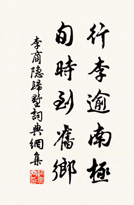 古詩文歷史字典書法欣賞書法字典國語詞典說文解字康熙字典古漢語字典行李逾南極,旬時到舊鄉李商隱 《歸墅》名句出處出自唐代李商隱的《歸墅》全文:行李逾南極,旬時到舊鄉。楚芝應遍紫,鄧橘未全黃。渠濁村舂急,旗高社酒香。故山歸夢喜,先入讀書堂。名句書法欣賞行李逾南極,旬時到舊鄉書法作品李商隱名句,歸墅名句名句推薦江淮旱久塵土惡,朝來清雨濯鬢須蘇軾《喜劉景文至》蜀山春動錦江流,水綠山青總是愁周麟之《望秦川歌》應兮珠盤不撥而自轉,湛兮玉井隨汲而彌深釋正覺《從首座畫予於松石間求贊》幄中欲寄畫,才智莫有君梅堯臣《送王樂道太丞應瀛州辟》新買紫騮馬,欲歸清弋江梅堯臣《弟著作宰南陵》從此明鏡中,不嫌頭似雪白居易《聞哭者》一舸下東吳張之翰《木蘭花慢 送趙治中》塵棲故苑,嘆璧月空檐,夢雲飛觀高觀國《齊天樂·碧雲闕處無多雨》人生七十古來少,前除幼年後除老唐寅《一世歌》昔同奉祭籩,今自享酹卮韓維《冬至日作》蟻戰蝸爭那復問,魚浮鳥戲自相親郭印《春日雲溪即事二首》龍門世莫攀,冰鑑古無匹楊冠卿《秋日自武林病歸漁社李使君惠以長篇誦之再四》白頭見太平,酒醒豁所懷晁說之《曉霽》復有高人乘興至,為題佳句遍雕甍聞人安壽《題招提院靜照堂》洞房一夜照花燭,卿卿嫁作他人婦倉央嘉措《情詩其十一》詩詞推薦寄棲白大師二首貫休〔唐代〕流浪江湖久,攀緣歲月闌。高名當世重,好句逼人寒。月苦蟬聲嗄,鍾清柿葉乾。龍鍾千萬里,擬欲訪師難。蒼蒼建炎庚戌中秋夜與同官相期於月下既為頑雲障馮時行〔宋代〕散懷誰與儔,風月茲吾賞。好景會人心,宿約每不爽。蓐收濺明河,玉露洗穹壤。肅肅夜氣寂,皎皎素沆漭。飛出送李定言南遊許渾〔唐代〕酒酣輕別恨,酒醒復離憂。遠水應移棹,高峰更上樓。簟涼清露夜,琴響碧天秋。重惜芳尊宴,滿城無舊遊。訴衷情(一名一絲風)溫庭筠〔唐代〕鶯語,花舞,春晝午,雨霏微。金帶枕,宮錦,鳳凰帷。柳弱燕交飛,依依。遼陽音信稀,夢中歸。東坡三絕句蘇籀〔宋代〕嶺背泉甘陵谷遷,危亭圜顧尚依然。春蘭秋菊無終古,地上居人世世賢。故刑部李尚書輓詞三首張九齡〔唐代〕仙宗出趙北,相業起山東。明德嘗為林,嘉謀屢作忠。論經 * 殿,獻賦甘泉宮。與善今何在,蒼生望已空。宿昔中秋京師對月強至〔宋代〕今夜皇州月,秋光共幾分。未全成皓魄,猶勝隔浮雲。白髮愁偏照,清樽喜獨醺。遙憐江國弟,北望首殷勤。句陳詠〔唐代〕隔岸水牛浮鼻渡,傍溪沙鳥點頭行。夜宿青原寺感懷文天祥〔宋代〕松風一榻雨蕭蕭,萬里封疆夜寂寥。獨坐瑤琴悲世慮,君恩猶恐壯懷消。和懷玉本老徐元傑〔宋代〕失腳天台絕頂峰,又來懷玉亂山中。瓊橋去後無訊息,禪月重重有案公。