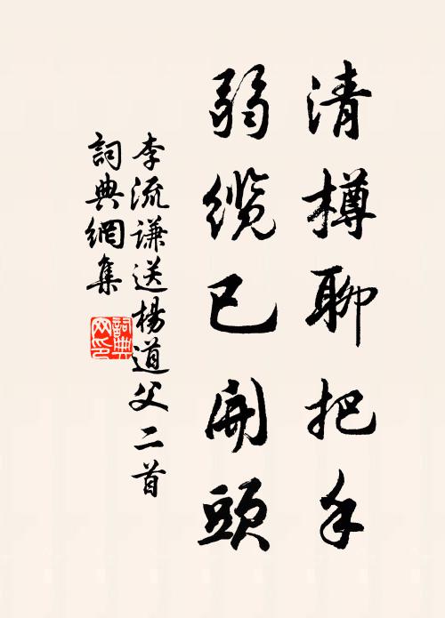 古詩文歷史字典書法欣賞書法字典國語詞典說文解字康熙字典古漢語字典清樽聊把手,弱纜已開頭李流謙 《送楊道父二首》名句出處出自宋代李流謙的《送楊道父二首》全文:遂決乘桴計,初無判袂愁。清樽聊把手,弱纜已開頭。懿戚今元老,鄉邦子俊流。等閒垂一臂,談笑上瀛洲。名句書法欣賞清樽聊把手,弱纜已開頭書法作品李流謙名句,送楊道父二首名句名句推薦想一葉怨題,今在何處周邦彥《掃地花(雙調)》平生清淨禪,猶嫌被詩污釋文珦《遣興》殷勤好去武陵客,莫引世人相逐來陳羽《伏翼西洞送夏方慶》春風東來暖如噓,過拂我面撩我裾王令《春風》鳥聲雲里出江總《侍宴玄武觀詩》星魄媼神聯紺席,文宗武祖侑瑤觴宋庠《和中丞晏尚書圓丘觀禮》野色兼山遠,溪流漲雨渾宋祁《春郊曉望》飛蓋多邀客,停車數問農司馬光《潞公游龍門光以室家病不獲參陪獻詩十六韻》誰無蘭蕙姿,誰無桃杏葩杜范《三用韻謝孫花翁趙寬堂趙貴方見和》階前紫蔓金絲草,籬角紅垂錦帶花仇遠《閒十詠》雨添山翠重,舟壓浪花分陸游《涪州道中》旃檀林,任馳驟釋有權《偈三首》絲毫美政何曾有,惟把豐年贈漢嘉陸游《癸巳夏旁郡多苦旱惟漢嘉數得雨然未足也立秋》跳出火宅三界外,四衢露地白牛山主《臨江仙》或魑魅隱見,或虎豹躑躅葛紹體《頭陀嶺》詩詞推薦題臨賦軒洪邁〔宋代〕蒼山圍岑寂,下有一水奔。閉戶臥風雨,束蒿翳籬藩。寥哉只樹人,心遠忘世喧。此身自蘧廬,長物余此軒。鳥語上運管張平國華岳〔宋代〕武城三載促公歸,自合班行列禁闈。計幕暫參知有在,野夫曾此便橫飛。秦樓月蒲道源〔元代〕宸京里。玉卮為壽龍顏喜。龍顏喜。天開盛旦,日膺繁祉。蠻荒凱奏風塵弭,群臣虎拜同歸美。同歸美。山呼萬歲水龍吟 暇日過田學士村居,乃父為司徒張野〔元代〕翠微冷浸清溪,洞天惟許仙家住。主人新葺,柳亭梅塢,竹軒松戶。綠野風煙,東山泉石,少人知處。怕椿翁早晚雜詠五首架檐藤儲光羲〔唐代〕得從軒墀下,殊勝松柏林。生枝逐架遠,吐葉向門深。何許答君子,檐間朝暝陰。頌古三十一首釋玿〔宋代〕夢中要渡深溪水,伎倆多般進不能。驀地覺來伎倆盡,床頭山月已三更。驀山溪(和趙粹文元宵)洪皓〔宋代〕鰲山鳳闕,多少飛瓊侶。顒俟翠華臨,慶新春、金波盈五。蓮燈開遍,侍從盡登樓,簪花赴。傳柑處。咫尺聆天語旬休日過仁王寺曾鞏〔宋代〕雜花飛盡綠陰成,處處黃鸝百囀聲。隨分笙歌與樽酒,且偷閒日試閒行。淳化鄉飲酒三十三章佚名〔宋代〕洋洋嘉魚,儜以芳罟。君子有德,嘉賓式歌且舞。入青城山門詩程公許〔宋代〕一逕石牆分竹色,兩橋澗水和松風。山靈憐我嗜幽勝,洗山林巒晚照紅。