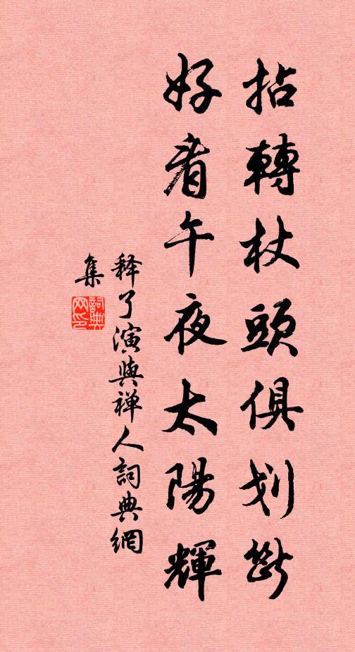 古詩文歷史字典書法欣賞書法字典國語詞典說文解字康熙字典古漢語字典拈轉杖頭俱劃斷,好看午夜太陽輝釋了演 《與禪人》名句出處出自宋代釋了演的《與禪人》全文:家山有路應須到,到得家山未是歸。拈轉杖頭俱劃斷,好看午夜太陽輝。釋了演詩詞大全名句書法欣賞拈轉杖頭俱劃斷,好看午夜太陽輝書法作品釋了演名句,與禪人名句名句推薦刑措甫自今沈約《梁鞞舞歌 明之君 二》投身伴鴞鵬,矯首瞻洛雍項安世《次韻江陵張書記送行》曲島浮觴酌,前山入詠歌孟浩然《宴張記室宅》卻詵丹桂早,萊子彩衣鮮黃公度《送龔實之赴官南安十韻》西斜日影簾牙陸文圭《減字木蘭花慢 和心 春雪詞》持茲竟安歸,引燈相與共孫應時《送張敬夫栻以追送不作遠為韻賦詩五章藉手言》載培逾一紀,補苴又三年方回《園感》麟鳳隔雲攀不及,空山惆悵夕陽時李洞《寓言》道秘未傳鴻寶術,院深時聽步虛聲徐鉉《贈王貞素先生》受命恤人隱,茲游久未遑韋應物《游琅琊山寺》如斯旨趣,即是平生佚名《漁家傲》欲過鄭老論心事,可惜相逢各異鄉楊公遠《用前韻酬鄭山長》不寧充幃悅鼻觀,正自紉佩持吾身周必大《寄題新居羅長卿觀瀾閣蘭堂二首》且親輕相可,梅非多可人方蒙仲《以詩句詠梅一樹橫斜獨可人》試問鄰公可相傳,一言許肯更無難呂岩《鄂渚悟道歌》詩詞推薦送劉漢特兼簡邵子文李新〔宋代〕綠篠欹牆葉葉聲,夜涼風細露華清。飄零何幸逢公子,邂逅相看不世情。擬向伯倫求酒頌,不知東野解詩鳴。三峰上後樂劉先生左史十首用襄陽詩兩句行藏堅晚程公許〔宋代〕永平昔全盛,舊學尊五更。異哉趨舍繆,眩眼車服榮。恭惟自孔氏,時止亦時行。心泰無不足,外內誰重輕。記夢陸游〔宋代〕旅夢遊何地?分明禹廟傍。不嫌村餉薄,但愛野蔬香。筍市連山塢,菱歌起夕陽。一蓑元所樂,枉道嬾衣裳。東齋陸游〔宋代〕著腳紅塵已恨深,便應畢世住山林。貴人自作宣明面,老子曾聞正始音。議論坐狂當永棄,簿書緣病復難任。東齋緣識宋太宗〔宋代〕故無形像顯教尋,隱秘蹤由自古今。妙法不傳經上字,玄門訊息罔知深。偶題鄭獬〔宋代〕寸心不著一塵飛,坐見孤雲冉冉歸。萬境去來無不可,白鷗爭得見忘機。晚涼洪咨夔〔宋代〕樛枝陰合翠熏籠,曲曲斜斜石徑通。窈眇蟬聲繰獨繭,為渠立盡晚來風。病起釋慧空〔宋代〕老僧頭風,一月兩發。見粥便嘔,見飯便噦。死又不死,活又不活。使他諸人,冷地忙殺。觀音勢至,候飢候渴。離家袁不約〔唐代〕步步遠晨昏,淒心出里門。見烏唯有淚,看雁更傷魂。宿酒寧辭醉,回書諱苦言。野人應怪笑,不解愛田園。浣溪沙閻選〔唐代〕寂寞流蘇冷繡茵,倚屏山枕惹香塵,小庭花露泣濃春。劉阮信非仙洞客,嫦娥終是月中人,此生無路訪東鄰。