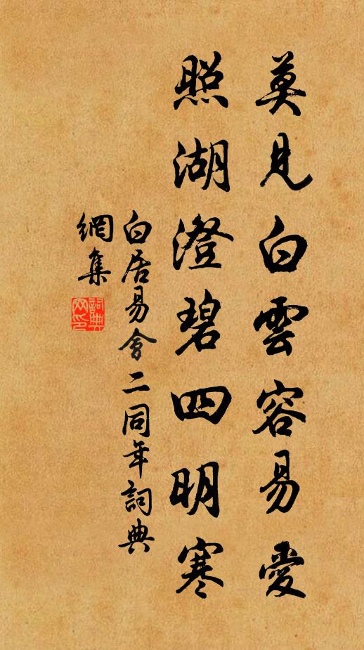 古詩文歷史字典書法欣賞書法字典國語詞典說文解字康熙字典古漢語字典莫見白雲容易愛,照湖澄碧四明寒白居易 《會二同年》名句出處出自唐代白居易的《會二同年》全文:一樽聊接故人歡,百歲堪嗟鬢漸殘。莫見白雲容易愛,照湖澄碧四明寒。名句書法欣賞莫見白雲容易愛,照湖澄碧四明寒書法作品白居易名句,會二同年名句名句推薦難似玉肌,總驚花貌,壓倒芳菲趙長卿《柳梢青(東園醉作梅詞)》遂轉死溝洫鮑照《代貧賤苦愁行》知他睡穩無石孝友《更漏子》著心計較般般錯,退步思量事事寬。余洪道《句》世稱生佛子、派接清原彭耜《婆羅門引(壽長老)》漁市關門早,征帆入浦忙李齊賢《巫山一段雲 西江風雪》忽遇此林師子子,萬般伎倆一時休釋善能《頌古二首》新詩相賀來何晚,湯餅惟公不在堂鄭剛中《甲辰年得男子經道以詩相賀因報之》寒往暑來相尋陸機《上留田行》騎驢何似賈司倉,行李唯余古錦囊毛滂《仁義驛中》共向花前圖瑞勝,試看池上動輕苔林滋《人日》一雨東郊捲夕雲,山中坐對寂寥春宋祁《山中清明》石岩兩相束,竹樹交柯綠張嵲《六月初七日雨小止游蒲溪臨獨木橋而還》佳句獨高珠履上,貴名都忘玉樽前強至《依韻奉和司徒侍中辛亥三月十八日游御河二首》捷書夜半甘泉去吳潛《賀聖朝》詩詞推薦青梅梅堯臣〔宋代〕梅葉未藏禽,梅子青可摘。江南小家女,手弄門前劇。齒軟莫勝酸,棄之曾不惜。寧顧馬上郎,春風滿行陌。送金潮州三首劉克莊〔宋代〕潮人無計駐軒車,來扇仁風僅歲餘。棘院從今添立鵠,金堤亘古免為魚。真堪香火陪韓廟,誰採風謠繼葉渠。曾忝二十七日作趙蕃〔宋代〕卜居面勢隘,附山枕林麓。曠瞻既無地,何以慰羈束。昏昏半月雨,候應黃梅熟。晨興更涼冷,轉午增蒸溽。山蟬華隱樓曾極〔宋代〕松聲只罷獨看雲,華隱樓中探鶴身。治國神方難自獻,祗將本草語時人。聞徐右史暴亡區仕衡〔宋代〕議論風生神采端,一身不保更論官。泉台此恨誰能訴,雪涕空山白日寒。次楊樂道韻六首其二——御溝王安石〔宋代〕渺渺金河漲欲平,數支分綠報清明。常縈輦路漂花去,更引流杯送酒行。靜見金輿穿樹影,清含玉漏過牆聲。衰顏食後王績〔唐代〕田家無所有,晚食遂為常。菜剪三秋綠,飧炊百日黃。胡麻山麨樣,楚豆野麋方。始暴松皮脯,新添杜若漿。葛花偈頌六十五首釋普濟〔宋代〕堂中首座人在眼,漢語胡言大藏經。七百衲僧吞佛祖,靈山樂得做閒人。趙園看白牡丹陳郁〔宋代〕園林物物挾春光,獨許名花壓眾芳。雨艷寒輕清入骨,雪膚香蒙白含間。仙人聚上誇能染,學士承恩賦倚妝。幾欲雜曲歌辭。車遙遙張籍〔唐代〕征人遙遙出古城,雙輪齊動駟馬鳴。山川無處無歸路,念君長作萬里行。野田人稀秋草綠,日暮放馬車中宿。驚鹿