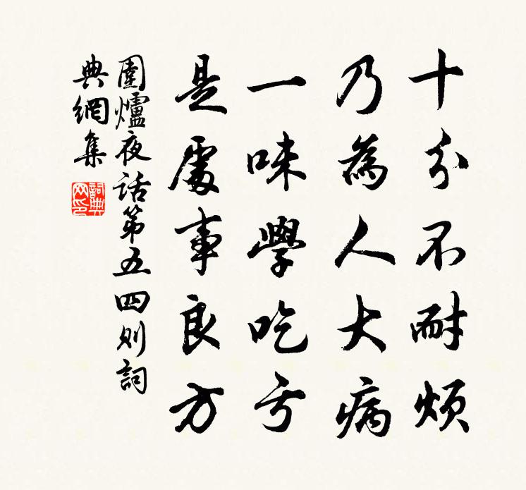 古詩文歷史字典書法欣賞書法字典國語詞典說文解字康熙字典古漢語字典十分不耐煩,乃為人大病;一味學吃虧,是處事良方。王永彬 《圍爐夜話·第五四則》名句出處摘自《圍爐夜話·第五四則》解釋:對人對事不能忍受麻煩,是一個人最大的缺點。對任何事情都能抱著寧可吃虧的態度,便是處理事情最好的方法。原文摘要:十分不耐煩,乃為人大病;一味學吃虧,是處事良方。名句書法欣賞十分不耐煩,乃為人大病;一味學吃虧,是處事良方。書法作品王永彬名句,圍爐夜話·第五四則名句名句推薦錦里開芳宴,蘭缸艷早年。盧照鄰《十五夜觀燈》兼相愛,交相利。墨子《墨子·15章 兼愛(中)》千虛不如一實。馮夢龍《警世通言·卷三》聖人不積,既以為人,己愈有,既以與人,己愈多。天之道,利而不害;聖人之道,為而不爭。老子《老子·德經·第八十一章》同聲相應,同氣相求。佚名《易傳·乾文言》歲夜高堂列明燭,美酒一杯聲一曲。李頎《聽安萬善吹觱篥歌》夫死戰場子在腹,妾身雖存如晝燭。張籍《征婦怨》可惜重陽,不把黃花與。吳文英《蝶戀花·九日和吳見山韻》笙歌散盡遊人去,始覺春空。歐陽修《採桑子·群芳過後西湖好》水溢芙蓉沼,花飛桃李蹊。薛道衡《昔昔鹽》正單衣試酒,恨客里、光陰虛擲。周邦彥《六醜·落花》殘螢棲玉露,早雁拂金河。許渾《早秋三首·其一》綠楊芳草長亭路。年少拋人容易去。晏殊《玉樓春·春恨》柳梢聽得黃鸝語,此是春來第一聲。楊載《到京師》父兮生我,母兮鞠我。佚名《蓼莪》詩詞推薦譚勝仲卿有冊寶禮成新句用韻和呈卷剛中〔宋代〕寶函重鎖環金密,冊櫝雙盤帶錦斜。長樂春風迎母后,未央和氣集皇家。簾垂禁衛收黃繖,禮畢天仙下玉華。班退代秋胡歌詩 其一嵇康〔兩漢〕富貴尊榮。憂患諒獨多。富貴尊榮。憂患諒獨多。古人所懼。豐屋蔀家。人害其上。獸惡網羅。惟有貧賤。可以無淳熙二的春帖子詞壽聖明慈太上皇后合六首崔敦詩〔宋代〕玉管和聲度,金鋪麗景遲。思齊文母聖,春日受春祺。趙嘉父送松江蟹高似孫〔宋代〕青天肯為蟹飛霜,蟹亦貪詩老更狂。楓葉已隨詩共冷,菊花能為酒先忙。平生爾雅誰能熟,此去玄經孰敢荒。前去一落索(牡丹次謝主簿韻)趙以夫〔宋代〕露沁香肌嬌秀。燕脂微透。蕊宮仙子駕祥鸞,被風卷、霞衣皺。輕翦倩他紅袖。簪來盈首。直須沈醉此花前,怕花贈別顯上人釋紹嵩〔宋代〕兩浙尋山遍,依稀三十秋。征塵添老色,藜杖賦歸休。落葉隨杯渡,殘虹帶夕收。不知從此去,能寄短書不。霜天曉角(趙簿席上寫目前之景)郭應祥〔宋代〕琉璃十碗。獸炭紅爐暖。花下兩枝銀燭,和氣洽、歡聲滿。從他吹急管。杯行須款款。盡做更移漏轉,也猶勝、春斑竹(得之湘流)元稹〔唐代〕一枝斑竹渡湘沅,萬里行人感別魂。知是娥皇廟前物,遠隨風雨送啼痕。至揚州文天祥〔宋代〕苦作江頭乞食翁,一層破廟五更風。眼前境界身何許,始悟人間萬法空。春雁王恭〔明代〕春風一夜到衡陽,楚水燕山萬里長。莫怪春來便歸去,江南雖好是他鄉。