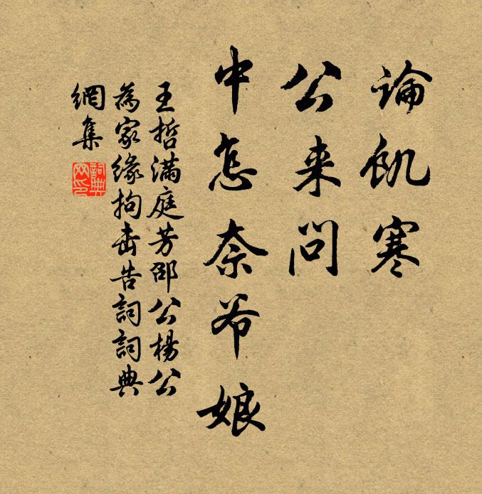 古詩文歷史字典書法欣賞書法字典國語詞典說文解字康熙字典古漢語字典論饑寒,公來問,中怎奈爺娘王哲 《滿庭芳 邵公楊公為家緣拘擊告詞》名句出處出自元代王哲的《滿庭芳 邵公楊公為家緣拘擊告詞》全文:論饑寒,公來問,中怎奈爺娘。牽兒絆,妻室惱愁腸。卦分明有說,田正、震地清涼。南看,前一點,何不*時詳。琅。序至,金木水,火放炎光。然見真景,本有舒張。睹紅霞出入,開後、慧刃揮鋼。花綻,系接引,永永滿庭芳。名句書法欣賞論饑寒,公來問,中怎奈爺娘書法作品王哲名句,滿庭芳 邵公楊公為家緣拘擊告詞名句名句推薦蓼岸飛寒蝶,汀沙戲水禽。宋光宗《句》人從南浦別,客向洞庭歸宋祁《送人歸衡陽》何時共結柴桑社,籬下烽來菊正繁韓元吉《過龐佑甫》長沙妙跡誰傳寶,龍閣精神學士心王佐才《劉帥畫道林冬景》書覽五言城,中宵勞夢蝶史彌寧《六亭為邵陽登臨之勝識其名於千岩之詩稔矣乃》人情風上草,身世眼中沙虞儔《無眠》日日悲傷未有圖,懶將心事話凡夫王福娘《問棨詩》一官早見縻,微尚久未償賀鑄《宿法惠寺》會合亦何事,無言對空枰蘇軾《初別子由》晴放湖光,雨添山色,誰識總相宜處楊無咎《夜行船》力行可使金如土,篤好能徠馬若龍陸游《讀唐書》二年直綸閣,三年刺史堂白居易《洛中偶作(自此後在東都作)》吳溪浣紗女,不用朱粉施黃庭堅《次韻答黃與迪》一望卻疑非李齊賢《巫山一段雲 山市晴嵐》包括乾坤,含容天地,日月皆收蓄侯善淵《酹江月》詩詞推薦再次韻四首陳造〔宋代〕犖确悍頑經數驛,醒然初挹碧嶙峋。眼明驟與真山晤,不比逃虛見似人。題竹秦韜玉〔唐代〕削玉森森幽思清,院家高興尚分明。捲簾陰薄漏山色,欹枕韻寒宜雨聲。斜對酒缸偏覺好,靜籠棋局最多情。卻驚緣識宋太宗〔宋代〕每逢清夜坐更深,白日忙忙各是情。南北東西誰定準,無窮天地始知名。挽秦國夫人李流謙〔宋代〕鸞衿榮翠栝,璇魄媚方流。慶襲高華出,賢供窈窕求。靈光分婺照,靜質肖坤柔。閨闥關何事,風人美造周。金陵上李公垂侍郎殷堯藩〔唐代〕海國微茫散曉暾,郁蔥佳氣滿乾坤。六朝空據長江險,一統今歸新地尊。西北諸峰連朔漠,東南眾水合崑崙。願從詩送讀易堂張碧窗之揚陳著〔宋代〕占得資身話柄高,六鰲島上足逍遙。南風又送飛霞佩,北道相期明月橋。要坐虎皮專說易,肯攜鳳侶共 * 。此行惜黃花許將〔宋代〕雁聲晚斷。寒霄雲卷。正一枝開,風前看,月下見。花占千花上,香笑千香淺。化工與、最先裁翦。誰把瑤林,閒句趙休〔唐代〕金莖來白露,玉宇起清風。于闐鍾歌送靈徹上人歸越(鍾在越靈嘉寺,從天竺飛來)竇庠〔唐代〕海中有國傾神功,烹金化成九乳鍾。精氣激射聲沖瀜,護持海底諸魚龍。聲有感,神無方,連天雲水無津梁。不知夏日湖上訪隱士徐璣〔宋代〕煩暑何能避,孤舟訪隱人。水鄉菱藕熟,晴野稻苗新。為學師前輩,談空悟宿身。鏡湖三百頃,不似此湖濱。