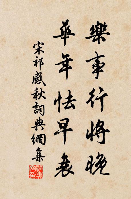 古詩文歷史字典書法欣賞書法字典國語詞典說文解字康熙字典古漢語字典樂事行將晚,華年怯早衰宋祁 《感秋》名句出處出自宋代宋祁的《感秋》全文:樂事行將晚,華年怯早衰。翻車壯士速,落葉長年悲。別燕風簾靜,驚烏月樹危。播精寧有用,皮骨極支離。名句書法欣賞樂事行將晚,華年怯早衰書法作品宋祁名句,感秋名句名句推薦歸來共棲集謝朓《夏始和劉潺陵詩》將雲帶月入東門毛滂《浣溪沙》平生江海意,惟共白鷗同劉長卿《禪智寺上方懷演和尚,寺即和尚所創》門回暮臨水,窗深朝對山白居易《和鄭元及第後秋歸洛下閒居( 同高侍郎下隔年及第)》小閣枕清流,一霎蓮塘雨蔡伸《卜運算元》北風夜捲地,凍雲曉黏天周麟之《辛酉大雪戲成二詩以千山鳥飛絕萬逕人蹤滅為》我將我享,相興乃登真宗《上欽成皇后冊寶六首》真座金毛師子,微放珠光白居易《行香子》瘦便藤杖細,涼覺葛衣輕趙師秀《秋色》林亭一出宿風塵,忘卻平津是要津白居易《宿裴相公興化池亭(兼蒙借船舫游泛)》君王在昔曾游幸,故老猶今述見聞釋文珦《洞霄宮》恰莫持千萬,明明買禍胎陸龜蒙《黃金二首》蒼蒼宰樹起寒煙,尚有威名海內傳劉禹錫《王思道碑堂下作》緬懷揖讓風,黃屋身如寄劉子翬《建康六感宋》霧縠霞綃,聞綺羅裁翦盧祖皋《錦園春三犯(賦牡丹)》詩詞推薦戴縣丞輓詞樓鑰〔宋代〕高士終為簿,豈惟勾小稽。鸞凰雖在棘,桃李自成蹊。官府資關決,儒流仰品題。定知餘慶遠,遺愛滿雙谿。雨後張嵲〔宋代〕一雨稻畦春水足,苦遭鳴蟈故相喧。不妨信馬東城路,行看林花落古原。月夜阻風,泊舟太湖石塘南頭四首楊萬里〔宋代〕過湖未得匹如閒,何幸湖心泊畫船。宇宙中間都是月,波濤外面更無天。誰知造物將奇觀,不與傖人付謫仙。管領賦得送賈島謫長江李洞〔唐代〕敲驢吟雪月,謫出國西門。行傍長江影,愁深汨水魂。筇攜過竹寺,琴典在花村。飢拾山松子,誰知賈傅孫。哭鄒德久二首用前韻張元乾〔宋代〕窮達那知十二宮,由來與世不相容。乃翁極諫牽龍袞,百謫同愁割劍峰。前輩品題推玉樹,平生憂患挺蒼松。傷心夜歸鹿門山歌 / 夜歸鹿門歌孟浩然〔唐代〕山寺鐘鳴晝已昏,漁梁渡頭爭渡喧。人隨沙路向江村,余亦乘舟歸鹿門。鹿門月照開煙樹,忽到龐公棲隱處。岩扉寄春曲楊維楨〔元代〕春從天上來,幾日到章台?憑語青青柳,飛花莫浪催。寄中山隱講師張憲〔元代〕問訊山中隱,中山第幾重?風廊巡夜虎,雲缽聽經龍。流水千溪月,寒岩一樹松。無因淨渣滓,來共上堂鍾。乳燕飛/賀新郎徐經孫〔宋代〕一雨炎□洗。似天知、溪山佳處,玳筵珠履。六十年前今朝慶,門左桑弧蓬矢。也似恁、郁蔥佳氣。綠鬢童顏春未陳正叔縣尉見示所著詩文以詩謝之孫應時〔宋代〕文章千古一毫端,妙處工夫到底難。春色無邊知造化,海風不斷識婆瀾。看君健筆凌霄漢,照我清窗醒肺肝。寶劍