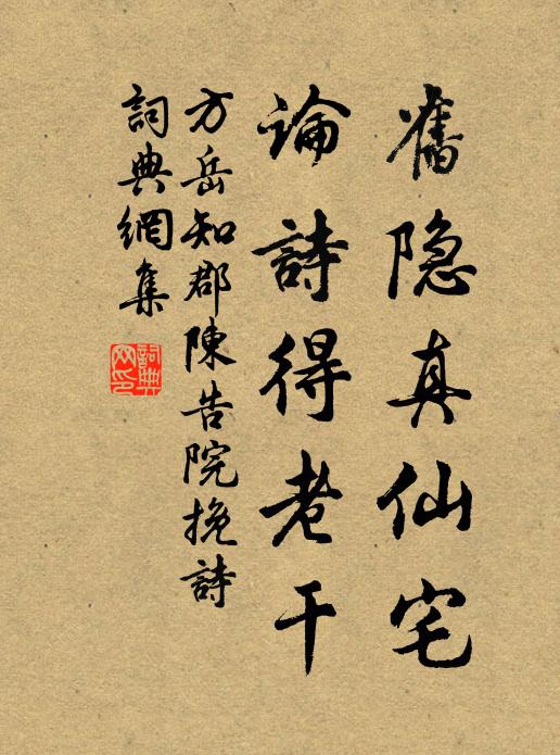 古詩文歷史字典書法欣賞書法字典國語詞典說文解字康熙字典古漢語字典舊隱真仙宅,論詩得老乾方岳 《知郡陳告院輓詩》名句出處出自宋代方岳的《知郡陳告院輓詩》全文:舊隱真仙宅,論詩得老乾。雲深海屋古,書擁雪燈殘。一棹橫秋色,九華生暮寒。空餘青眼在,肯作故人看。方岳詩詞大全名句書法欣賞舊隱真仙宅,論詩得老乾書法作品方岳名句,知郡陳告院輓詩名句名句推薦蒼蒼無一閒枝葉,子落叢林也有香釋普濟《柏岩》翦棘移門未費錢,好山無數碧巉然陸游《新作南門》昔出長安道,獨游隋苑東修睦《岳陽對柳》水邊籬落好,一夜玉為堂許月卿《霜日》雒邑鎬京相對峙,萬年周業付神孫魏吉甫《早朝》四之日其蚤,獻羔祭韭佚名《七月》符檄積几案,寢飯於其間陸游《秋興》鳳尾羅衾寒尚怯,卻悔當時,容易成分別劉天迪《蝶戀花》明揚實濫吹庾信《謹贈司寇淮南公詩》遍體鱗傷,直把心傷透顧隨《蝶戀花 前意不暢,再賦此即寄蔭君。》私嘗嘖嘖,嘆公不逢釋善珍《祭靜江帥曾吏部》天下廣居君識否?一間茆屋寄孤村陸游《雜賦》累去千憂盡,中恬四體輕夏竦《送吳興使君郎中分務歸姑蘇》顒顒集癯仙,娟娟羅靜女李彌遜《秋居雜詠十首》學道未有得,自欺誰不爾蘇軾《和陶讀《山海經》》詩詞推薦和慎思秋日同文館詩蔡肇〔宋代〕秸卵因時化,如何赴越雞。逸群來冀北,屏氣入淮西。盛事兼三物,浮辭斥百題。慎須精藻鑒,寵辱異雲泥。嚴教授畫臨濟請贊釋曇華〔宋代〕喝下忽雷驚,聲前休領略。當鋒齧鏃時,蹉過第一著。不在壁立處,豈向平地泊。野水白連天,秋空飛一鶚。點絳唇趙長卿〔宋代〕密雨隨風,咋來一夜檐聲溜。奈何僝僽。官路梅花瘦。賦得多情,怕到春時候。如今一病非因酒。試問君知否。吳王井楊備〔宋代〕石甃遺蹤傍古台,一泓寒影鑒光開。何人照面金釵落,曾見越溪紅粉來。和徐季功舒蘄道中二十首王之道〔宋代〕灊皖歸來麥已秋,相從時說白雲遊。八年不踐同安境,夢裡山溪記舊由。歸隱嵩陽張詠〔宋代〕浮世事無限,何須要到頭。壯心為客盡,孤跡臥雲休。匣劍已全棄,林僧亦少酬。從來愁恨意,乞待外人愁。望花山張老家戴復古〔宋代〕元從邊上住,來此避兵興。麥麨朝充食,檢明夜當燈。蔽門麻菶菶,護壁石層層。老嫗逢人哭,吾兒在謝陵。偈頌六十七首釋原妙〔宋代〕巴陵設忌三轉語,西峰單單只一句。{上浙下耳},逢人切忌錯舉。寄懷英公大師清交馬去非〔宋代〕雲隱秋鴻水隱魚,相思難是惠休書。遙聞養性棲蓮岳,不肯攜筇入帝都。金殿聖緣應未斷,玉堂知己漸凋疏。何人題雪霽望弁山圖錢選〔宋代〕階檐積雪動經旬,猶自霏霏夜向晨。四望莫分天地色,一時遮盡海山塵。舞風不住緣何事,見日還銷亦快人。獨欠