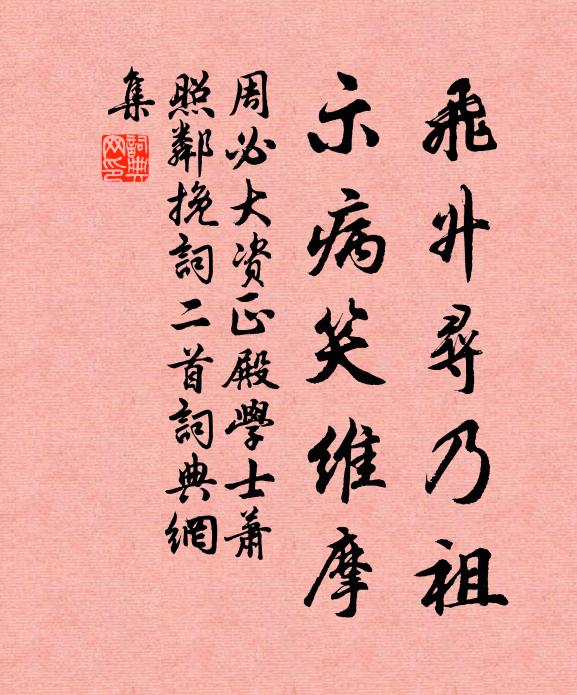 古詩文歷史字典書法欣賞書法字典國語詞典說文解字康熙字典古漢語字典飛升尋乃祖,示病笑維摩周必大 《資正殿學士蕭照鄰輓詞二首》名句出處出自宋代周必大的《資正殿學士蕭照鄰輓詞二首》全文:共政時雖少,同朝日最多。聯鏕趨鶴禁,列饌祝雞窠。平昔顏常好,歸來鬢未皤。飛升尋乃祖,示病笑維摩。名句書法欣賞飛升尋乃祖,示病笑維摩書法作品周必大名句,資正殿學士蕭照鄰輓詞二首名句名句推薦潦倒南泉沒碑記,夜隨流水繞孤村釋慧遠《偈頌一百零二首》短綆何勞人,輕舠恰容客句龍緯《題惠泉寄知軍郎中》豈於喧與靜,趣舍有偏獨王安石《蒙亭》歸來青壁下,又見滿籬霜朱慶餘《山居》王豹復移鄉蕭衍《戲作詩》阪峻身頻偃,崖深首屢回范成大《金山嶺》及物儻在道,卑官亦可為陳造《感事十詩上李侍郎》酒船墮雲錦,歌棹凌瑞霞陳造《馬上見賣白蓮者三首》南朝正佳麗,綺陌多攀玩蘇頌《與諸同僚偶會賦八題秦淮柳》似回首趁行雲張翥《太常引》舊出斑無數,新添白幾莖曾豐《初秋夜嘆》禮曠徒漸汗,情高倍服膺強至《彭九廷評改丞衛首垂臨訪未遂馳賀輒成鄙句少》故疾梅天發,新詩雪夜成周賀《寄寧海李明府》登覽春深日,凝思病後身蘇轍《次韻侯宣城題疊嶂樓》寄言處世者,不可苦剛強白居易《遇物感興因示子弟》詩詞推薦沁園春(用前韻謝魏菊莊)馮取洽〔宋代〕舉世紛紛,風靡波流,名氛利埃。有幽人嘉遁,長年修潔,寒花作伴,竟日徘徊。餐薦夕英,杯迎朝露,世味何如雲根周文璞〔宋代〕雲從會稽生,旦旦見伯禹。聽讀山海經,成龍不成虎。禹命雲歸歟,可向蕺山去。昂昂王內史,眉宇照今古。常在陳橋王安石〔宋代〕走馬黃昏渡河水,夜爭歸路春風裡。指點韋城太白高,投鞭日午陳橋市。楊柳初回陌上塵,煙脂洗出杏花勻。紛紛趙知縣輓詞葉適〔宋代〕僧館經年學,書籤盡日抽。空聞割雞笑,不見化鳧留。瘴月曉還落,蠻雲冷未收。西華夜來雨,淨洗一生愁。滴滴泉錢聞詩〔宋代〕不同瀑布瀉千山,數滴空餘坎井間。端是龍神閟珠味,故教滴滴與人慳。同陳宰黃簿游靈山八首宰雲吾輩可謂忙裡偷閒陳造〔宋代〕我雖裹章服,雅意耕寬閒。著貂可採藥,拄笏或看山。白頭敲榜地,茲游破天慳。有興聊可歌,睡語不受刪。偈頌二十首釋如珙〔宋代〕山中滋味別,往往少人知。野菜合黃獨,能充白日飢。風輕翻草葉,猿重墜藤枝。餘生只寄此,閒讀古人詩。禪人並化主寫真求贊釋正覺〔宋代〕南台之靜,中邑之應。圓明之知,平等之性。爛柯棋局樵,釣雪華亭艇。披叢林明白之襟,握雲水清涼之柄。動自楊柳枝方岳〔宋代〕晴日遊絲亂入簾,夕陽更添酒家簾。粥香飭白清明近,斗挽柔條插畫檐。謝人寄蒙頂新茶文同〔宋代〕蜀土茶稱盛,蒙山味獨珍。靈根托高頂,勝地發先春。幾樹初驚暖,群籃競摘新。蒼條尋暗粒,紫萼落輕鱗。的皪