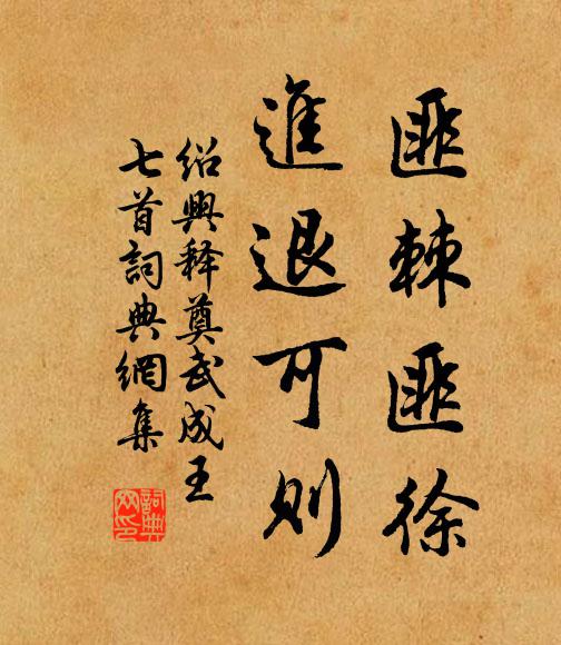 古詩文歷史字典書法欣賞書法字典國語詞典說文解字康熙字典古漢語字典匪棘匪徐,進退可則佚名 《紹興釋奠武成王七首》名句出處出自宋代佚名的《紹興釋奠武成王七首》全文:肅肅廟中,有嚴階墄。匪棘匪徐,進退可則。冕服是務,環佩有節。神之鑑觀,率屐不越。佚名詩詞大全名句書法欣賞匪棘匪徐,進退可則書法作品佚名名句,紹興釋奠武成王七首名句名句推薦是何人敲折,應為節秦謳尹濟翁《一萼紅(和玉霄感舊)》鑒空談荒唐,我天不為此五邁《辛未中元記夢夢與一僧談世事良久問答中有凡》沙漠黓地古戰場,寸草不生地皮赤李廌《作塞上射獵行》決江一支溉數州,至今禾黍連雲種陸游《離堆伏龍祠觀孫太古畫英惠王像》每還舊舍覺荒陋,草樹雖添漫稠雜張鎡《撤移舊居小假山過佳隱》一陣西風雨中過,溪頭笑語隴頭聞舒坦《蘆山寺》列戟門庭掃蹤跡,只應飛矢亦潛來鄒浩《參寥示簡元規詩用其韻寄之》華發天邊老,微陽樹底回黃彥平《送黃司錄》昨夜冰花猶作柱,曉來梅子已生人蘇軾《和錢四寄其弟龢》泉噴石間嚴涌雪,霧浮堤外柳吹花許存我《次韻吳叔廉山村》人言老去不如初,我愛初心老轉無陳傅良《除夜宿處州天寧寺》蓬矢重逢三八日,椿齡再祝一千秋潘牥《壽士人》共助成王朝太室,慚非史佚奉明禋范祖禹《和錢穆父尚書蔣穎叔侍郎從駕景靈宮二首》曉殿鳴檐急,群公罷食回梅堯臣《集英殿賜百官宴以雨放》清鏡燭無鹽,顧慚西子妍李白《答族侄僧中孚贈玉泉仙人掌茶》詩詞推薦奉和幸韋嗣立山莊侍宴應制武平一〔唐代〕三光回斗極,萬騎肅鉤陳。地若游汾水,畋疑歷渭濱。圓塘冰寫鏡,遙樹露成春。弦奏魚聽曲,機忘鳥狎人。築岩轆轤體周文璞〔宋代〕野人無事時,常誦極玄時。寫遍千山寺,吟行九曲溪。誰為補天手,同是決雲兒。欲去無人問,今霄醉似泥。終南望余雪祖詠〔唐代〕終南陰嶺秀,積雪浮雲端。林表明霽色,城中增暮寒。詠春色楊衡〔唐代〕靄靄復濛濛,非霧滿晴空。密添宮柳翠,暗泄路桃紅。縈絲光乍失,緣隙影才通。夕迷鴛枕上,朝漫綺弦中。促駟舟中簡祖顯章甫〔宋代〕散發扁舟上,秋江一段清。魚肥新入饌,鷗狎舊同盟。浦樹參差出,雲山遠近迎。君詩妙圖寫,不減謝宣城。壽狄知錄陽枋〔宋代〕熟讀周官知幾冬,染人袍就彩絲疑,家當永日三三夏,數應西岷六六峰。囚放盡言公活汝,民期無復鼠穿墉。題坡公贈鄭介夫詩三首劉克莊〔宋代〕玉座見圖嘆,累累菜色民。如何崔白輩,只寫蔡奴真。送友人歸江南聶夷中〔唐代〕泉州五更鼓,月落西南維。此時有行客,別我孤舟歸。上國身無主,下第誠可悲。湖南道中三首王阮〔宋代〕失腳南來又兩年,故山猿鶴只悽然。瀟湘不是無佳景,終覺壺中別有天。觀易元吉獐猿圖歌秦觀〔宋代〕參天老木相樛枝,{上山下欺}空怪石銜青漪。兩猿上下一旁掛,兩猿熟視蒼蛙疑。蕭蕭叢竹山風吹,海棠杜宇相