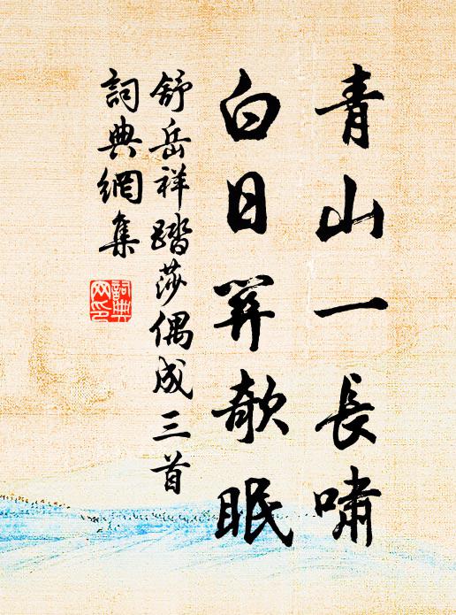 古詩文歷史字典書法欣賞書法字典國語詞典說文解字康熙字典古漢語字典青山一長嘯,白日關欹眠舒岳祥 《踏莎偶成三首》名句出處出自宋代舒岳祥的《踏莎偶成三首》全文:玉宇浮叢雁,黃槐帶化蟬。青山一長嘯,白日關欹眠。機斷蟲虛織,囊空蘚疊錢。去年真可怕,戎馬暗山川。名句書法欣賞青山一長嘯,白日關欹眠書法作品舒岳祥名句,踏莎偶成三首名句名句推薦青衿朋友子當戶魏了翁《嘉泰二年題資州醮壇山星斗閣對是同王資州賈》遊子東南來,自宛適京國李白《酬坊州王司馬與閻正字對雪見贈》恭惟程伯子,無紹孔門真方回《送張古心明道山》莫嘲野餉蕭條甚,箭茁蓴絲亦粗供陸游《耕罷偶書》羨君不浪出,悔我今空還戴栩《寄題林上舍真意堂用其元和淵明韻二首》薄倖三生今老矣,無夢到,那溫柔舒頔《江城子 歌者張氏,戴仲德仲本時以茶謁其家》柳招追綠渡,梅引逐香蹊徐僑《初晴出南山過西湖往九峰復飲於湖光》龜紫看孫曾,鶴髮何須鑷洪适《生查子(姚母壽席,以龜游蓮葉杯酌酒)》可憐雞瑟縮,倖免鼠睢盱趙蕃《冬日雜興》寶刀近出日本國,越賈得之滄海東歐陽修《日本刀歌》所憐如許節,不耐雪霜寒葉紹翁《賦葛天民栽葦》欲渡巨少,必假方舟釋道如《偈三首》何草青青不漸黃,班姬悲扇語淒涼衛宗武《和黃山秋吟》龍欲出時山吐氣,黑雲隨手暗江南謝驛《軍峰》年窮歲盡,有可言,東村王老夜燒錢釋師觀《偈頌七十六首》詩詞推薦碧泉興作即事有感因續魏武之詩胡宏〔宋代〕對酒當歌,人生幾何。往者如江,來者如何。往來無盡,弗移弗那。奉身理物,何少何多。天長地久,我生靡它。碧桃花歌為王丞作戴表元〔宋代〕君不見孔家藏書屋,屋壞猶聞起絲竹。又不見鄭家注書老,書帶後來垂作草。如今王家萬卷文字林,桃花一樹春沈江南喜逢蕭九徹因話長安舊遊戲贈五十韻(見才調集)白居易〔唐代〕憶昔嬉遊伴,多陪歡宴場。寓居同永樂,幽會共平康。師子尋前曲,聲兒出內坊。花深態奴宅,竹錯得憐堂。庭晚頌古二十六首釋嗣宗〔宋代〕象外橫該宇宙身,聖凡極盡不容塵。衲僧意氣合如此,當場誰是奪標人。武刃丞宅同朴翁詠牽牛姜夔〔宋代〕青花綠葉上疏籬,別有長條竹尾垂。老覺淡妝差有味,滿身秋露立多時。海棠劉望之〔宋代〕平山堂下花無數,看到海棠春好處。東君用意惱風光,遲日放開陰勒住。殘鶯雍裕之〔唐代〕花闌鶯亦懶,不語似含情。何言百囀舌,唯餘一兩聲。妙庭觀祝鑄〔宋代〕石磴飛橋轉古壇,鐘聲敲斷水雲寒。道人不復夸盤鼎,自得心傳養內丹。風雨連山松竹鳴,宦途牢落若為情。中宵謝答聞善二兄九絕句黃庭堅〔宋代〕未嘗頃刻可去酒,無有一日不吟詩。詩狂克念作酒聖,意態忽如少年時。寶豐倉秋納三首孔武仲〔宋代〕彩籌森列羽門兵,袞袞招呼不斷聲。歲計自當平斗甬,年豐今況有坻京。爭先雜沓人何冗,應物逍遙我自清。白日